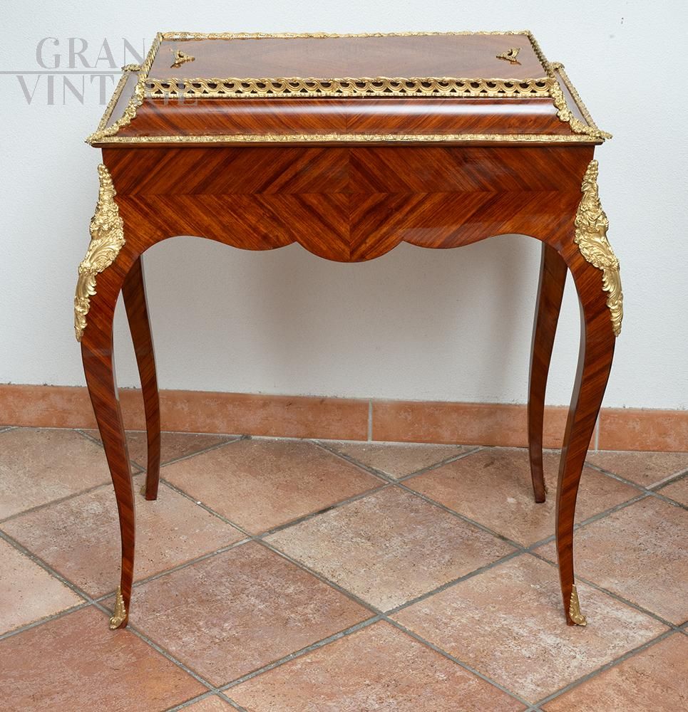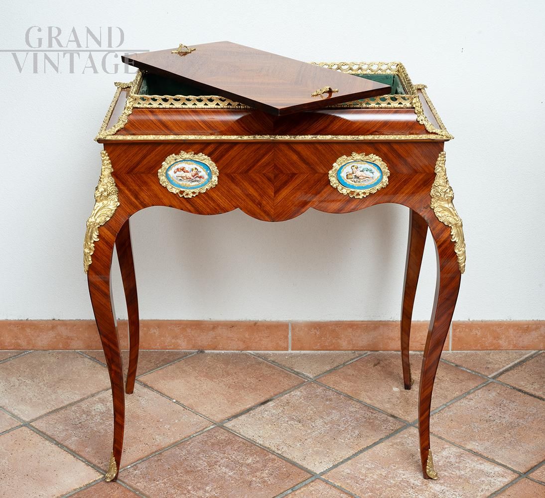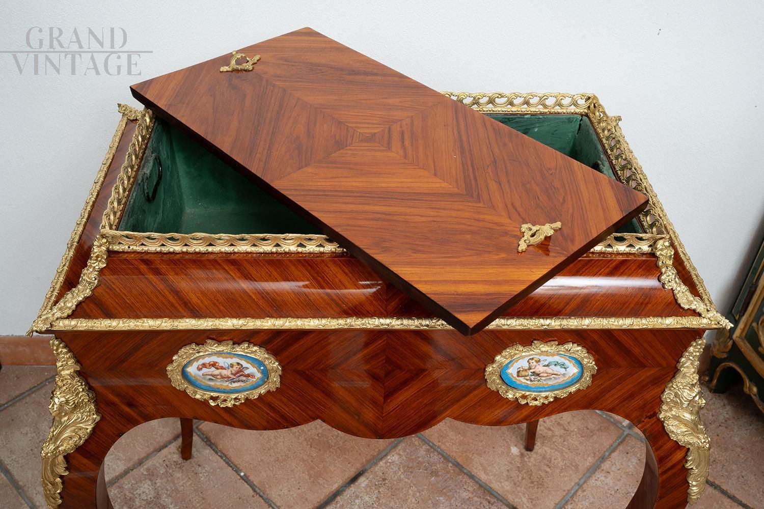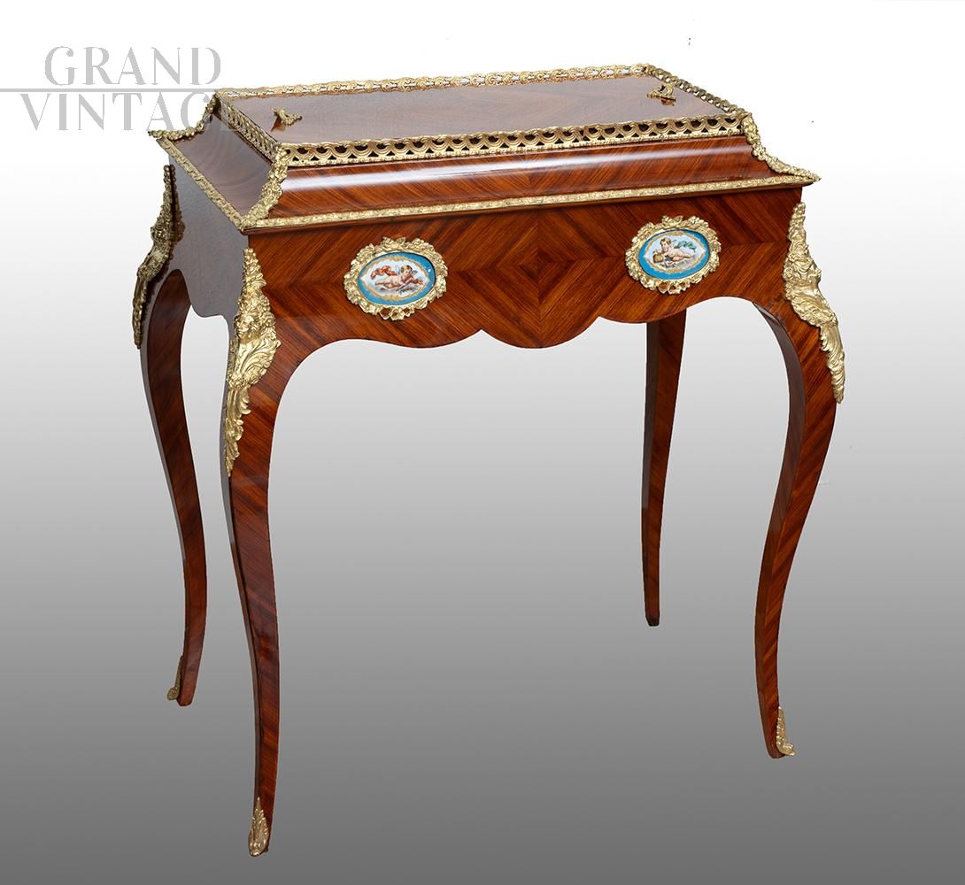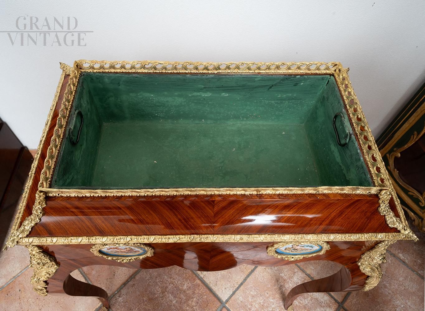 Tavolino con vano fioriera antico di epoca Napoleone III Francese in legno esotico pregiato con innesti di placche in porcellana di Sèvres. Il piano è removibile tramite due maniglie in bronzo dorato all'interno della quale si trova una vaschetta in zinco a tenuta stagna. La fascia sottopiano è impreziosita dalla presenza di due placche in porcellana di Sèvres raffiguranti putti alati. I quattro piedi hanno il classico andamento a cabriolet adornati sui quattro angoli dalla presenza di mascheroni in bronzo dorato finemente cesellato.
