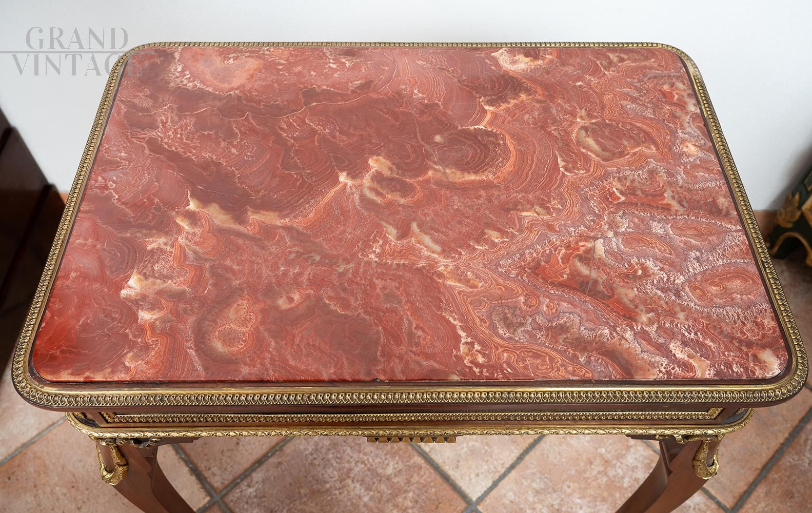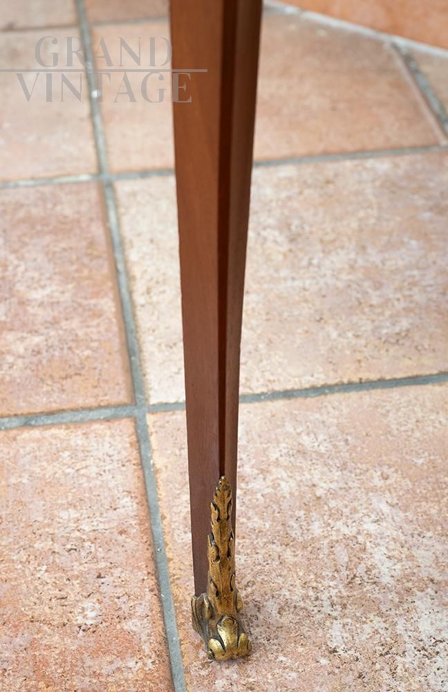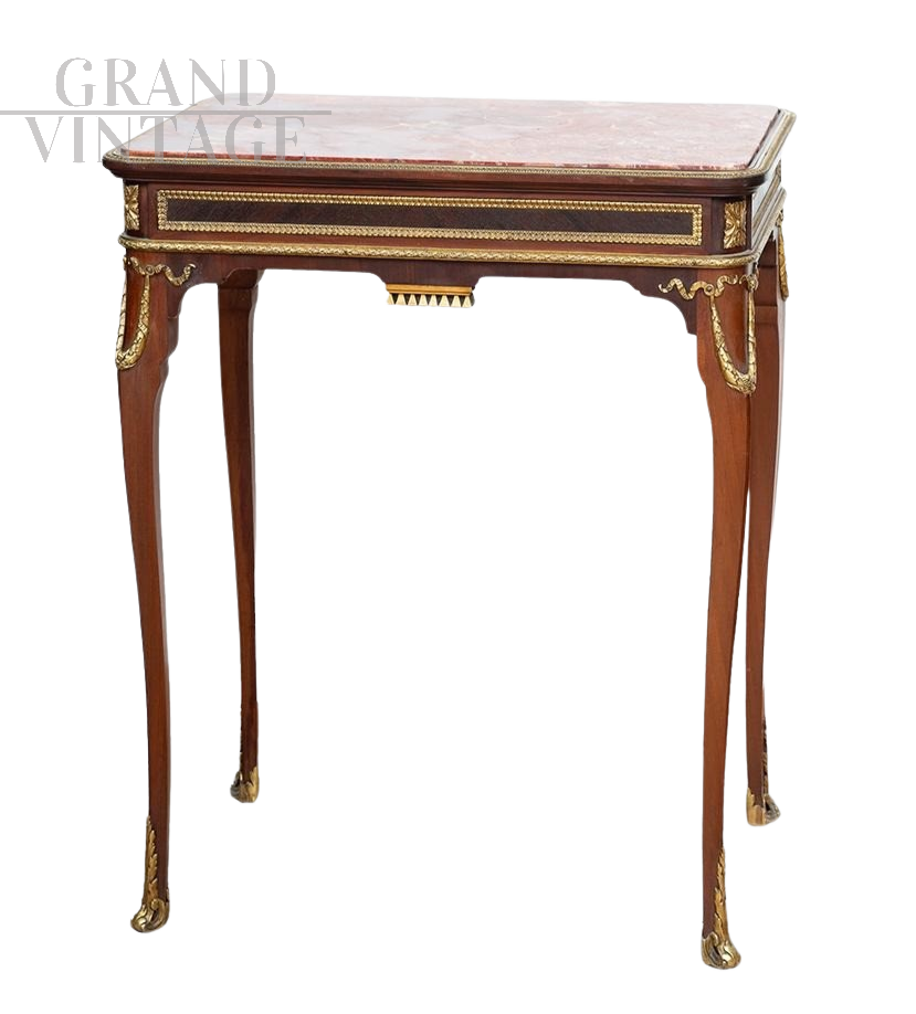 Tavolino da appoggio antico Napoleone III Francese in massello di mogano con piano in marmo rosso diaspro di Sicilia. Il piano in marmo è contornato da una guarnitura in bronzo dorato finemente cesellato. I quattro piedi a cabriolet sono arricchiti da una ghirlanda sulla parte alta e dai calzini in bronzo nella parte bassa. La fascia sottopiano è arricchita da una fitta guarnitura in bronzo dorato finemente cesellato.