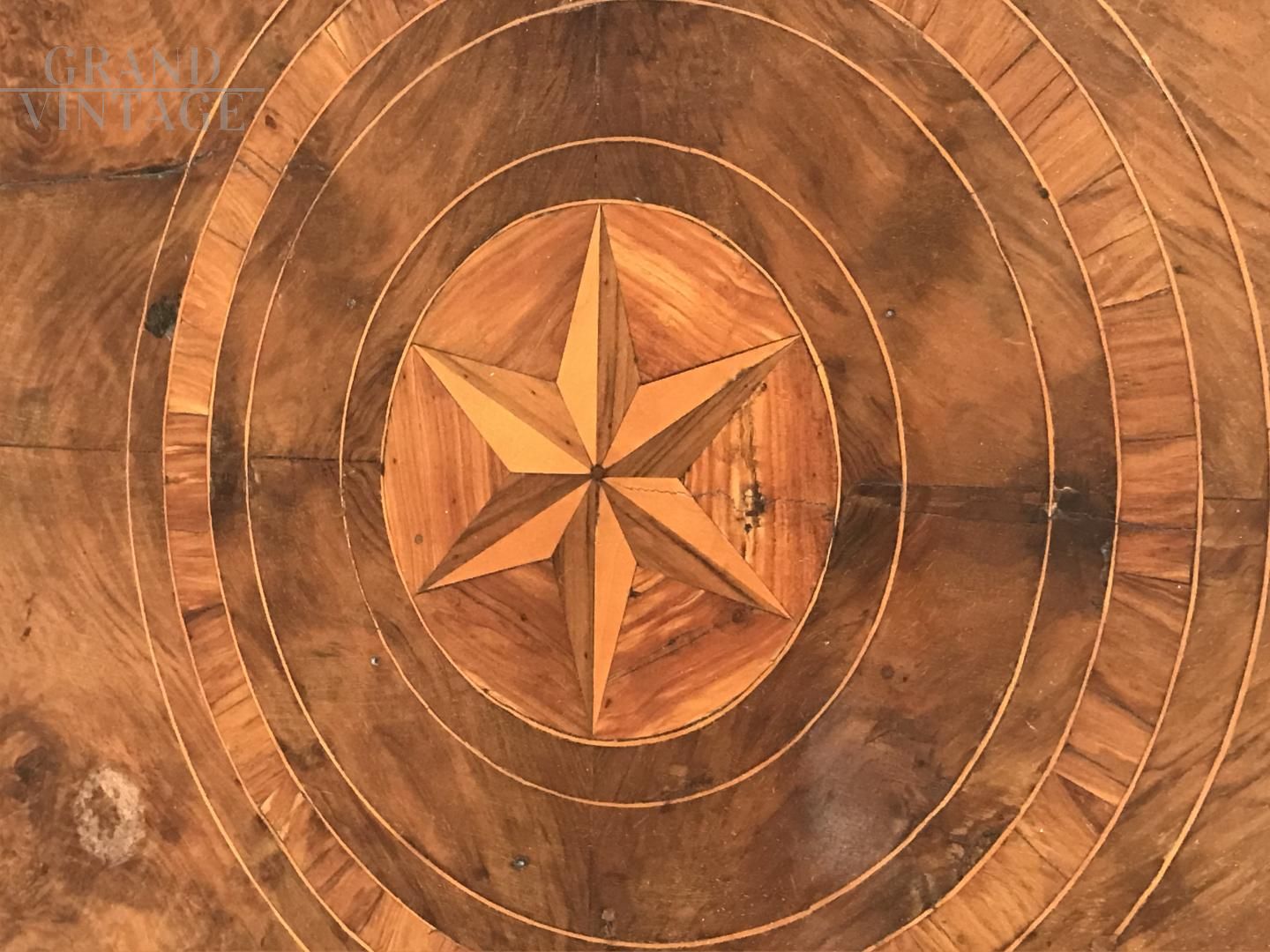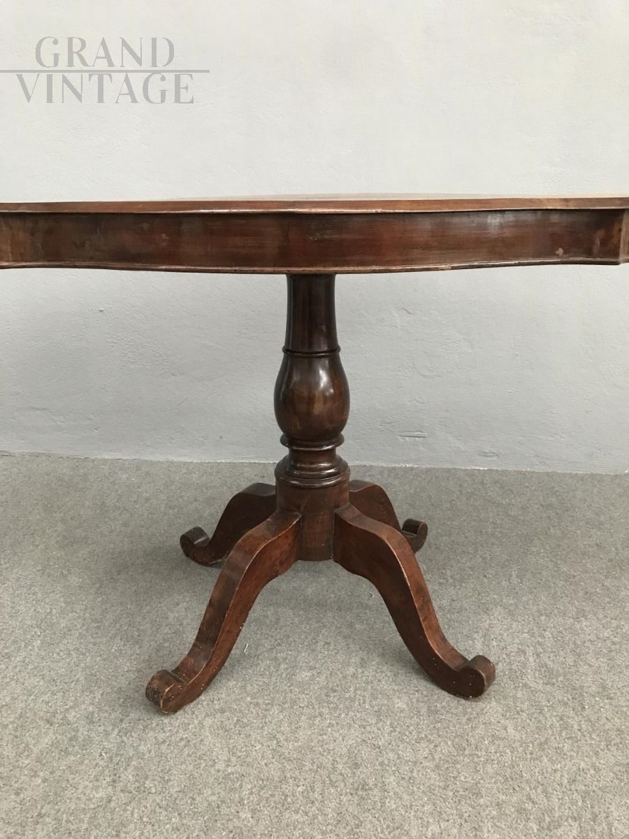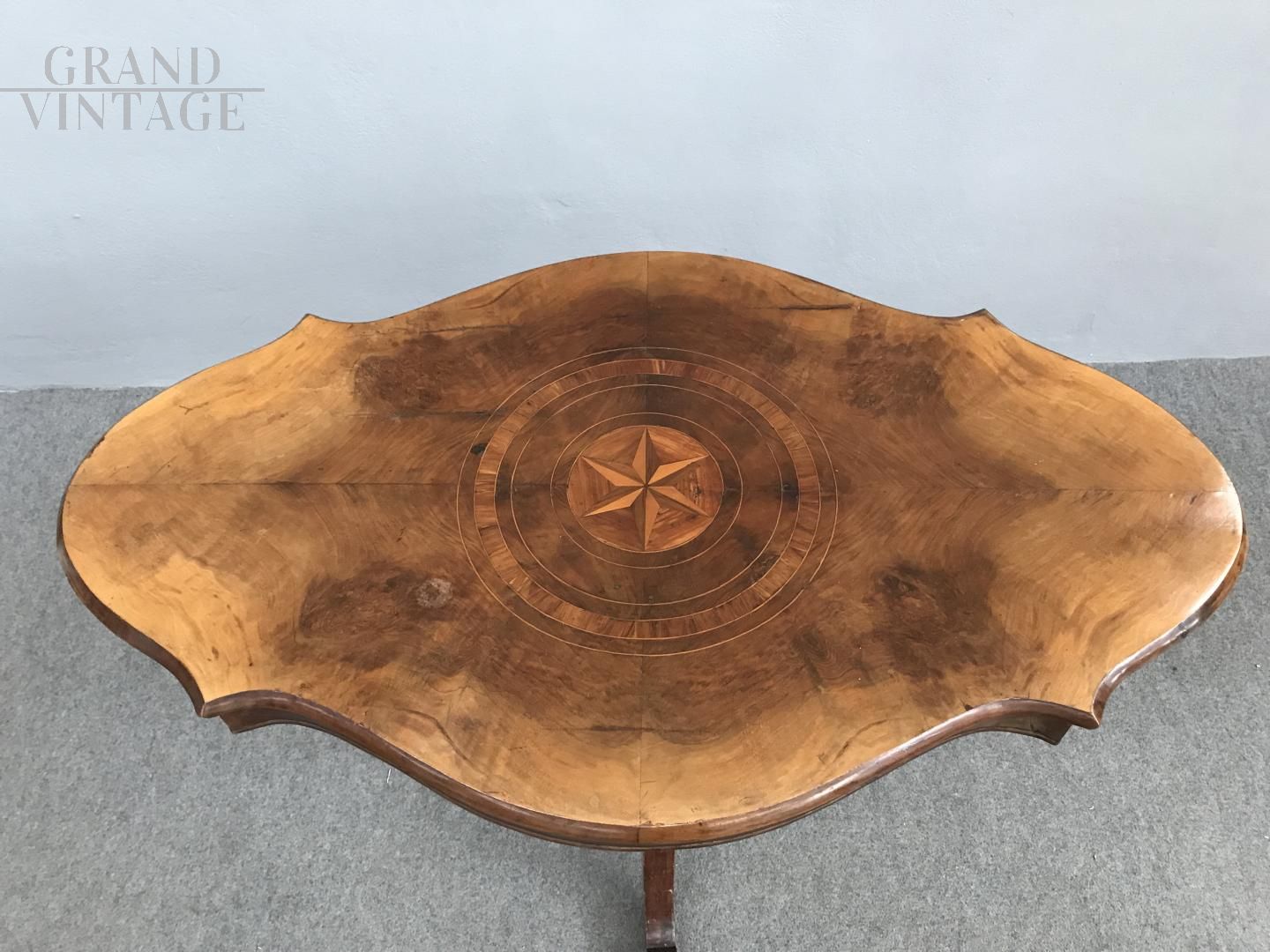 Tavolino antico ovale a biscotto in noce, gamba centrale tornita, piano in radica di noce e intarsio centrale, epoca '800.