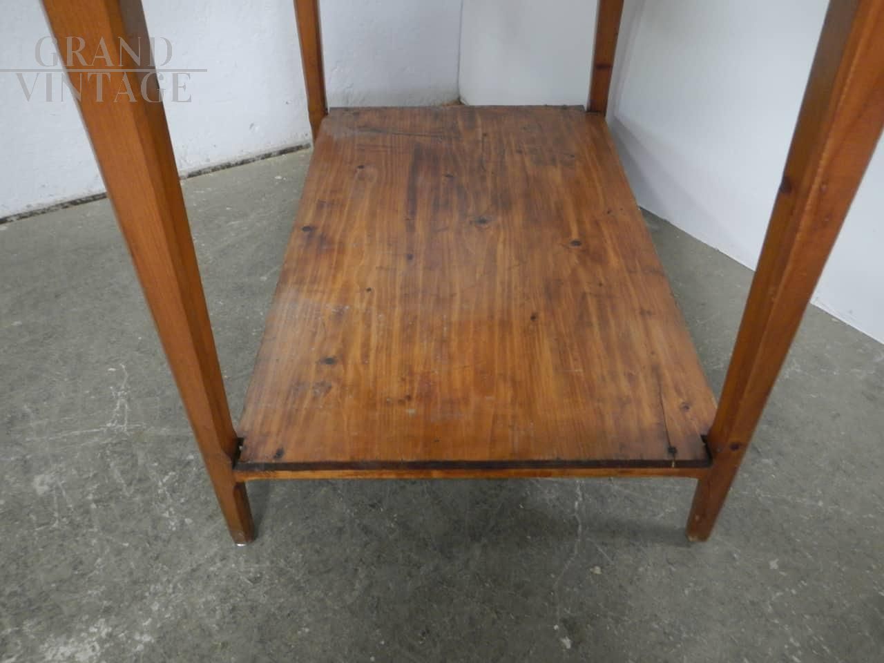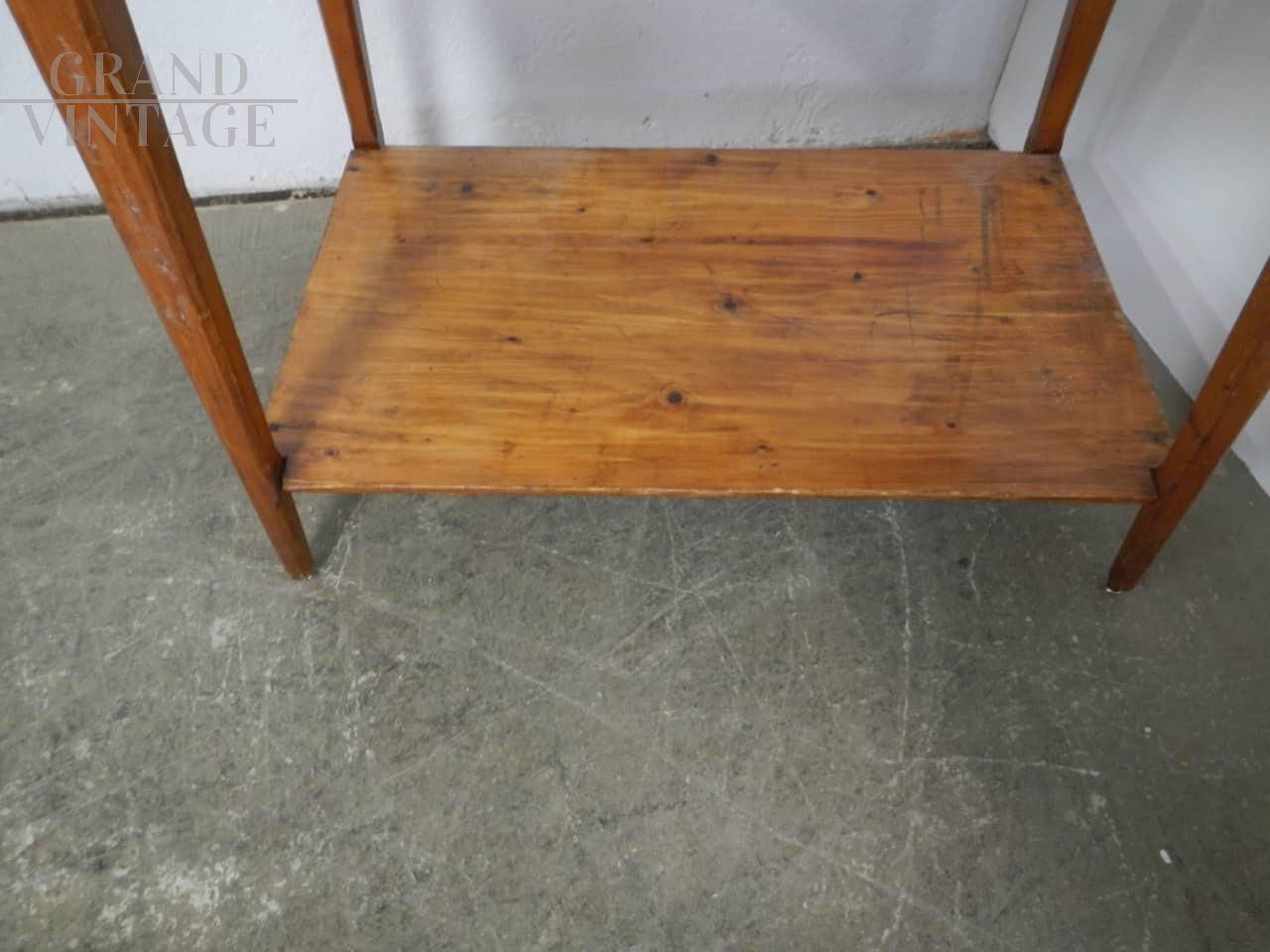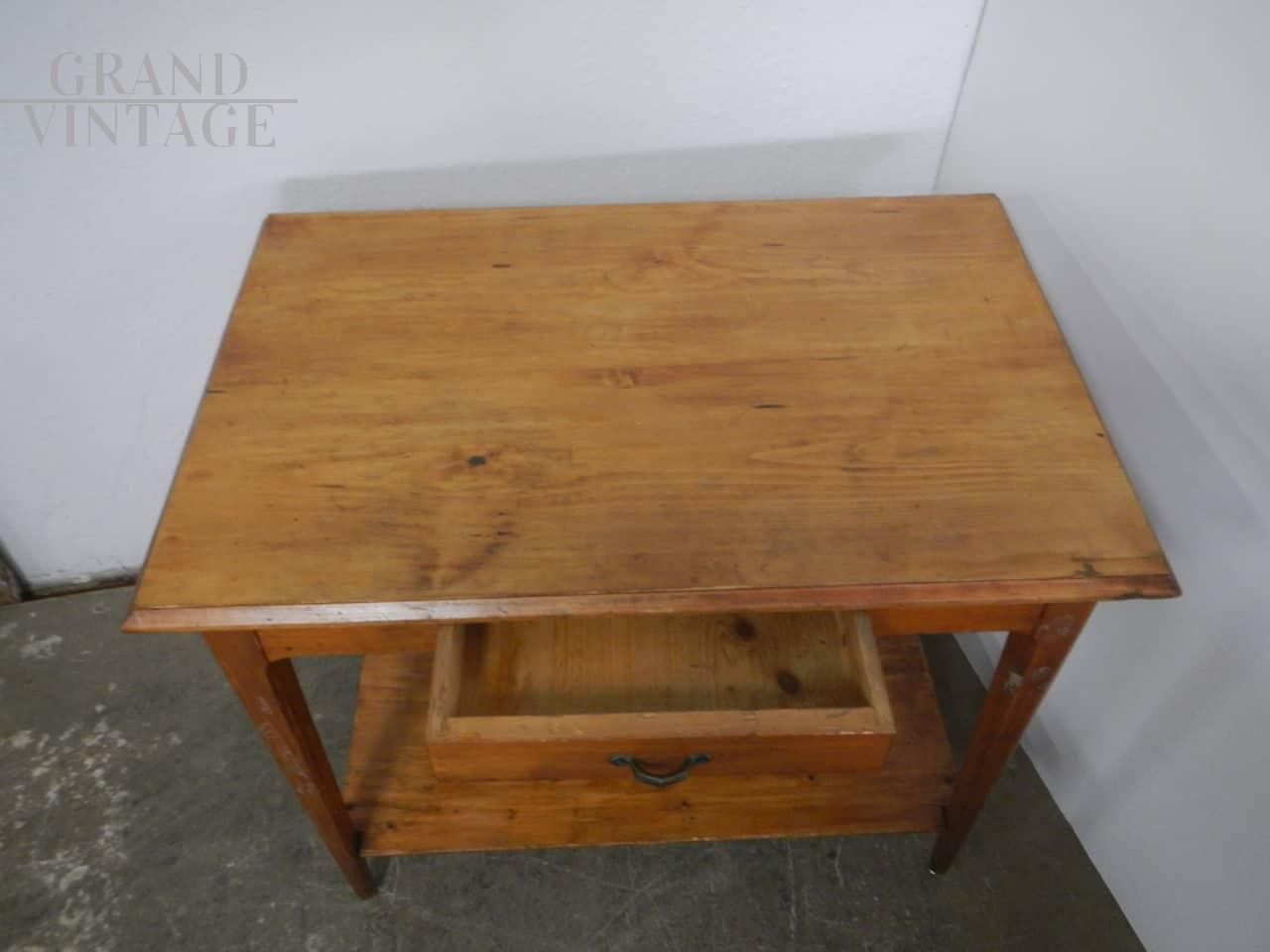 Tavolino banchetto o scrittoio vintage in abete naturale con ripiano e un cassetto di cm 35 x 47 x h 6. Lo spazio inferiore in altezza è di cm 50.