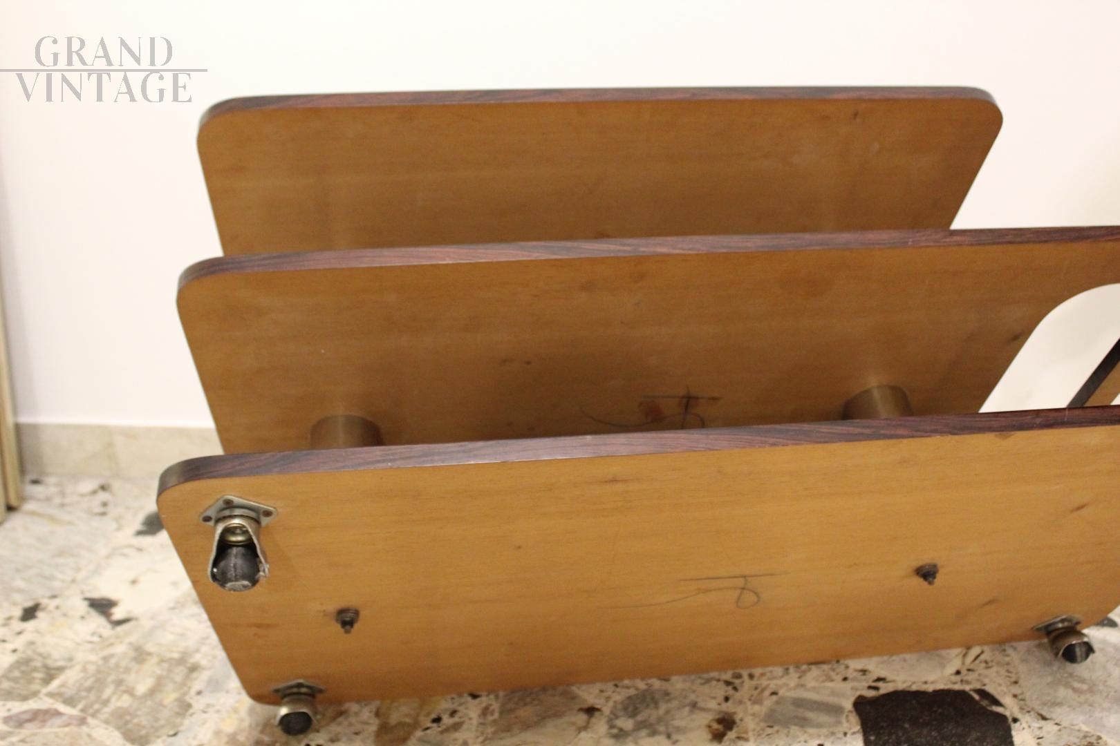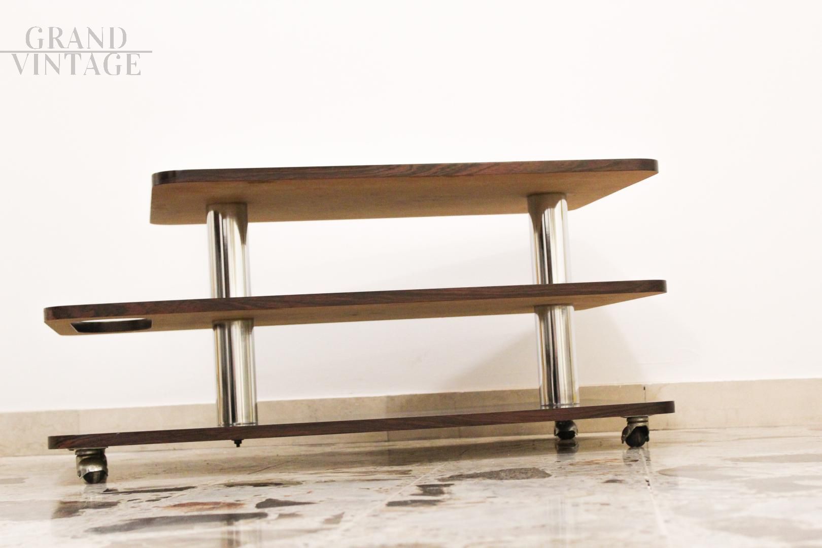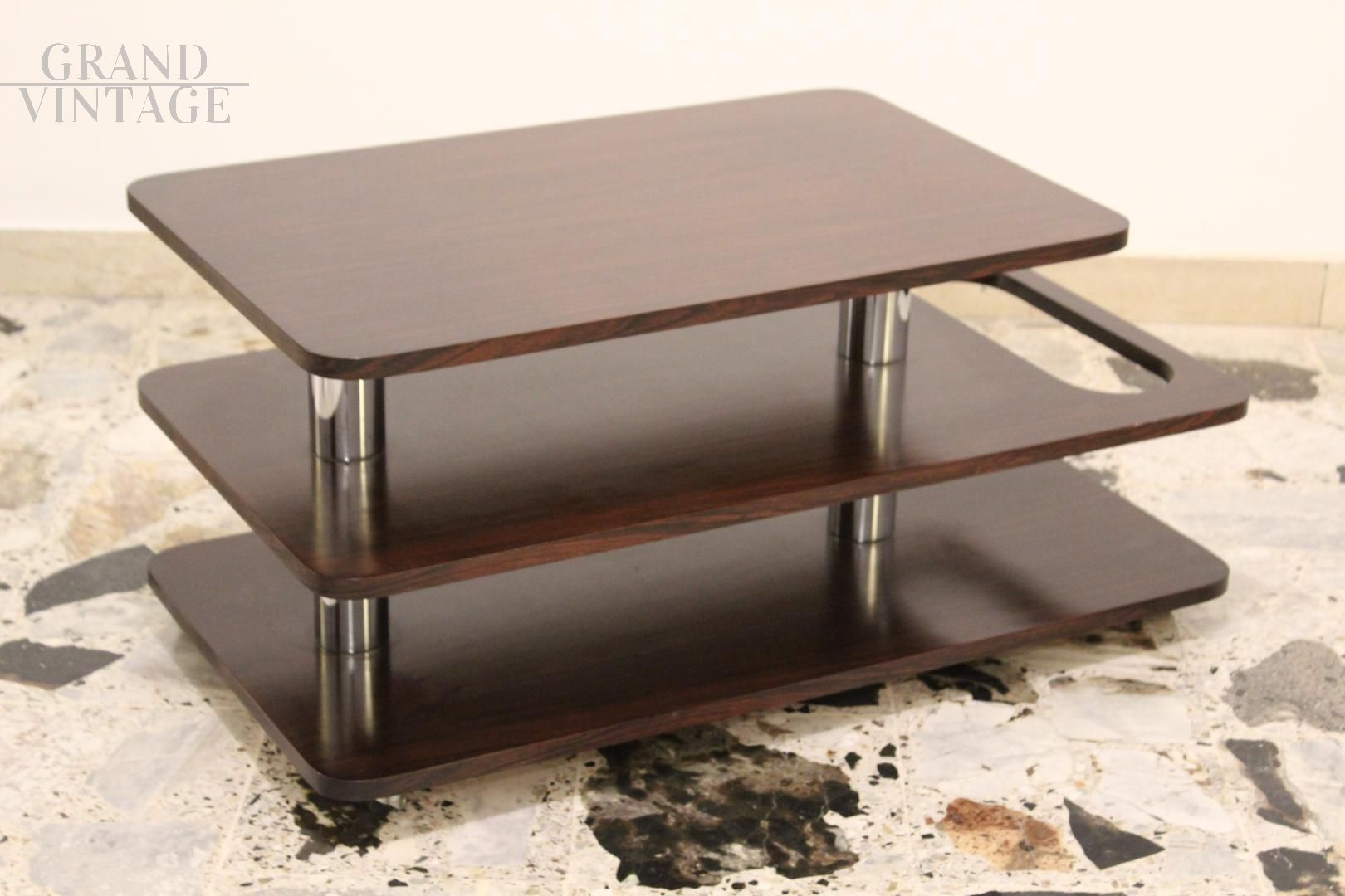 Tavolino basso carrello bar vintage anni '70, con struttura in metallo cromato e tre piani in laminato di palissandro, modernariato italiano.