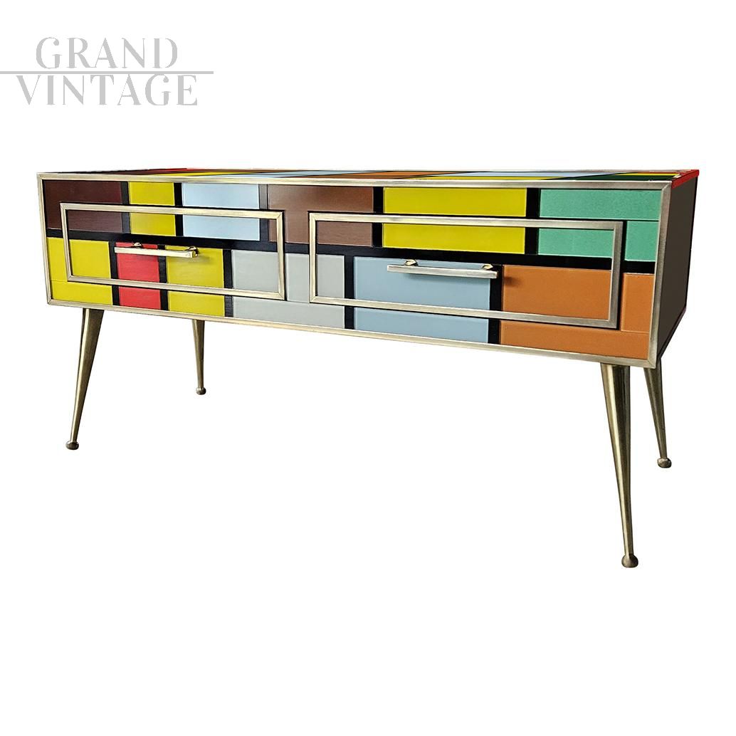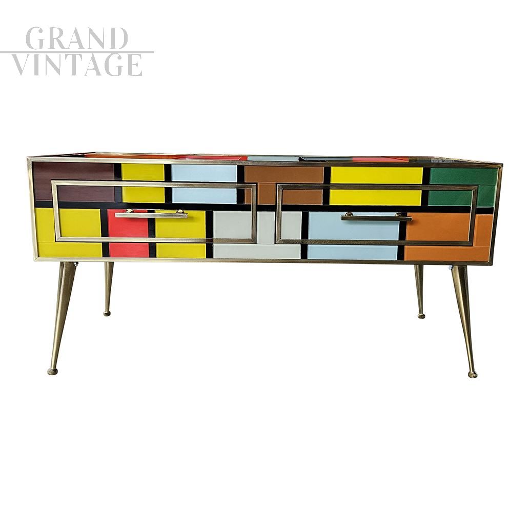 Tavolino basso completamente realizzato a mano, con struttura in legno, ricoperta in vetro colorato. Profili, maniglie e piedi in ottone dorato.