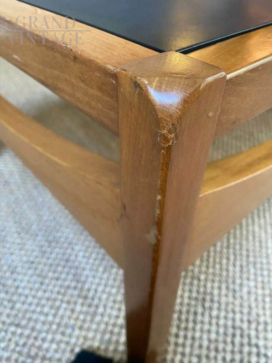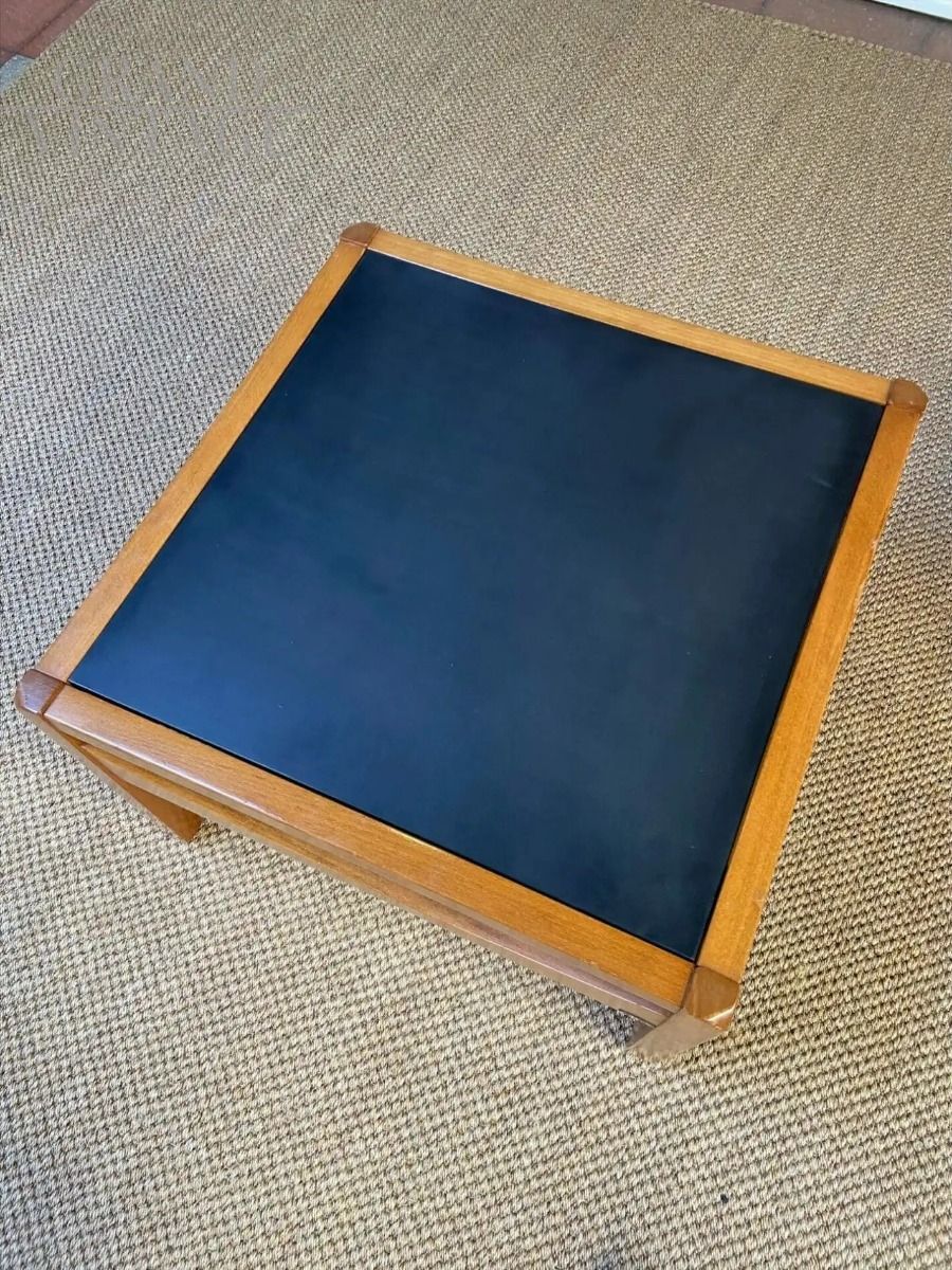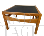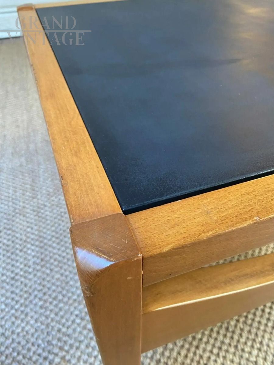 Tavolino da salotto Baumann France in legno di frassino con piano quadrato rivestito in pelle nera, completo di marchio sulla struttura, Francia anni '80, in buone condizioni, presenta i naturali segni del tempo sull struttura.