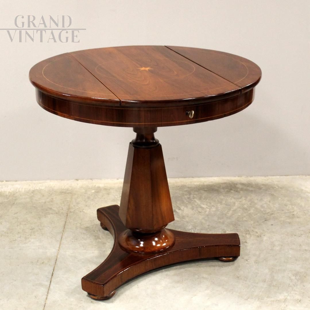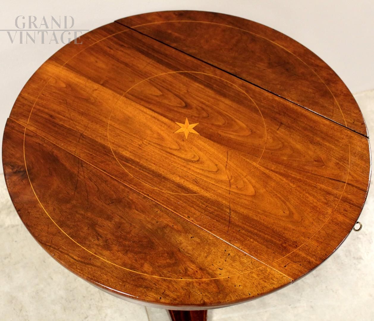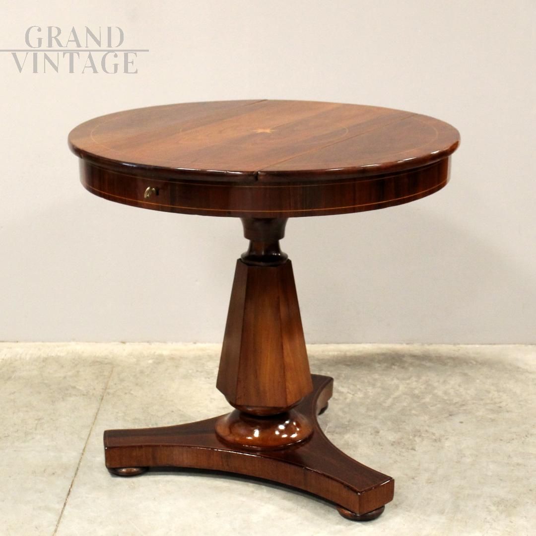 Tavolino da appoggio antico con piano rotondo e gamba centrale, di epoca Carlo X, realizzato in noce con intarsi e filettature in legni pregiati, Italia - Lombardia della prima metà dell'800, restaurato.