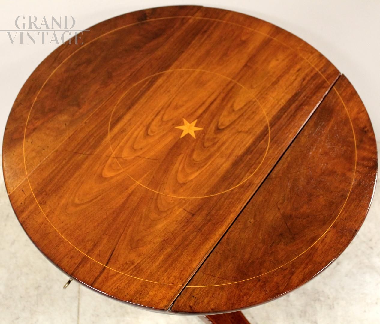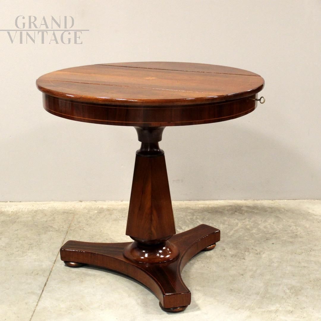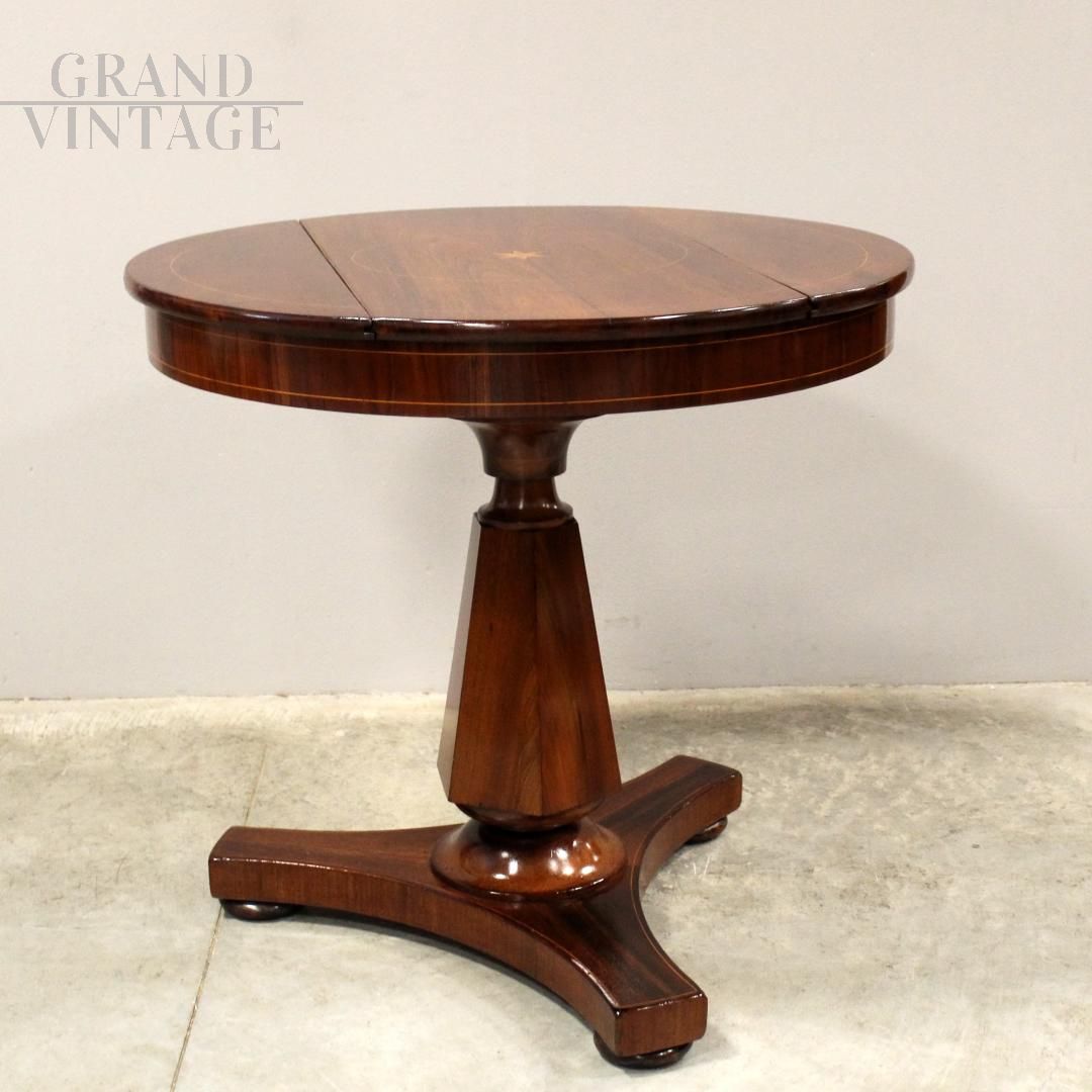 Tavolino da appoggio antico con piano rotondo e gamba centrale, di epoca Carlo X, realizzato in noce con intarsi e filettature in legni pregiati, Italia - Lombardia della prima metà dell'800, restaurato.