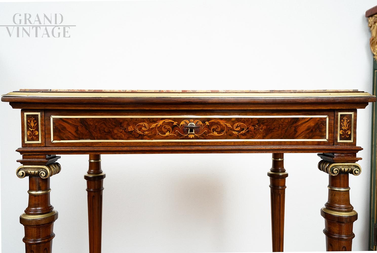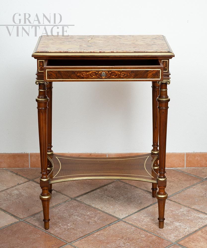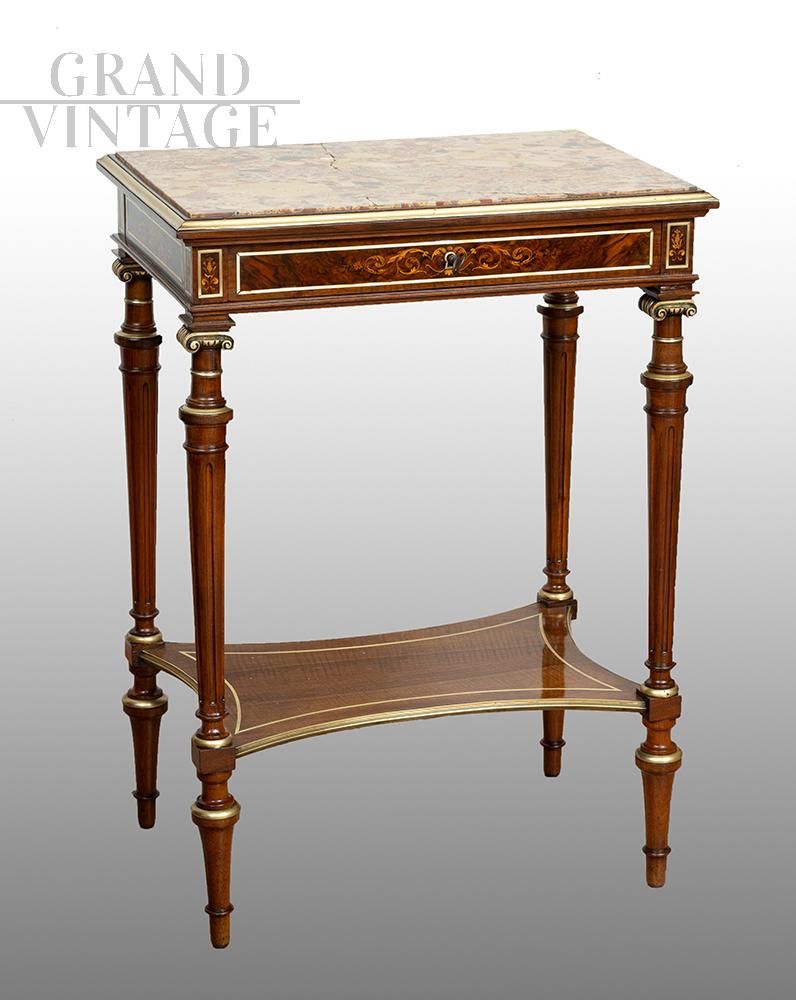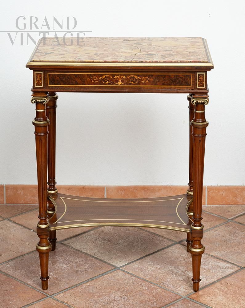 Tavolino antico Napoleone III Francese in massello di mogano con piano in marmo breccia. I quattro piedi torniti sono collegati da una crociera e presentano nella parte alta un capitello in bronzo dorato. Il piano in breccia poggia su una fascia sottopiano interamente intarsiata a motivi fogliacei con al centro un cassetto. Tutta la filettatura è in bronzo dorato. Restaurato da maestri artigiani con metodo tradizionale gommalacca e alcool fatto a mano.