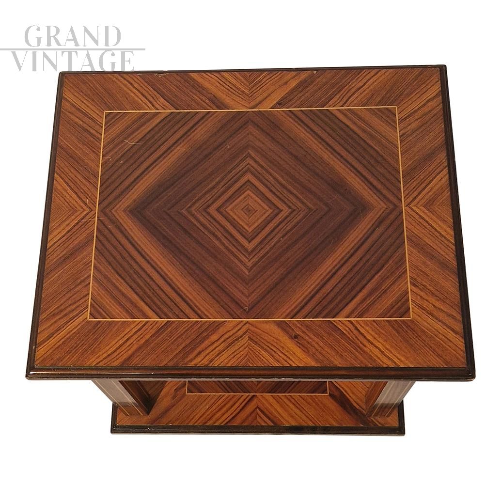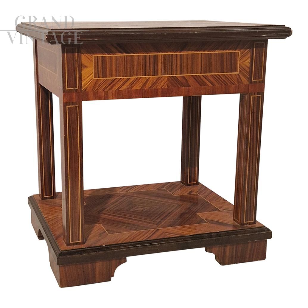 Antico tavolino da salotto o da appoggio o comodino in stile lombardo antico, realizzato in noce con filettatura in acero e intarsi geometrici in legni di noce, bois de rose e legno ebanizzato.