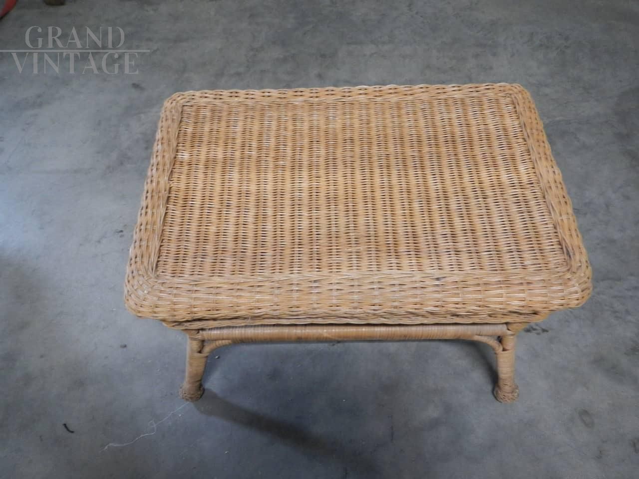 Piccolo tavolino vintage da appoggio in bamboo e rattan intrecciato con buone rifiniture. Il piano è in compensato ricoperto da rattan intrecciato, questo rende il tavolino stabile e resistente. In buone condizioni.
