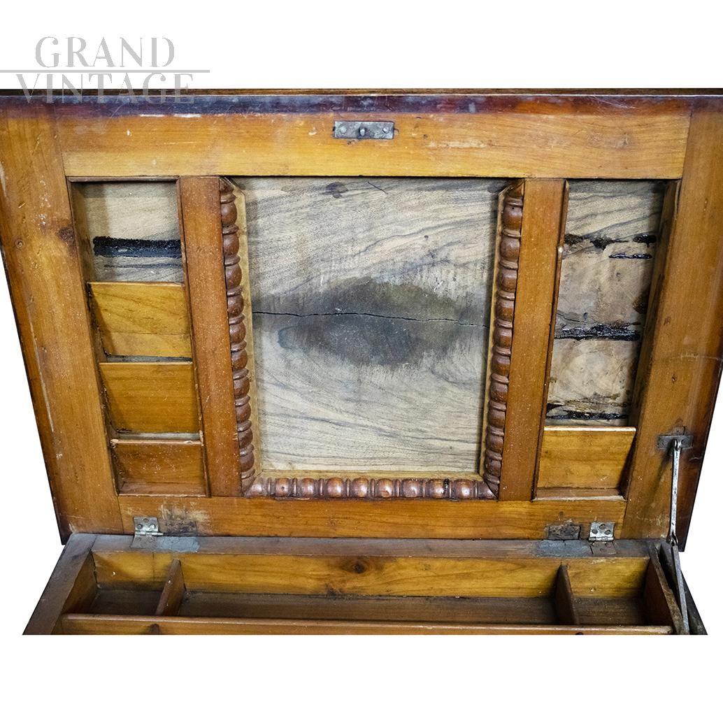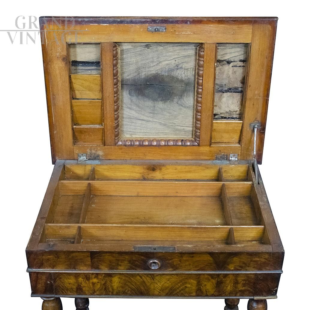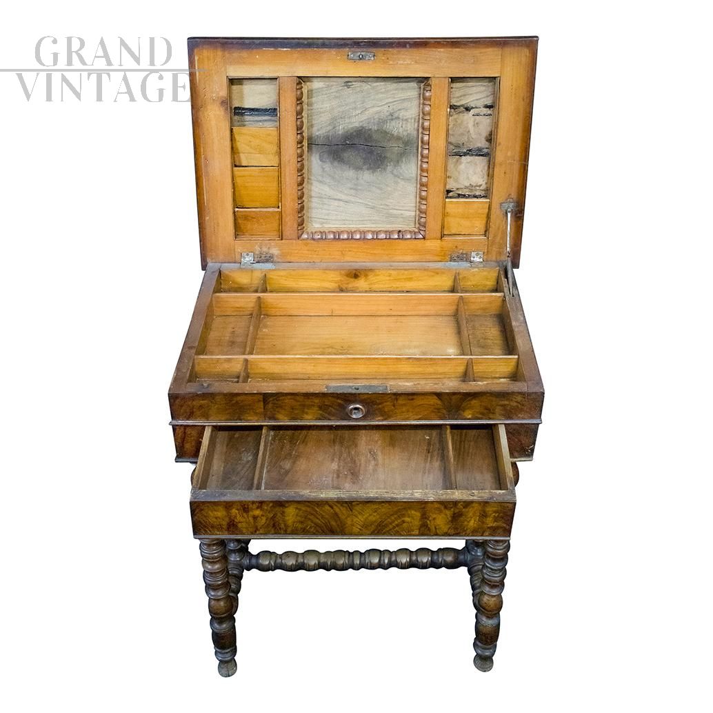 Tavolino da lavoro originale del XIX Secolo, realizzato in legno massello con lavorazioni ad intaglio sul perimetro del piano a ribalta e sugli elementi di appoggio. Il vano contenitore, chiuso dal piano di lavoro, presenta delle partizioni interne; al di sotto di questo vano è collocato un cassetto frontale anch'esso con partizioni interne.