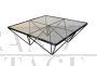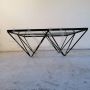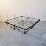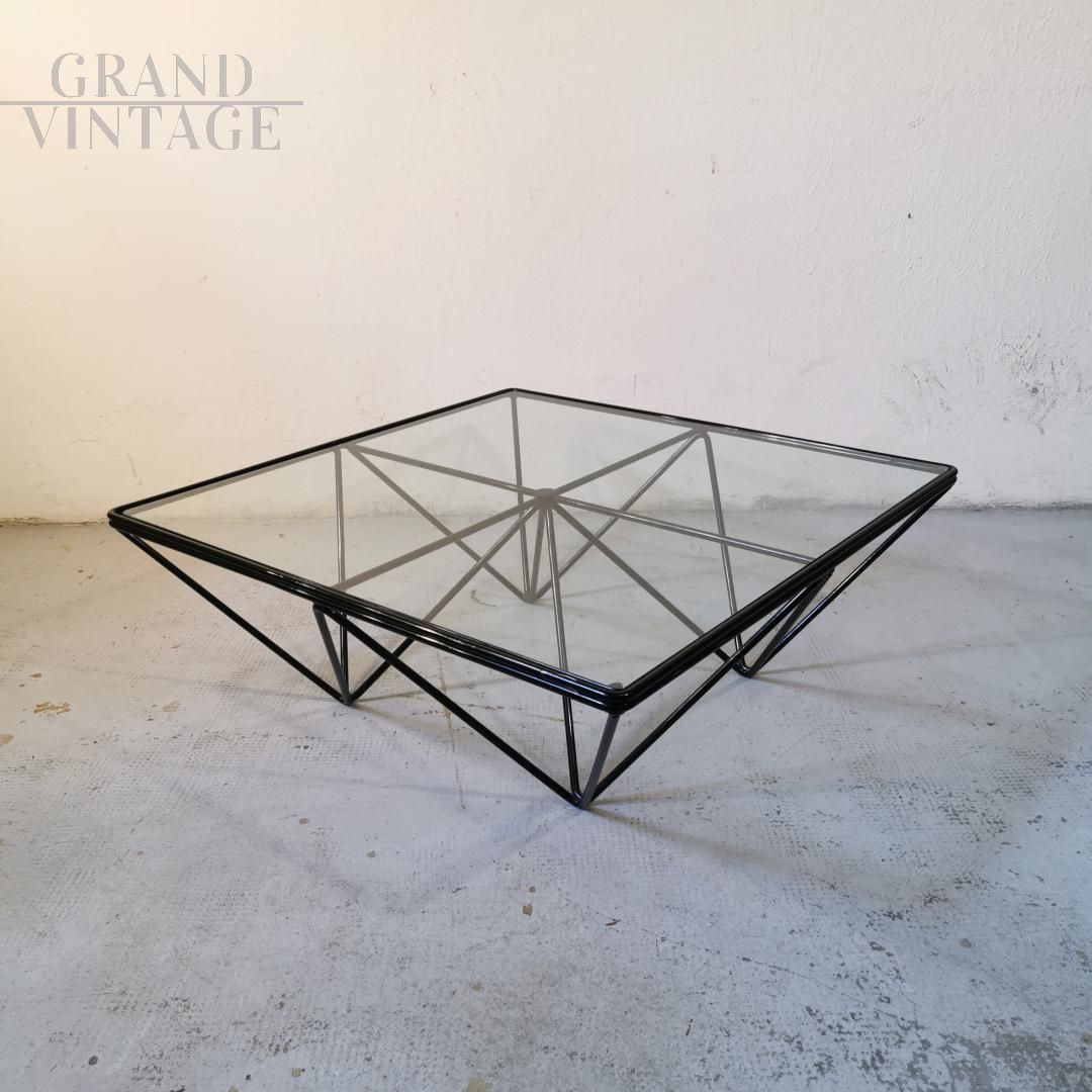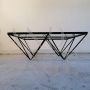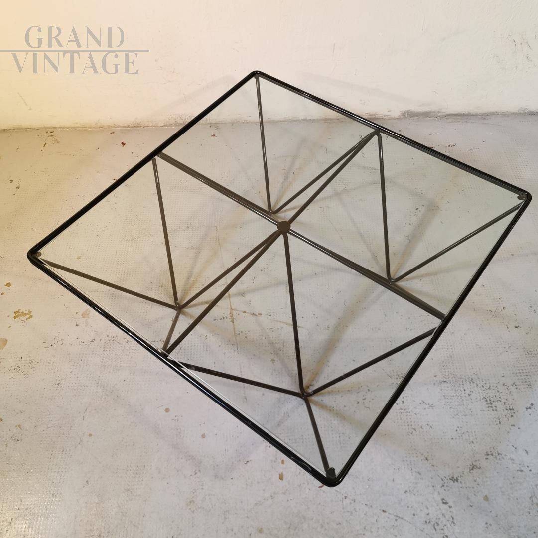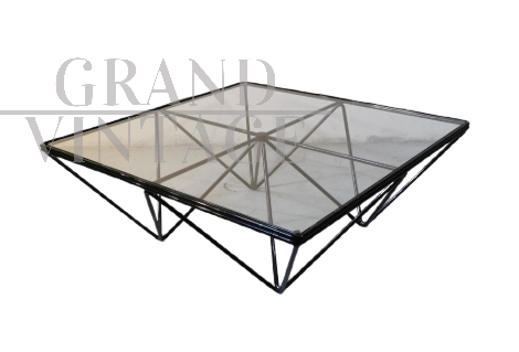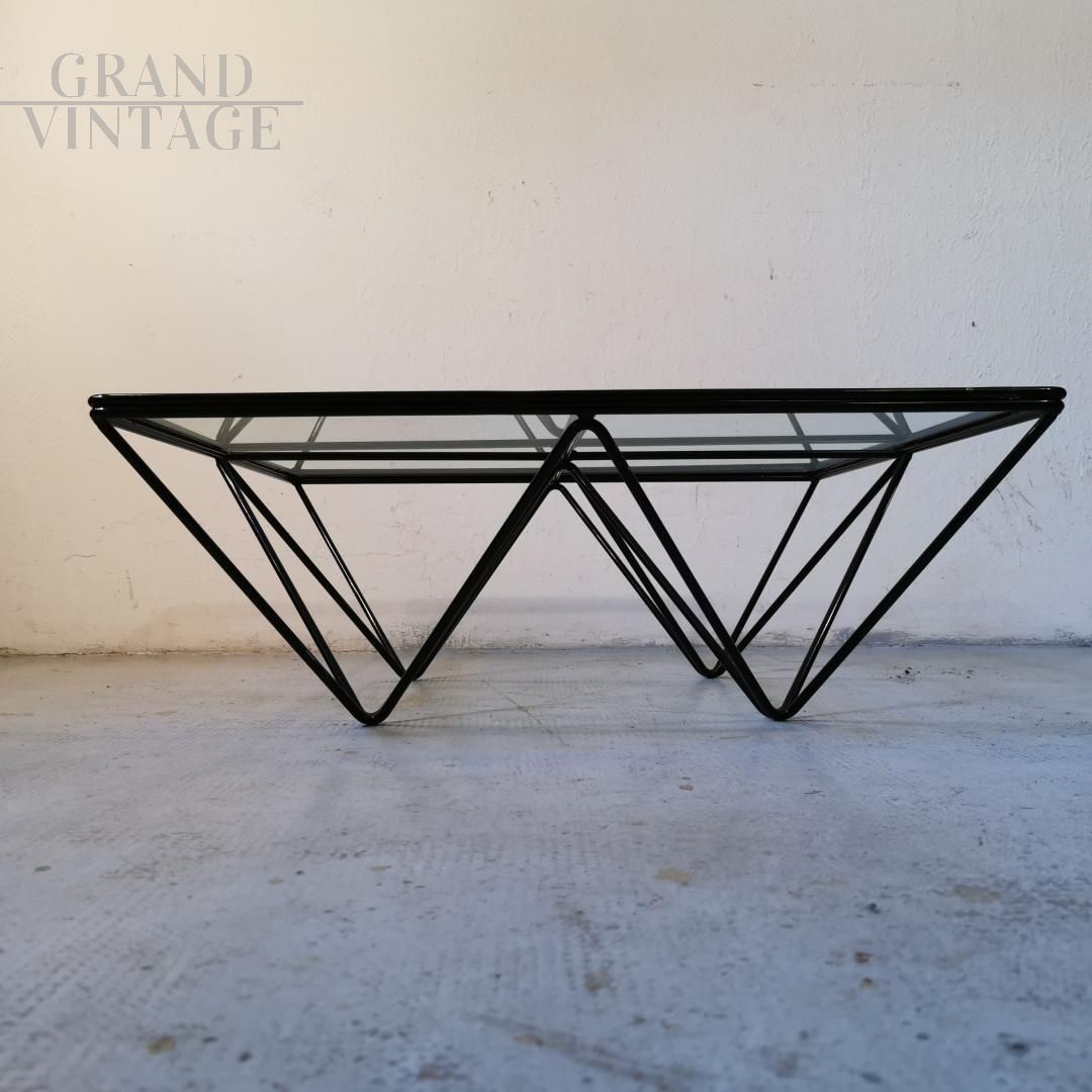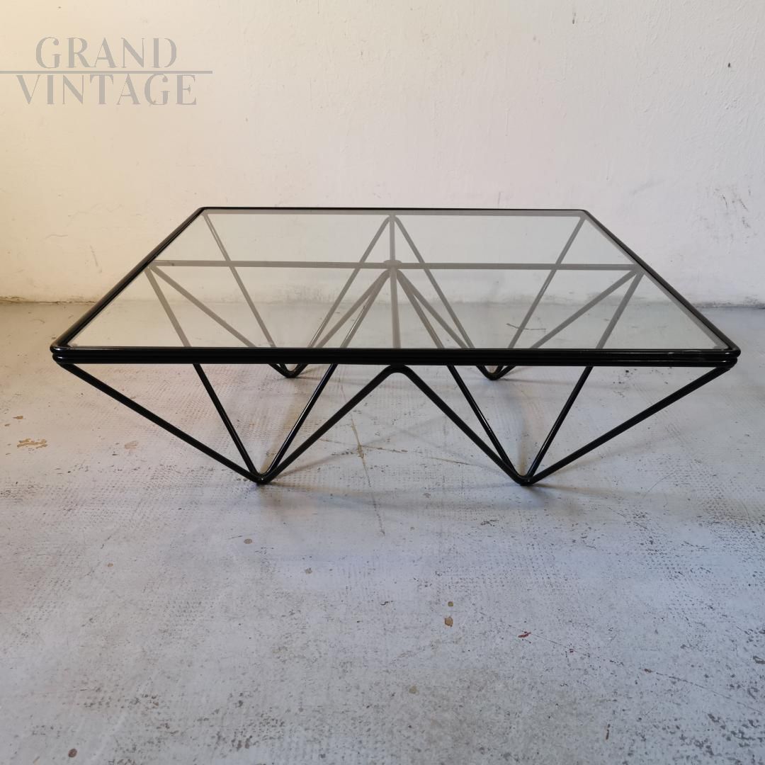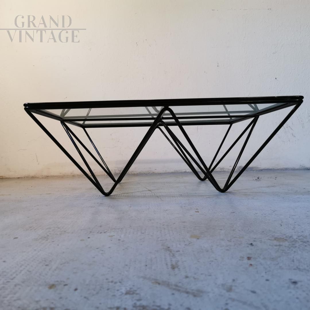 Tavolino basso di Paolo Piva modello Alanda originale, con tipica struttura in acciaio a piramidi rovesciate color nero lucido, piano in vetro originale, in ottime condizioni.