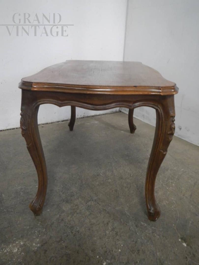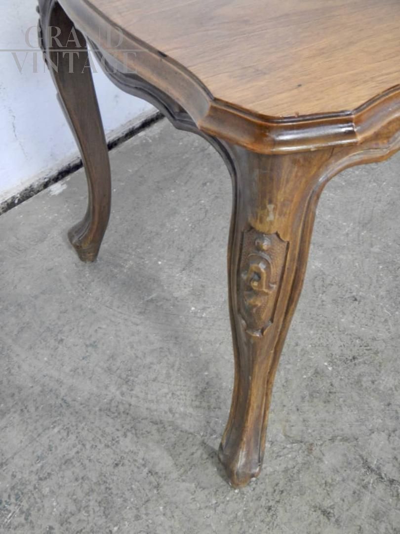 Tavolino da salotto vintage stile antico in legno di noce con piano in listellare di noce e gambe mosse con intaglio floreale. In buone condizioni.