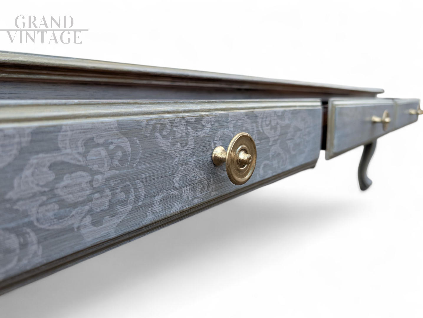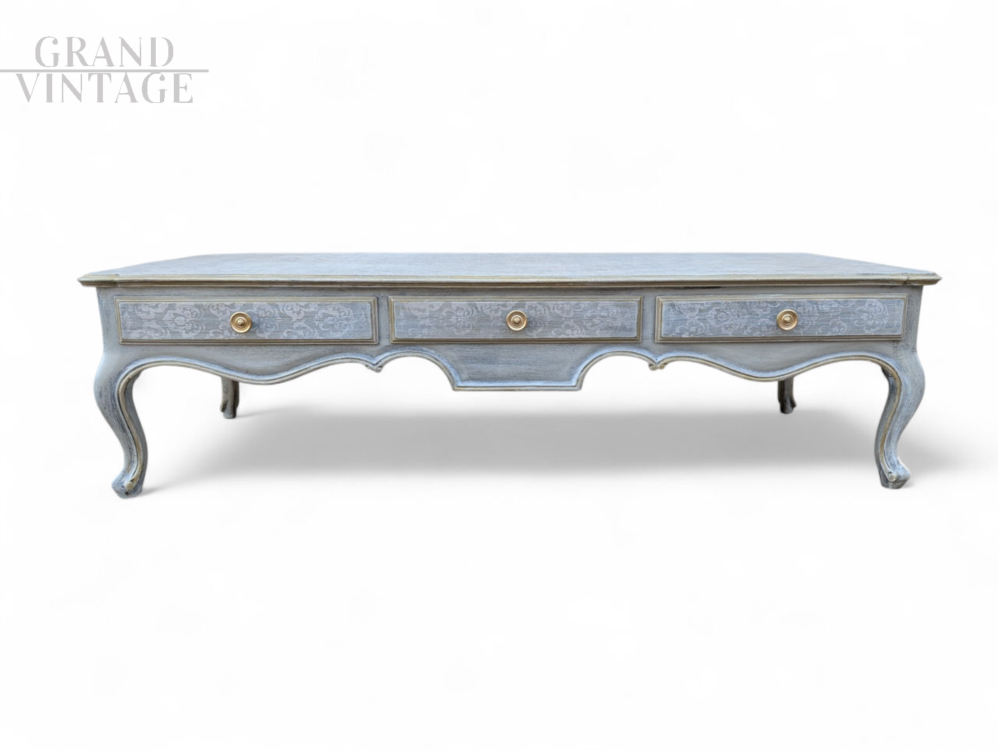 Elegante tavolino basso da salotto in stile classico francese provenzale, realizzato con struttura in pregiato massello di noce e rifinito con una delicata finitura grigio chiaro anticato con una leggera fantasia classica, che ne esalta il fascino decorativo. Il piano ampio e lineare poggia su quattro gambe sagomate in stile Luigi XV, mentre il fronte presenta tre cassetti arricchiti da motivi floreali decorativi e maniglie tonde in ottone. La finitura, volutamente patinata, dona al pezzo un aspetto vissuto e raffinato, perfetto per interni dallo stile classico, provenzale o shabby chic. Un arredo artigianale che unisce la solidità del legno di noce alla leggerezza estetica del colore e delle decorazioni, ideale per chi cerca un pezzo unico, elegante e funzionale.
