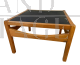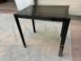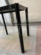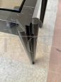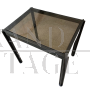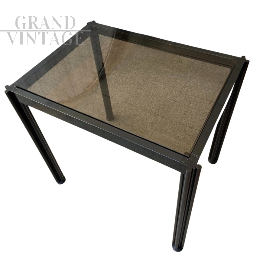 Bel tavolino design di George Ciancimino con struttura in metallo laccato nero e piano in vetro fumé, Inghilterra 1978, da notare il magnifico incastro geometrico tra la gamba e il piano, peculiarità del design di Ciancimino.