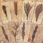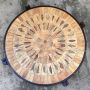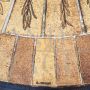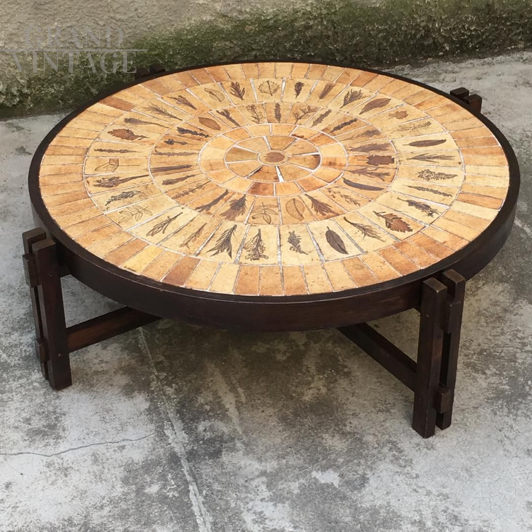 Tavolino da salotto in ceramica di Roger Capron, con piastrelle dell'artista francese decorate da motivi organici di foglie ed erbe in uno schema radiale, con esclusive gambe in legno tinto a binario diviso. Le foglie venivano applicate sulla ceramica ancora fresca e bruciate nel forno in fase di cottura, lasciando il loro calco sulla mattonella.
