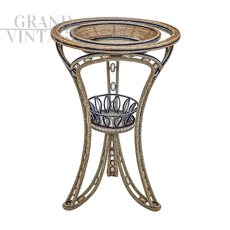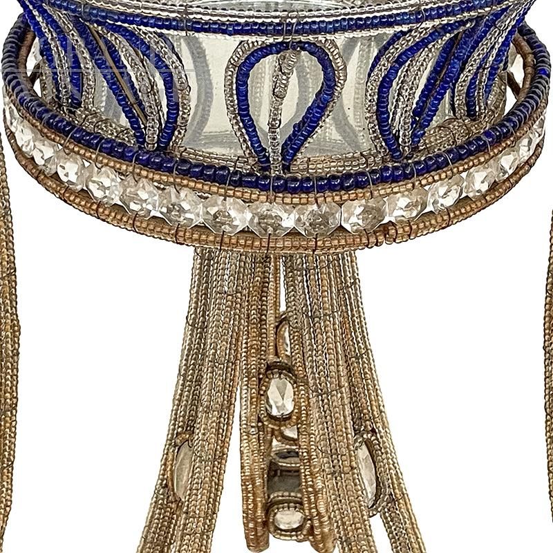 Tavolino da appoggio design interamente realizzato a mano, con struttura in metallo completamente rivestita di perline in vetro di Murano trasparente e blu ed elementi decorativi in vetro molato; i due ripiani (intermedio e superiore) presentano una finitura superficiale a specchio.