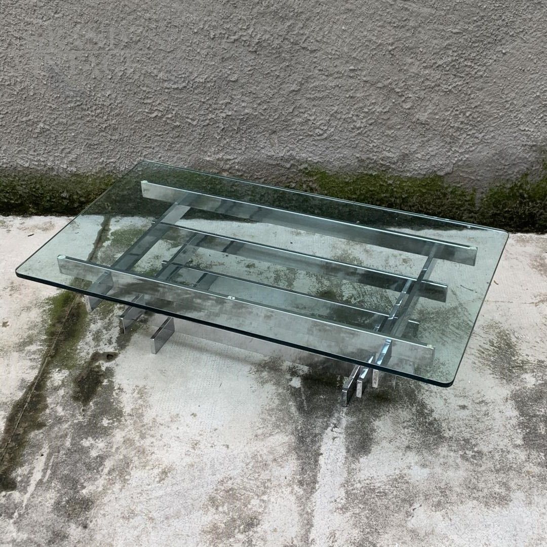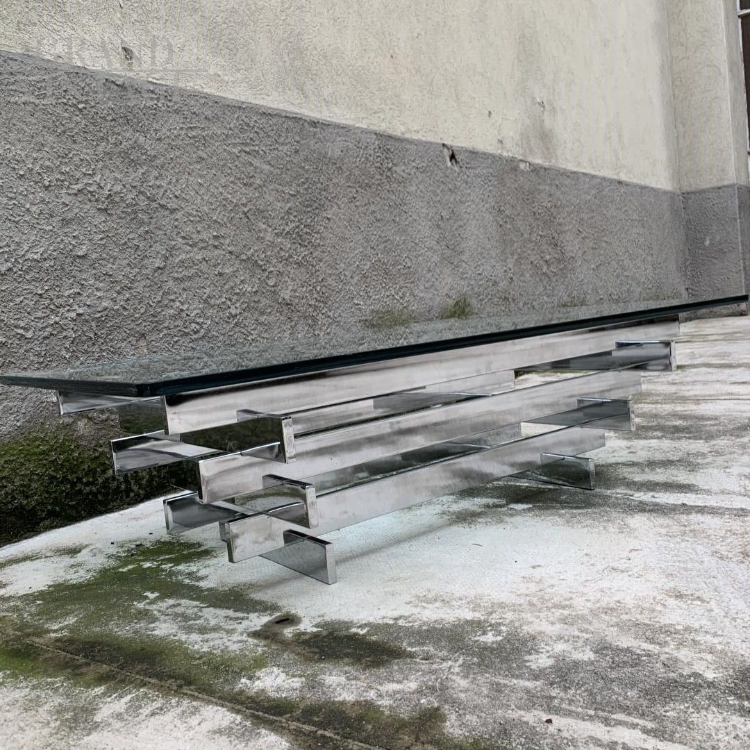 Un insolito e raro tavolino da caffè di David Hicks, Mod. "Tavolo Scultura". Struttura caratterizzata da pezzi metallici impilati e cromati, vetro temperato originale sul piano.