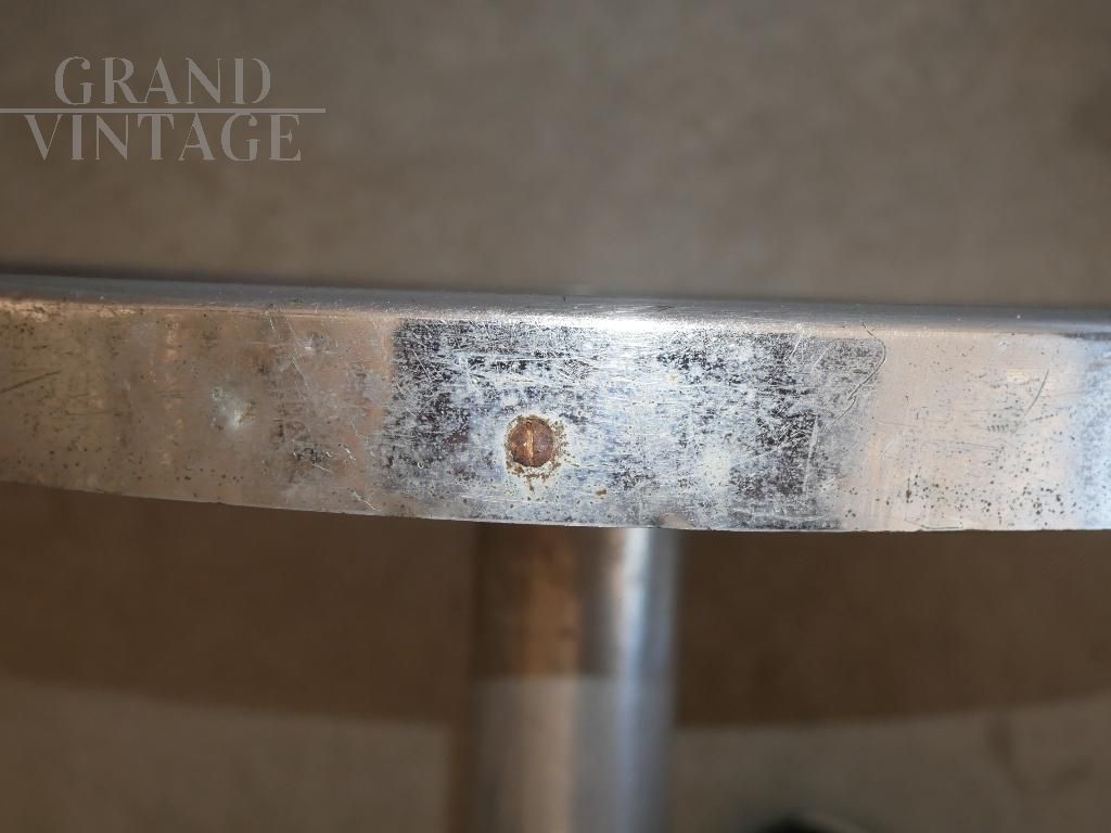 Tavolino rotondo da bistrot francese anni '50 / '60, con base in ghisa e stelo in metallo argentato, piano tondo del diametro di 50 cm ed altezza di 72 cm, tavolino tipico dei caffè francesi dell'epoca. Il piano presenta macchie e sotto al piano si possono riscontrare delle mancanze, dettagli in foto. Struttura solida, non restaurato, adatto ad arredamenti industriali.