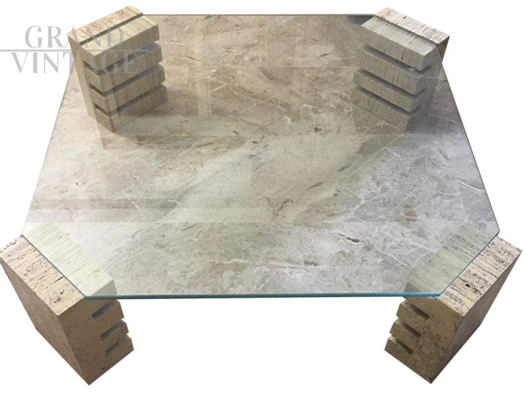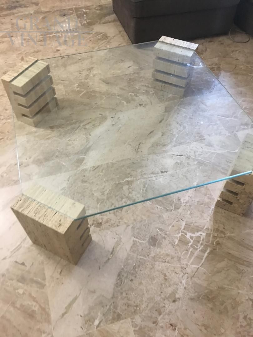 Tavolino da caffé anni '70 con piano in vetro spesso che poggia su quattro basi in travertino fresate per regolare l'altezza del piano.