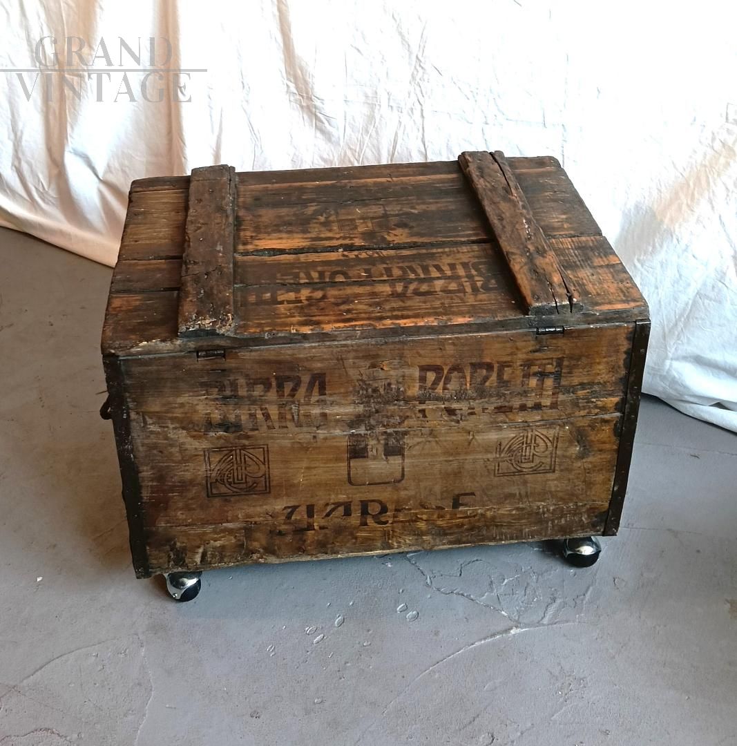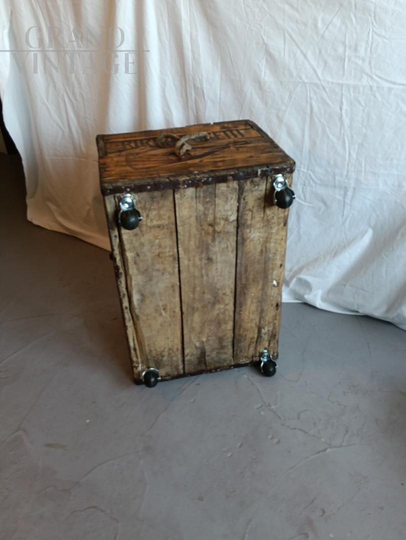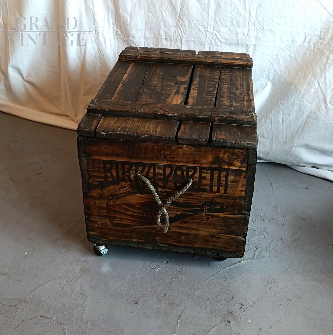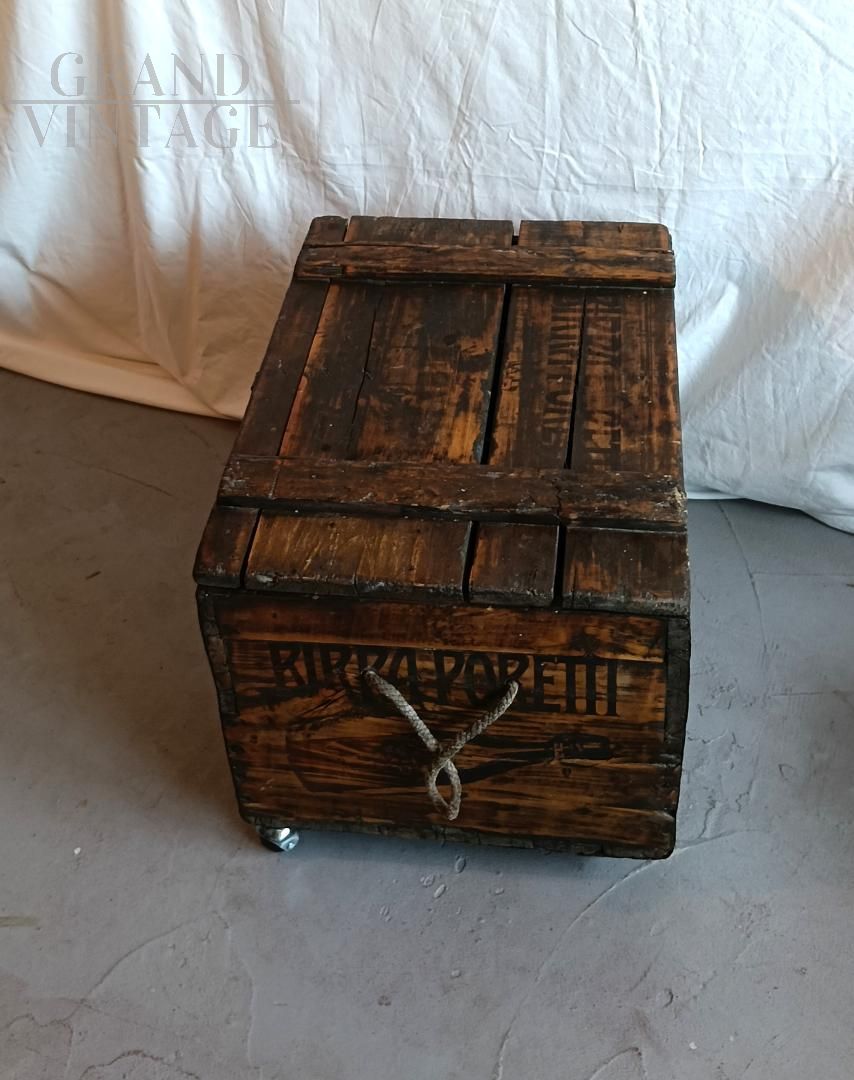 Tavolino contenitore con ruote ricavato da una cassa portabottiglie con marchio Birra Poretti Varese, realizzato in legno di quercia massiccio. Oggetto raro, risale al 1912 come da logo "segheria Casalpusterlengo 1912 " posto su un lato. Sul baule vi sono i loghi Jugendstil tipici dell'epoca. Probabilmente il baule portava all'interno un fondo distanziato per l'alloggio delle bottiglie. Tutto originale, salvo una maniglia in corda. L'oggetto è stato restaurato, ripulito, passato con olio paglierino. Le parti metalliche ripassate con ovatrol. Vi sono segni di tarlo, risalenti a prima del trattamento antitarlo eseguito recentemente. Attualmente non vi sono più tarli . Strutturalmente il baule risulta robusto ed utilizzabile. Si può chiudere con lucchetto (non in dotazione). Le ruote sono piroettanti, si sposta facilmente.
