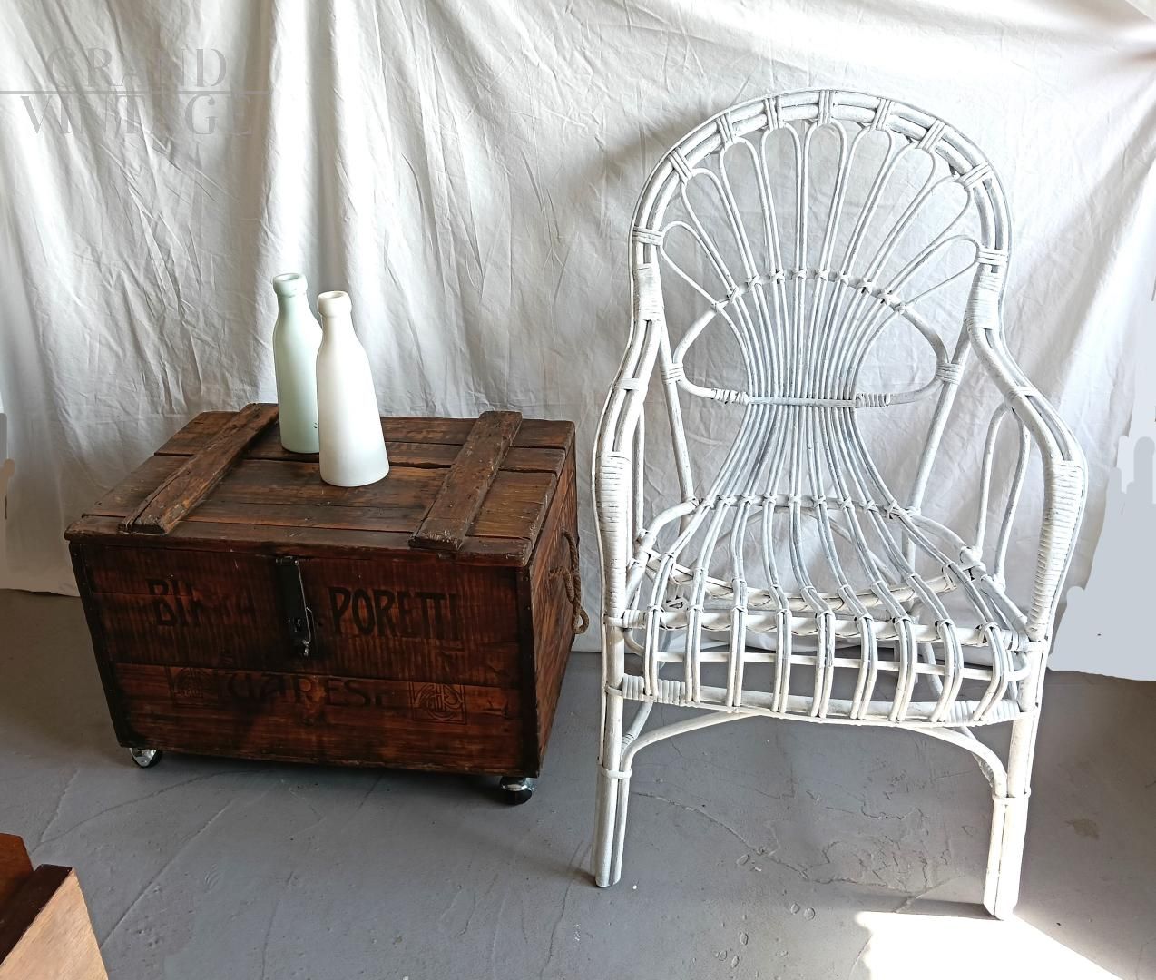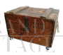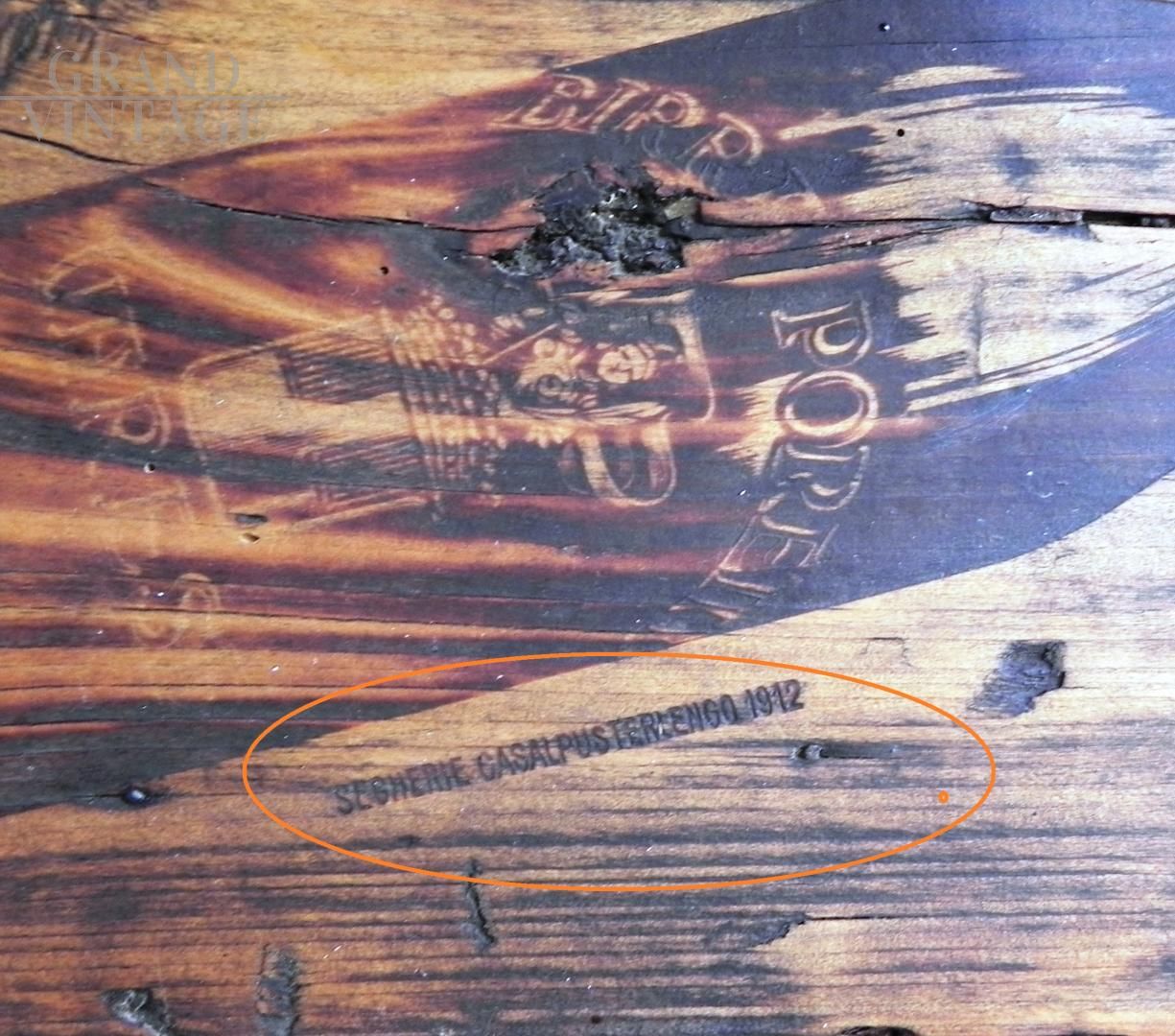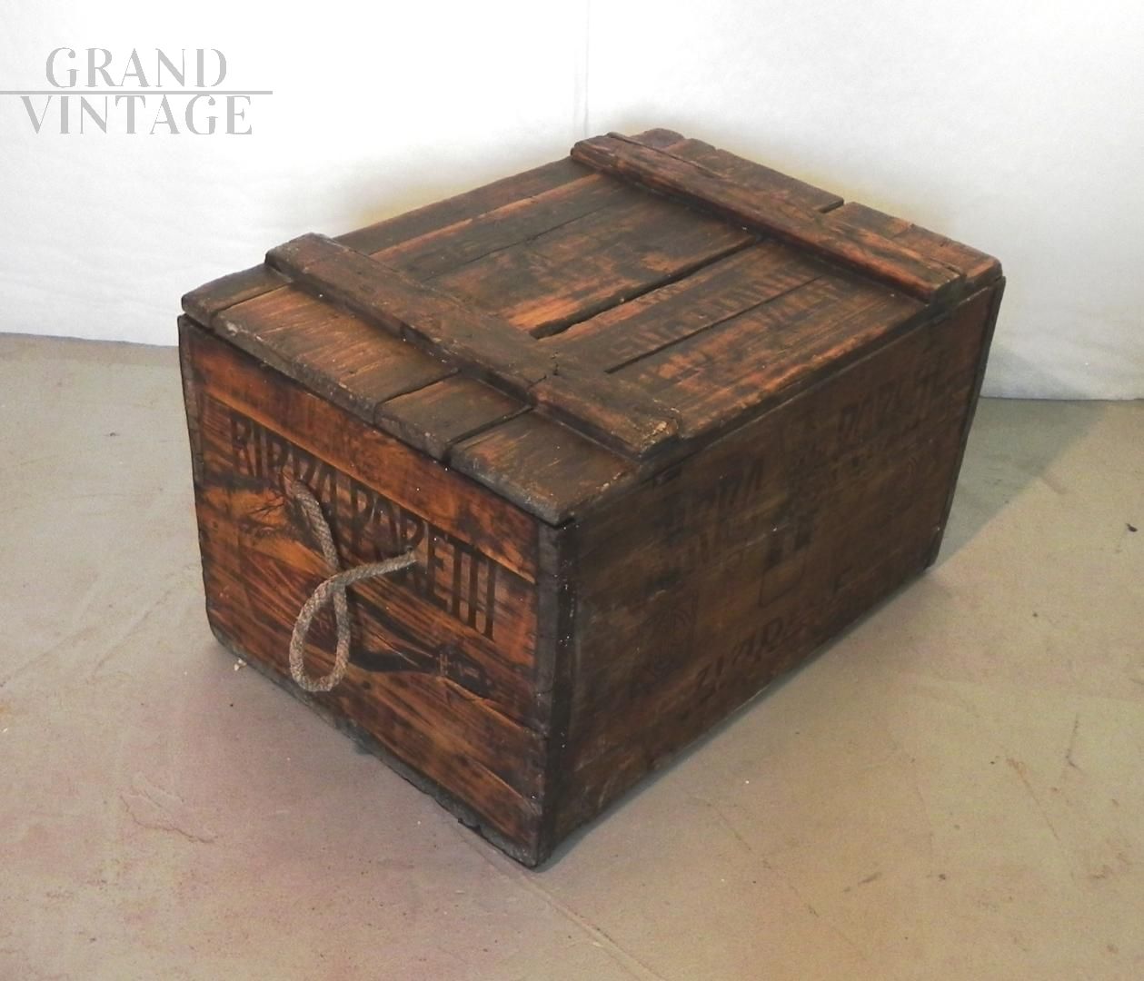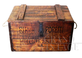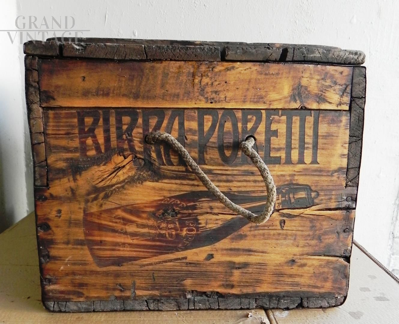Tavolino contenitore con ruote ricavato da una cassa portabottiglie con marchio Birra Poretti Varese, realizzato in legno di quercia massiccio. Oggetto raro, risale al 1912 come da logo "segheria Casalpusterlengo 1912 " posto su un lato. Sul baule vi sono i loghi Jugendstil tipici dell'epoca. Probabilmente il baule portava all'interno un fondo distanziato per l'alloggio delle bottiglie. Tutto originale, salvo una maniglia in corda. L'oggetto è stato restaurato, ripulito, passato con olio paglierino. Le parti metalliche ripassate con ovatrol. Vi sono segni di tarlo, risalenti a prima del trattamento antitarlo eseguito recentemente. Attualmente non vi sono più tarli . Strutturalmente il baule risulta robusto ed utilizzabile. Si può chiudere con lucchetto (non in dotazione). Le ruote sono piroettanti, si sposta facilmente.