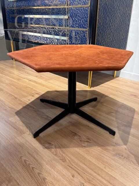 Tavolino italiano anni '80 di bella linea e piacevole arredamento. Mobile di design con gamba centrale in acciaio galvanizzato e piano superiore esagonale in legno rivestito in Alcantara cucita a mano. Tavolino di bella misura e proporzioni, facilmente inseribile in diversi punti della casa.