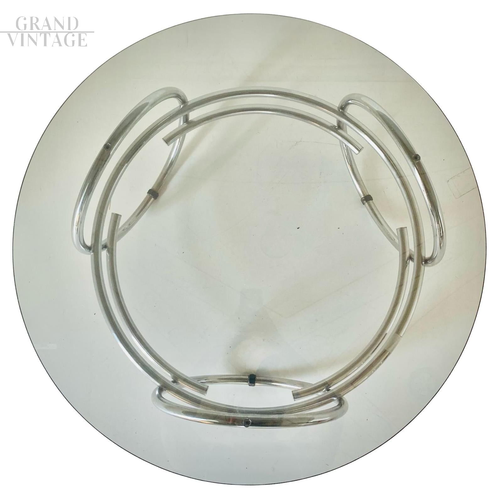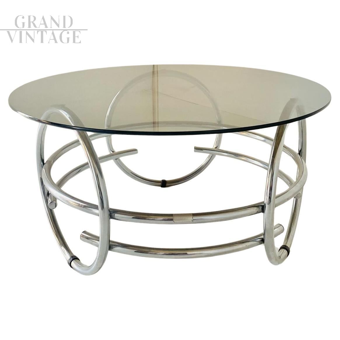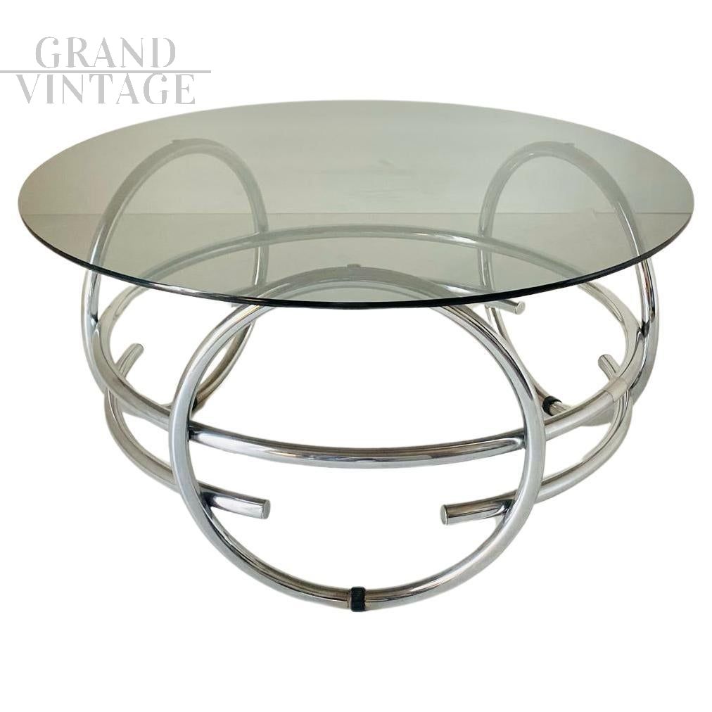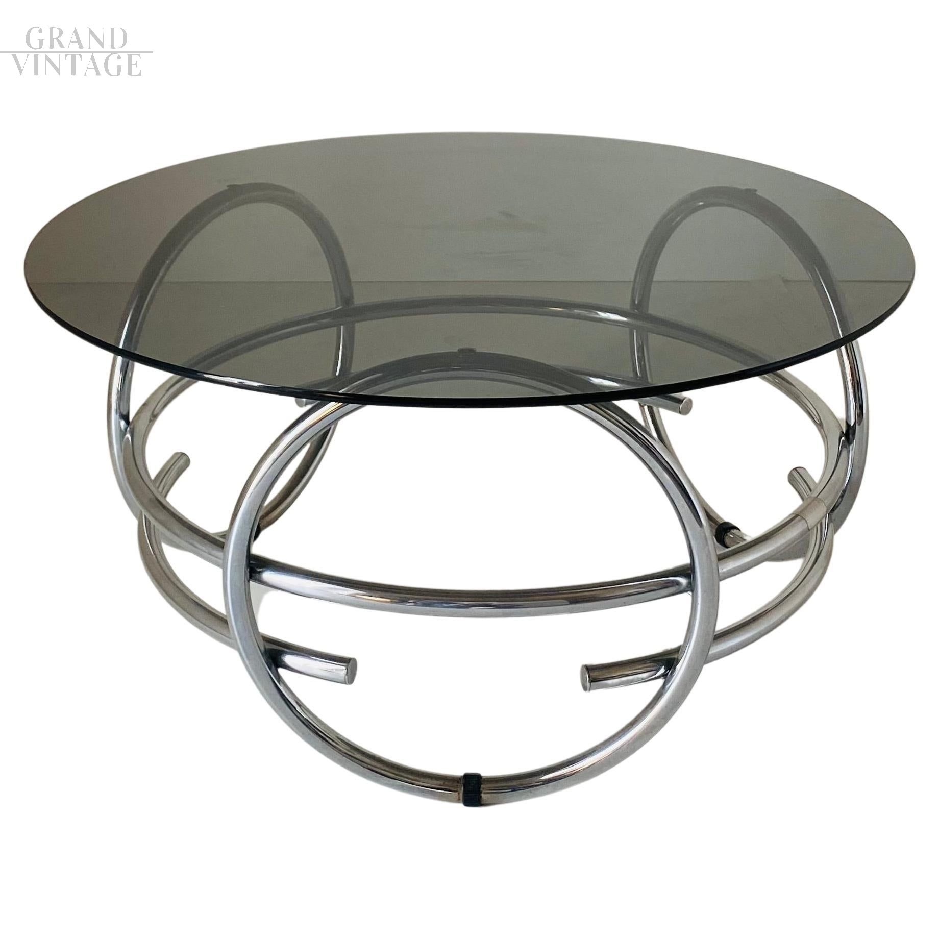 Tavolino space age anni '70 con struttura in acciaio cromato e piano rotondo in vetro fumé, in ottime condizioni.
