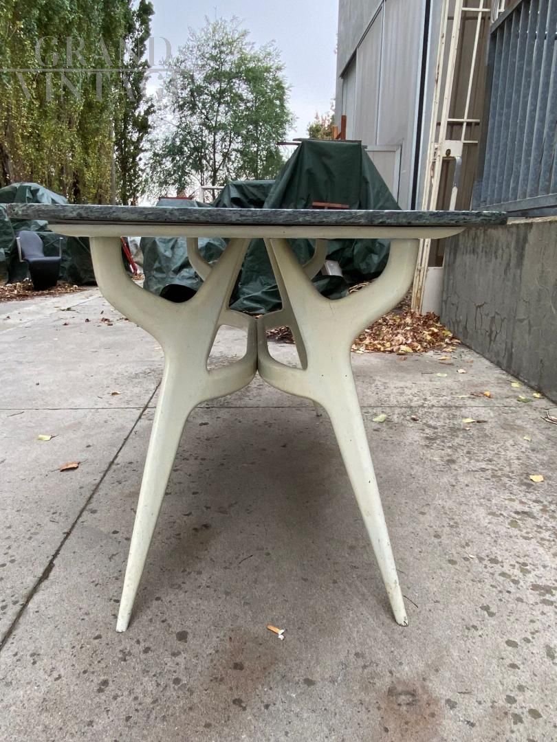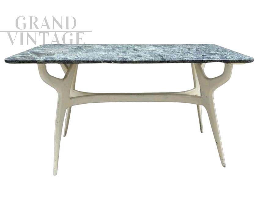 Tavolo vintage italiano, mid-century anni '50 con forme che richiamano il design di Ico Parisi o di Paolo Buffa, struttura in legno laccato bianco avorio e piano in marmo verde Alpi.