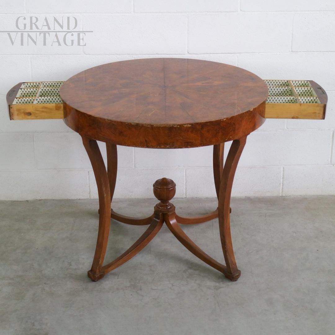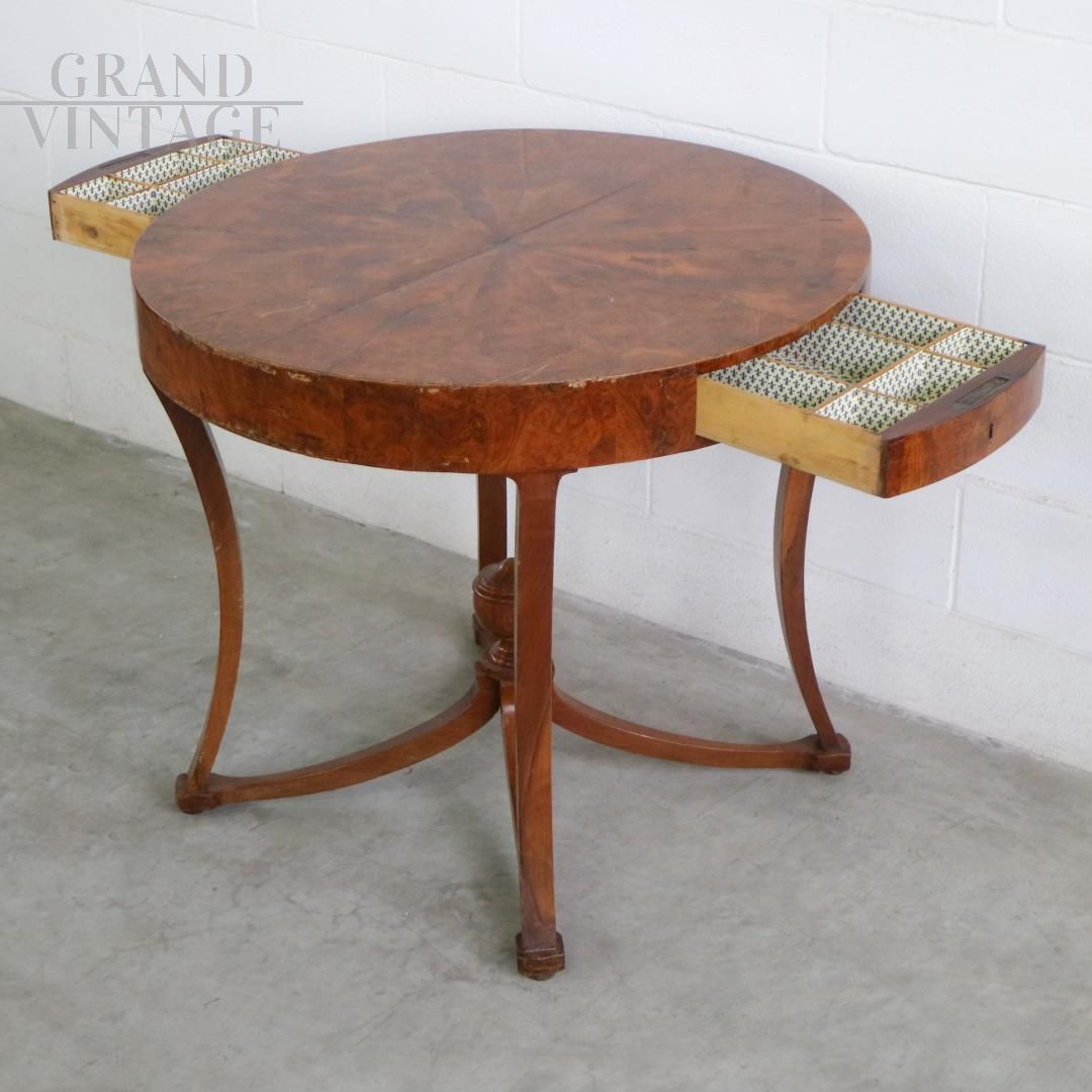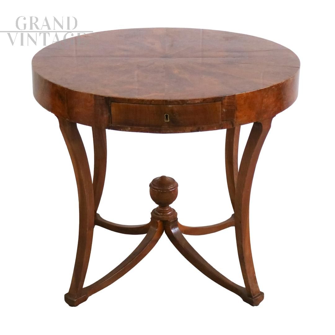 Tavolo circolare antico in radica del XIX secolo, con due cassetti laterali e gambe curve collegate da elemento a crociera sagomato. Buono lo stato di conservazione anche se presenta alcuni naturali segni del tempo.