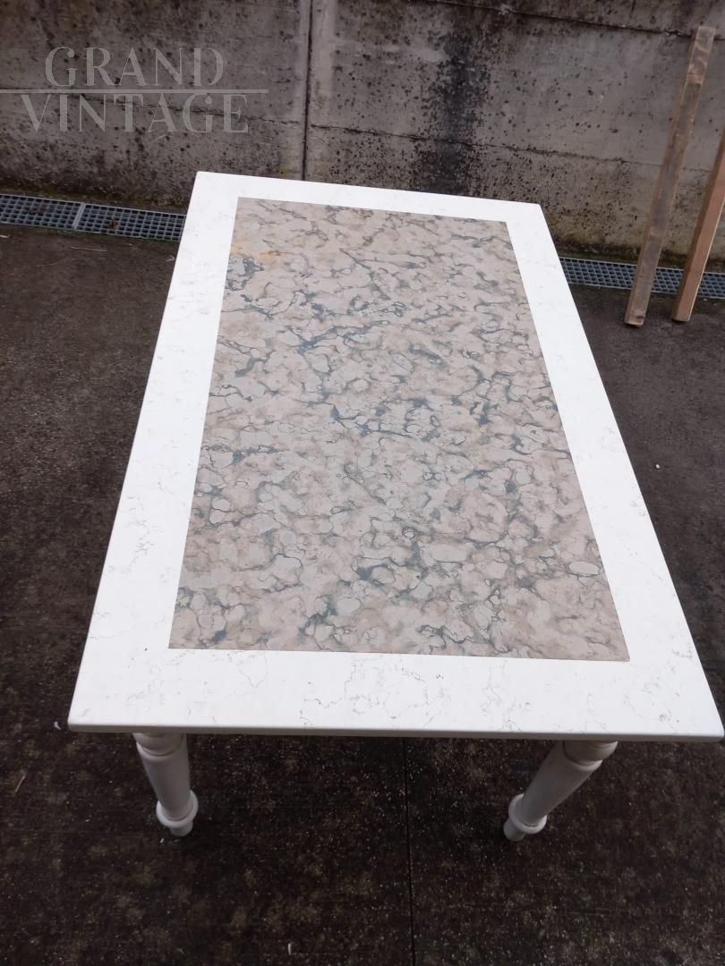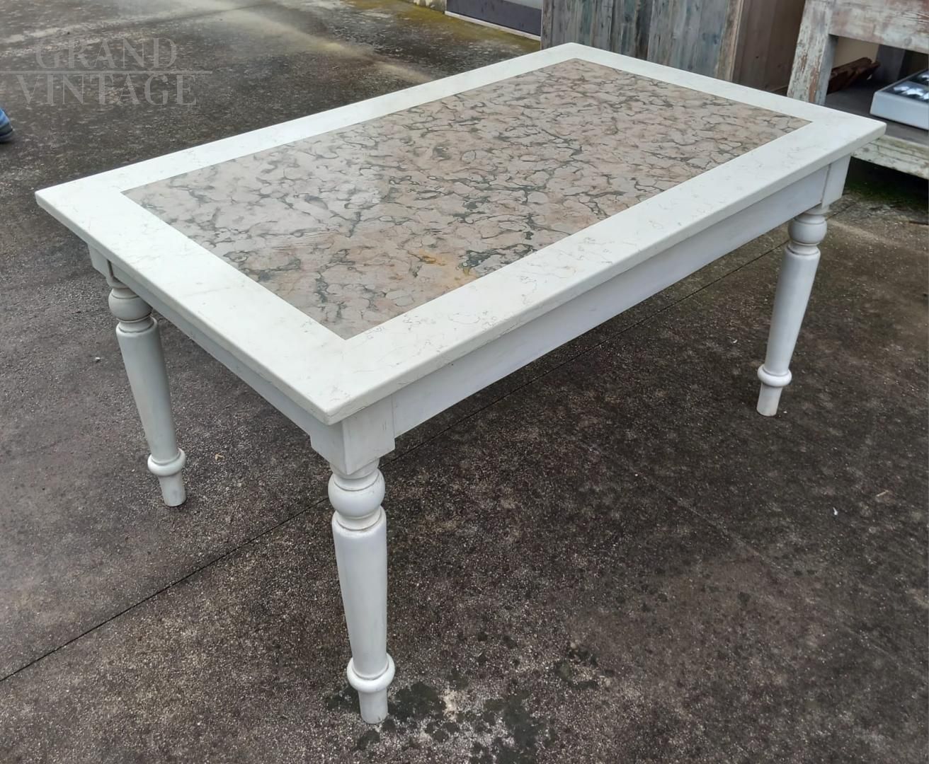 Tavolo dell'800 con piano in marmo con particolare fascia bianca. Le gambe e la fascia sono in legno laccato bianco. L'altezza da terra alla fascia sotto il piano è di 65 cm, un ottimo spazio per le gambe che rende questo tavolo adatto anche alle sedie moderne. Ottima misura, soprattutto in profondità (96 cm).