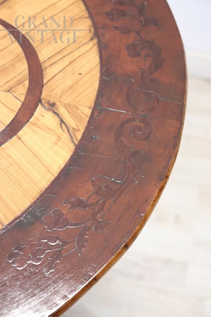 Bellissimo tavolo antico rotondo ideale da salotto come espositore per foto di famiglia. Realizzato in legno di noce con elegante lavoro ad intarsio sul piano in pregiato legno di ulivo. La gamba centrale è finemente tornita. Tavolino databile intorno alla metà del secolo XIX in epoca Luigi Filippo, usato ma in ottime condizioni generali. Ottimo prezzo trattabile.