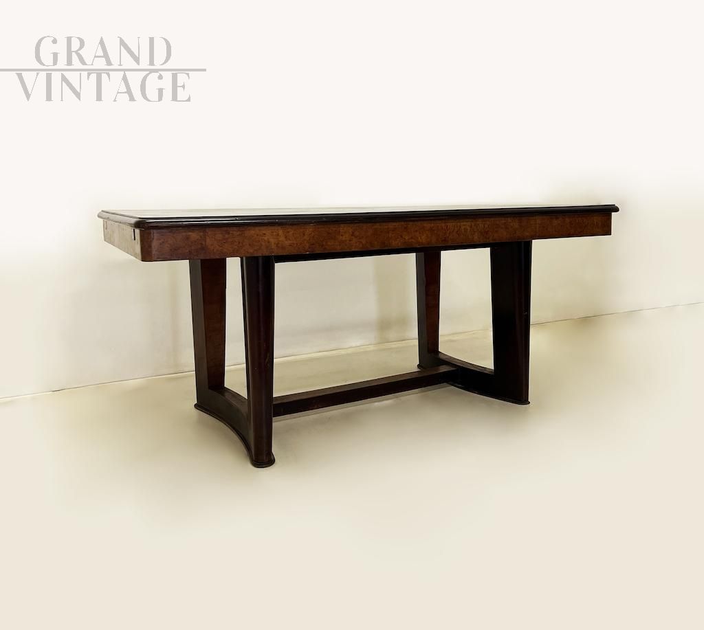 Elegante tavolo Art Déco italiano interamente realizzato in legno di palissandro e acero con dettagli in ottone.