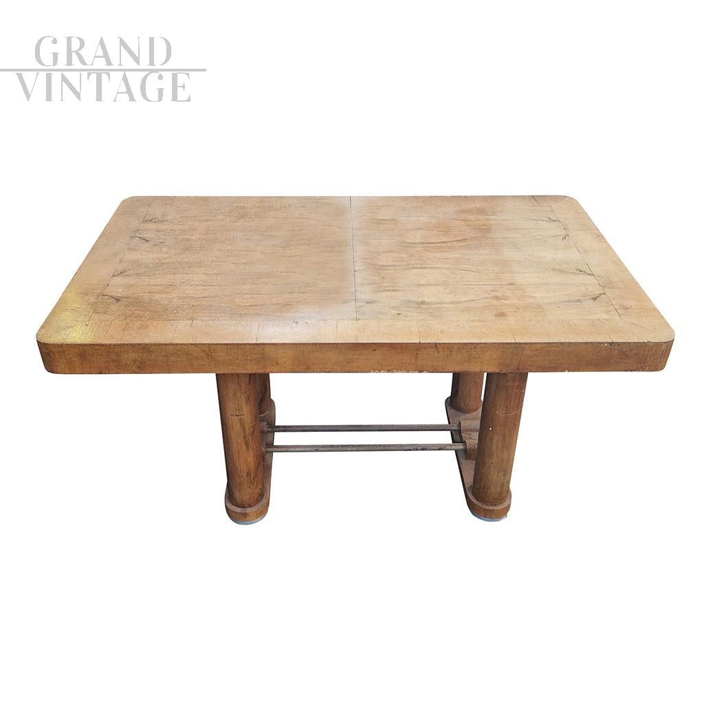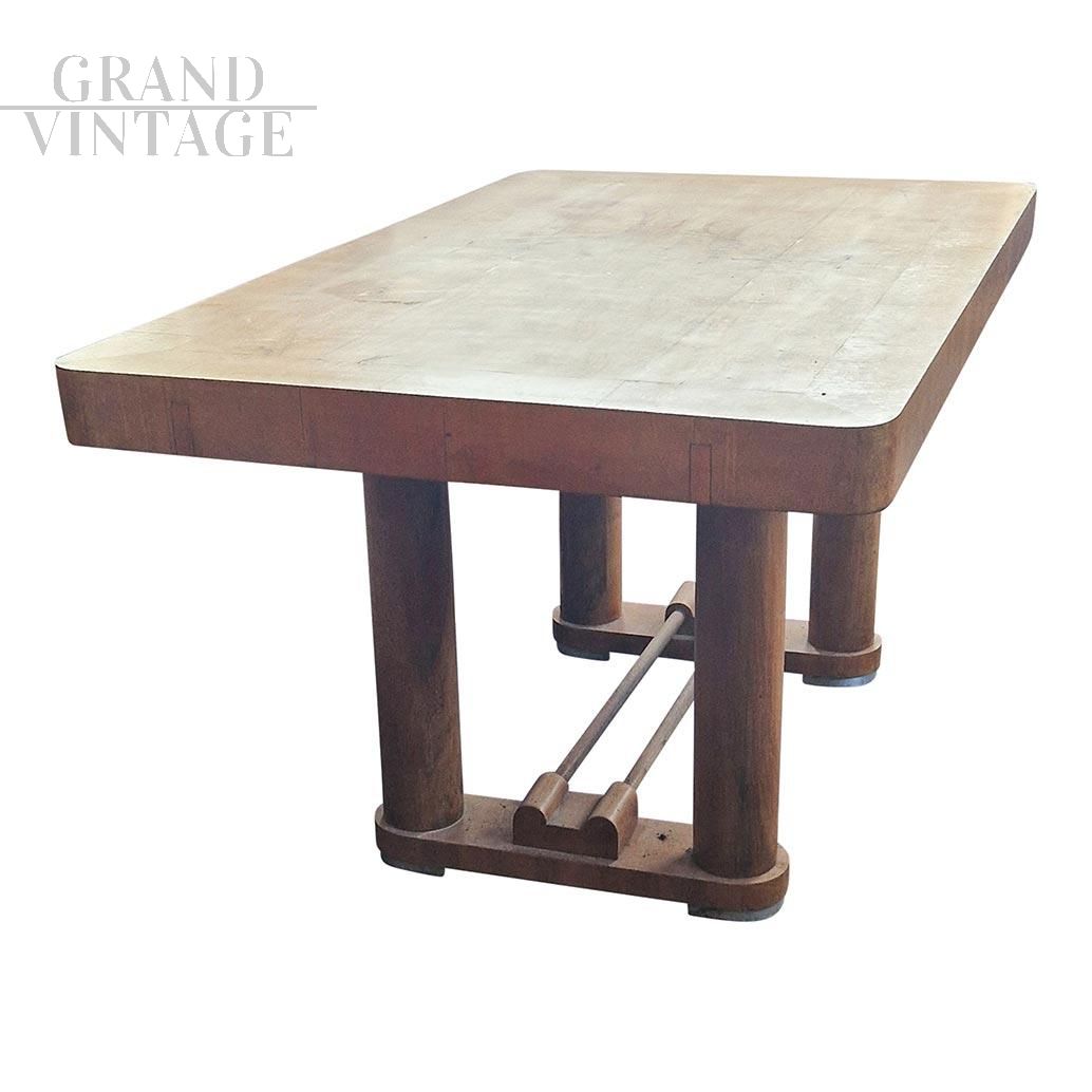 Tavolo Art Déco in noce con piano rettangolare con angoli stondati, poggiante su quattro sostegni a colonna su basi sagomate e riunite al centro da una coppia di tubolari di sezione circolare in metallo.