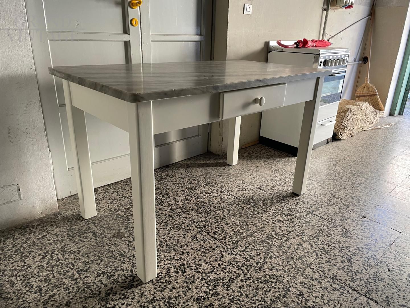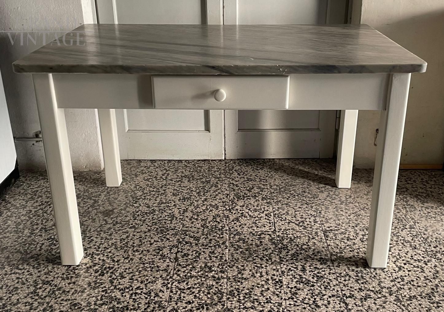 Bellissimo tavolo da cucina vintage in legno laccato bianco con piano in marmo grigio e cassetto centrale, in buone condizioni vintage.