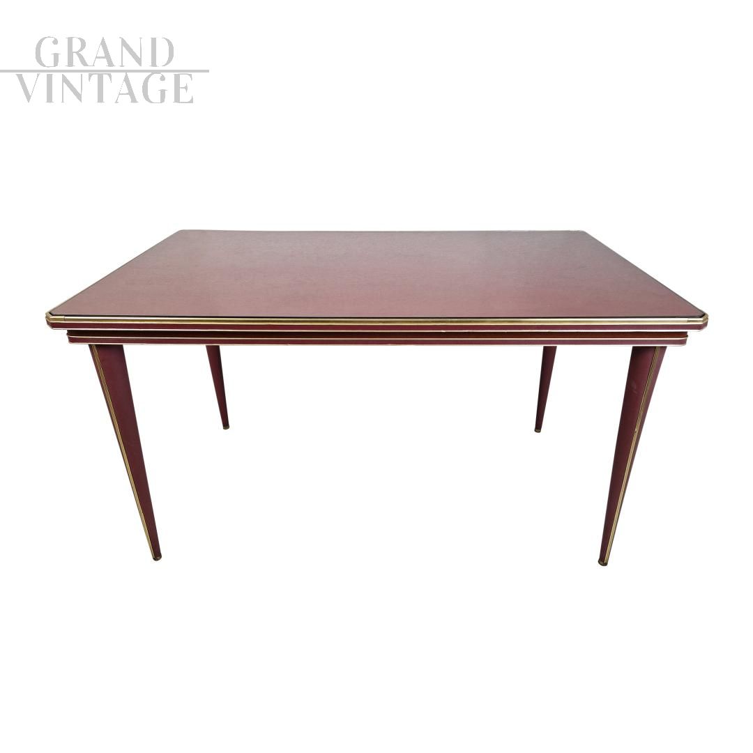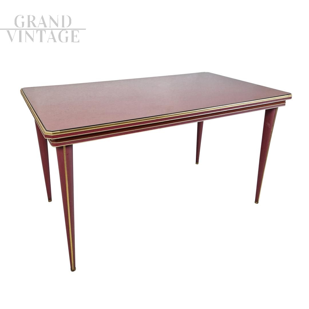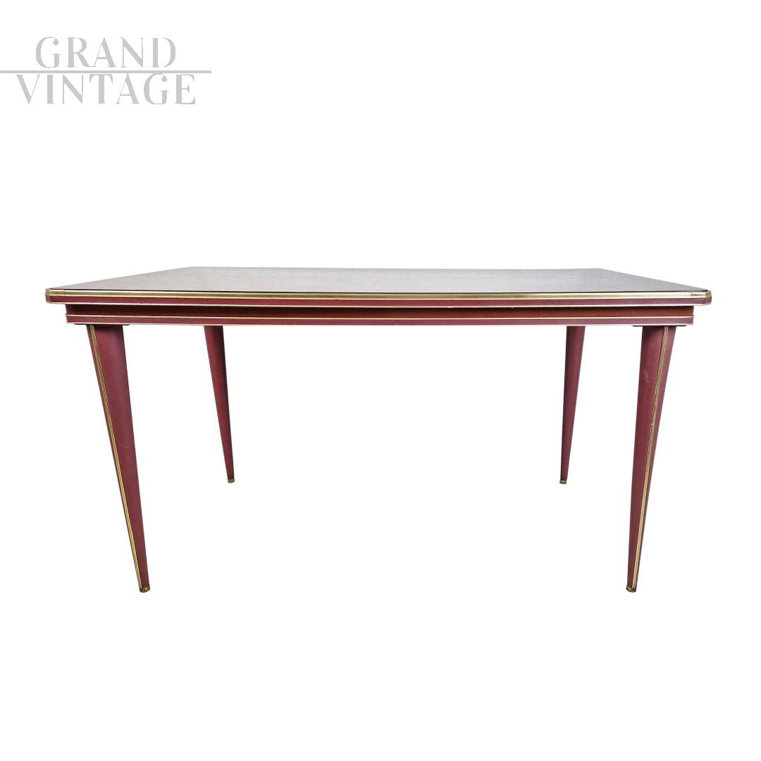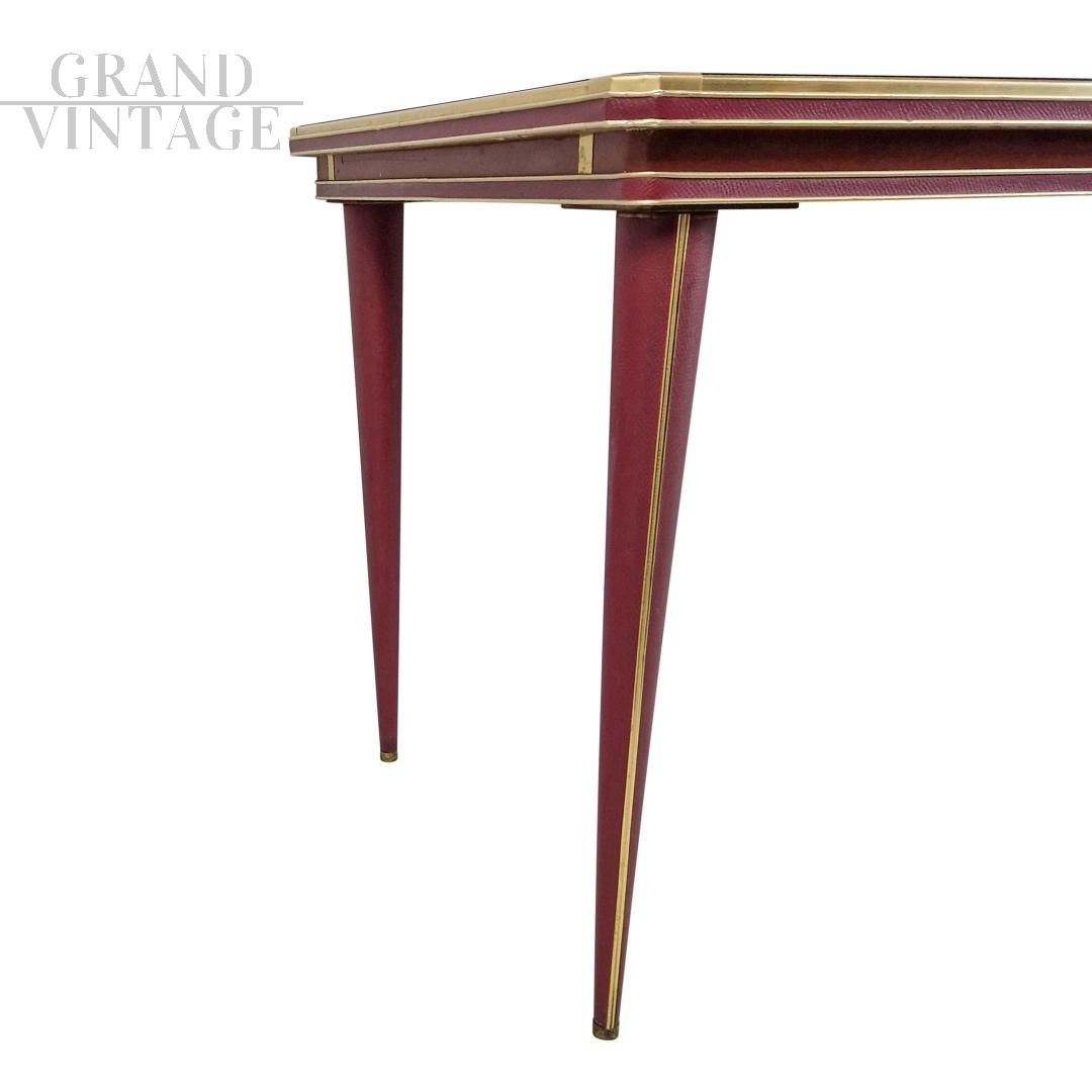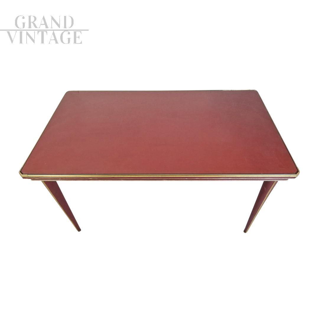 Tavolo da pranzo design di Umberto Mascagni (Bologna, anni ’50) per Harrods, con la struttura del corpo principale e le quattro gambe in legno massello, rivestite in pelle rossa con profili in ottone. Il top, anch’esso in pelle rossa, è protetto da una lastra in vetro trasparente. Ottimo lo stato di conservazione.