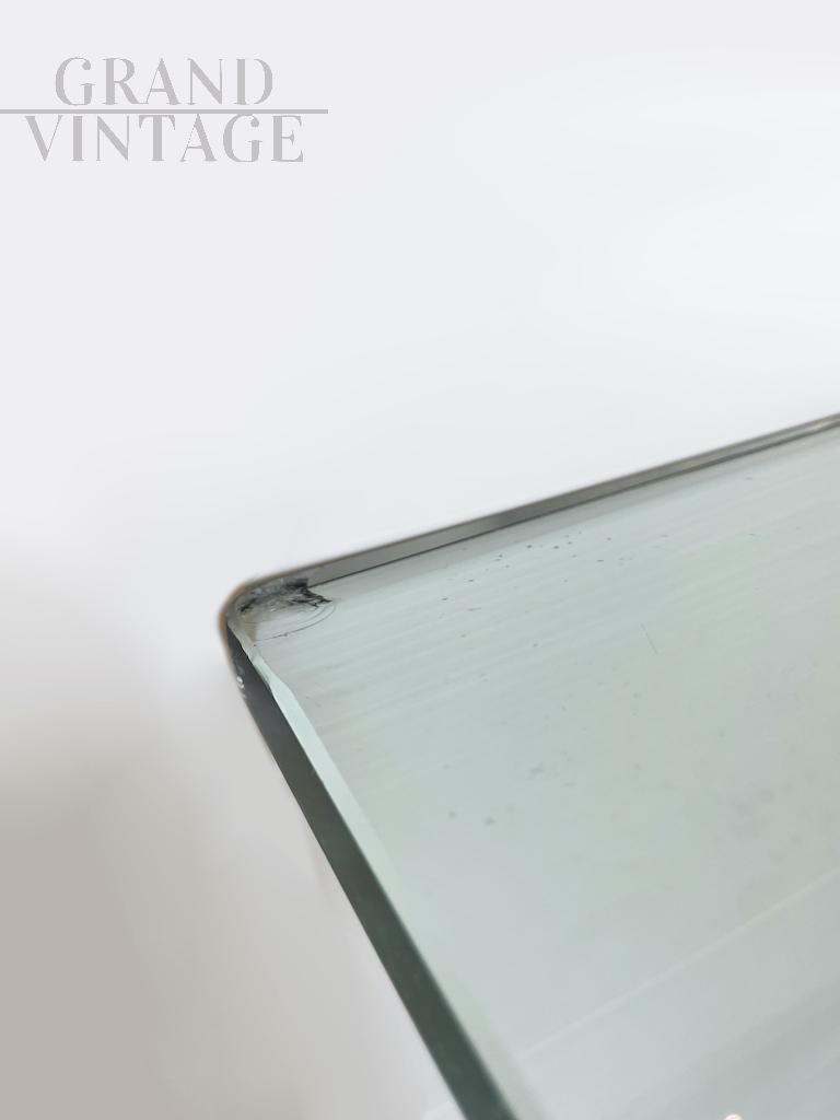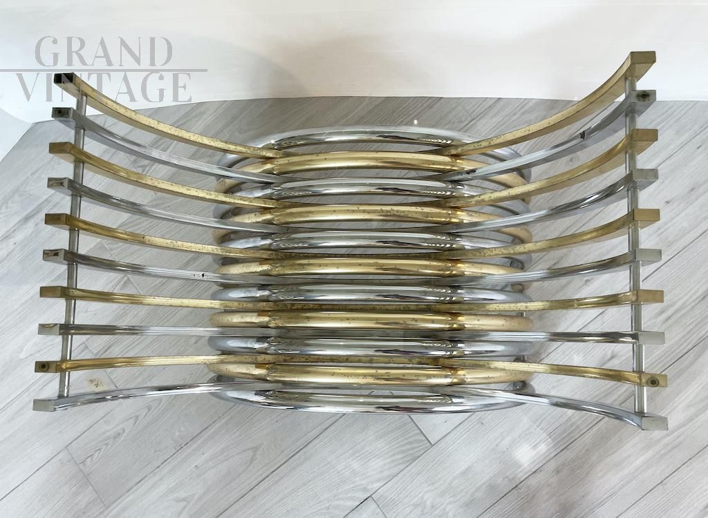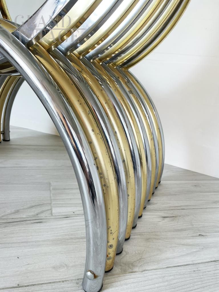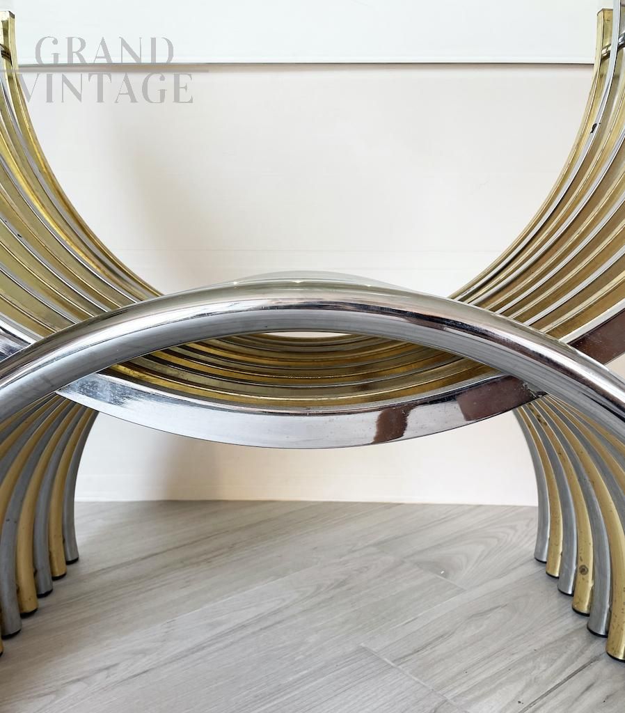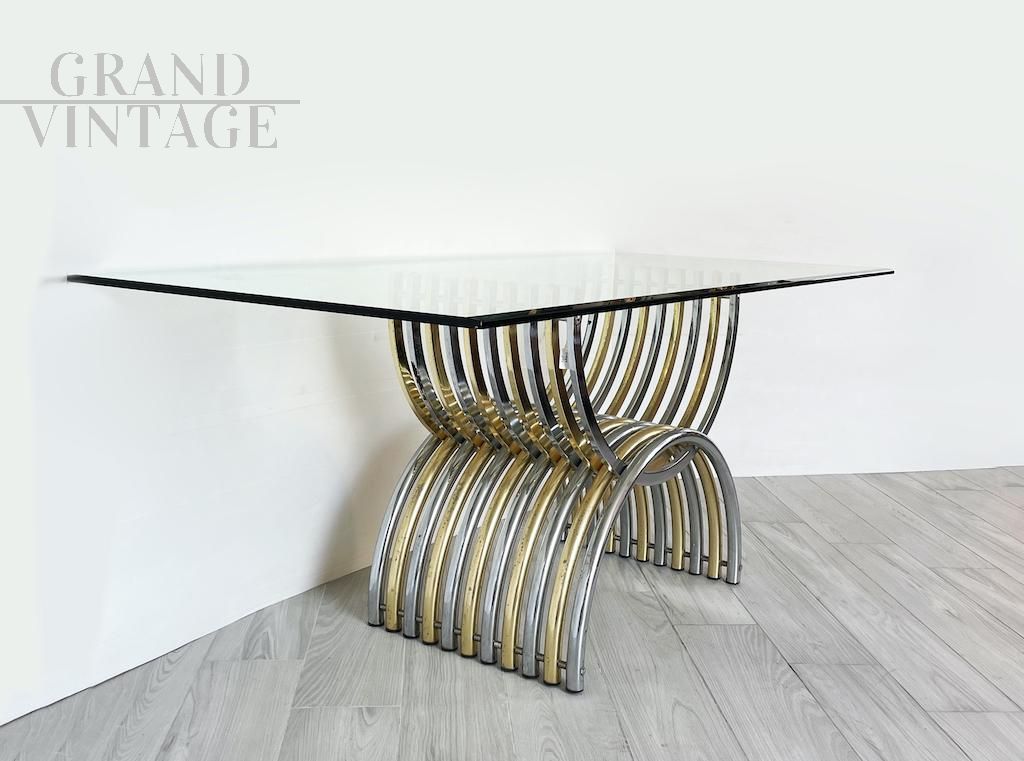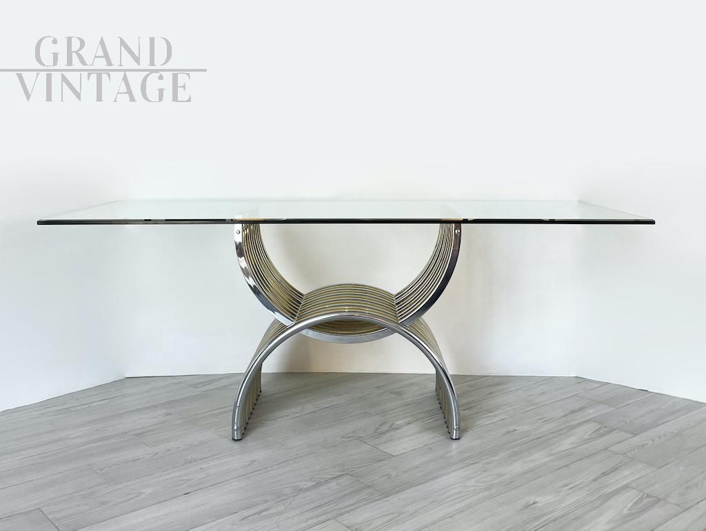 Elegante tavolo da pranzo Vintage 1970 caratterizzato da una base ottenuta dall’intersezione di due semicerchi in metallo cromato e ottone, disposti in modo alternato. Il risultato è di un particolarissimo effetto cromatico che conferisce al tavolo un tocco elegante, leggero e luminoso. Il piano è interamente in vetro dallo spessore di 1,5 cm e leggermente smussato ai lati lunghi. Presenti segni del tempo visibili in foto. Italia anni '70.