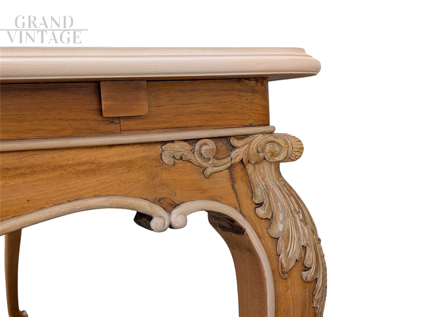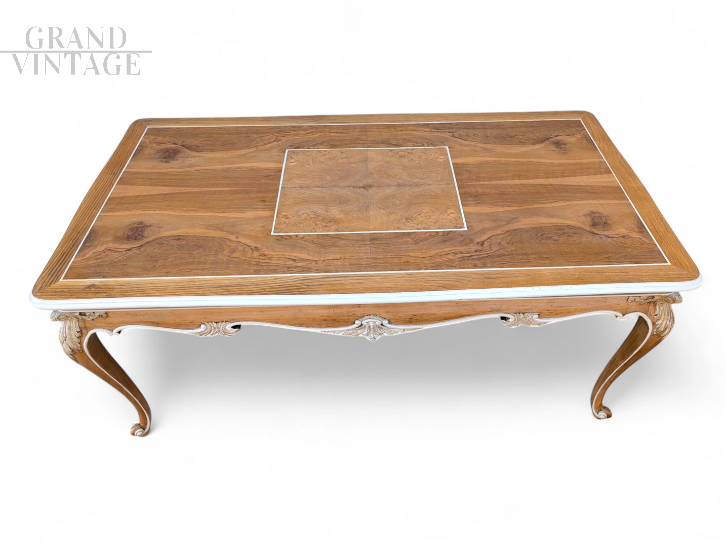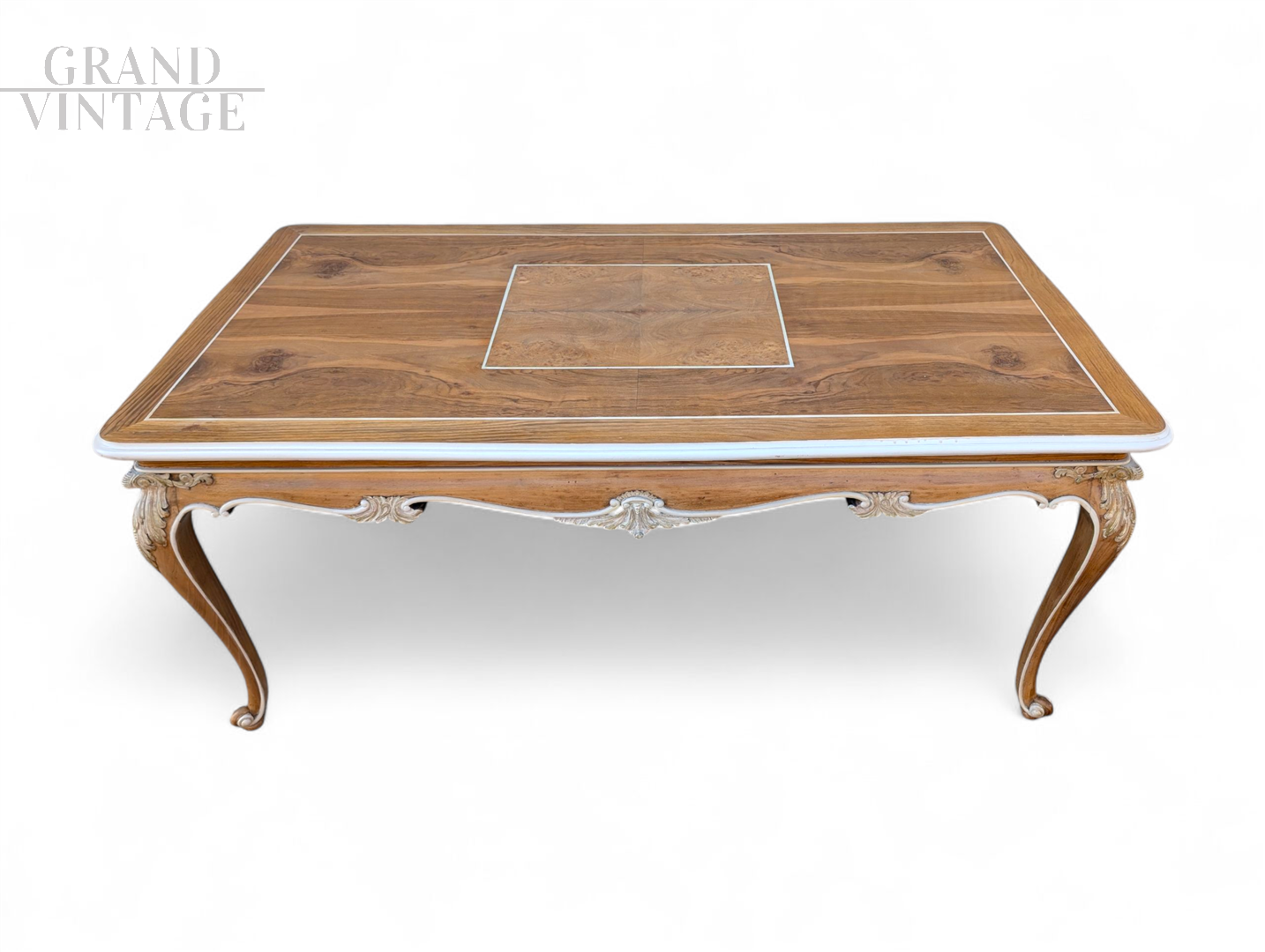 Questo elegante tavolo da salotto è un raffinato esempio di artigianato tradizionale italiano, realizzato interamente in massello di noce. Il piano, in pregiato legno di noce naturale, presenta una splendida venatura esaltata da una finitura liscia e calda, arricchita da un delicato gioco di intarsi geometrici con riquadro centrale. La struttura è scolpita in stile classico francese con gambe mosse e sagomate, tipiche del gusto Luigi XV, finemente intagliate a mano con motivi ornamentali floreali. Le decorazioni sono completate da una patinatura bianco crema che dona al pezzo un’eleganza senza tempo e un leggero accento shabby chic. Questo tavolo è realizzato artigianalmente.
