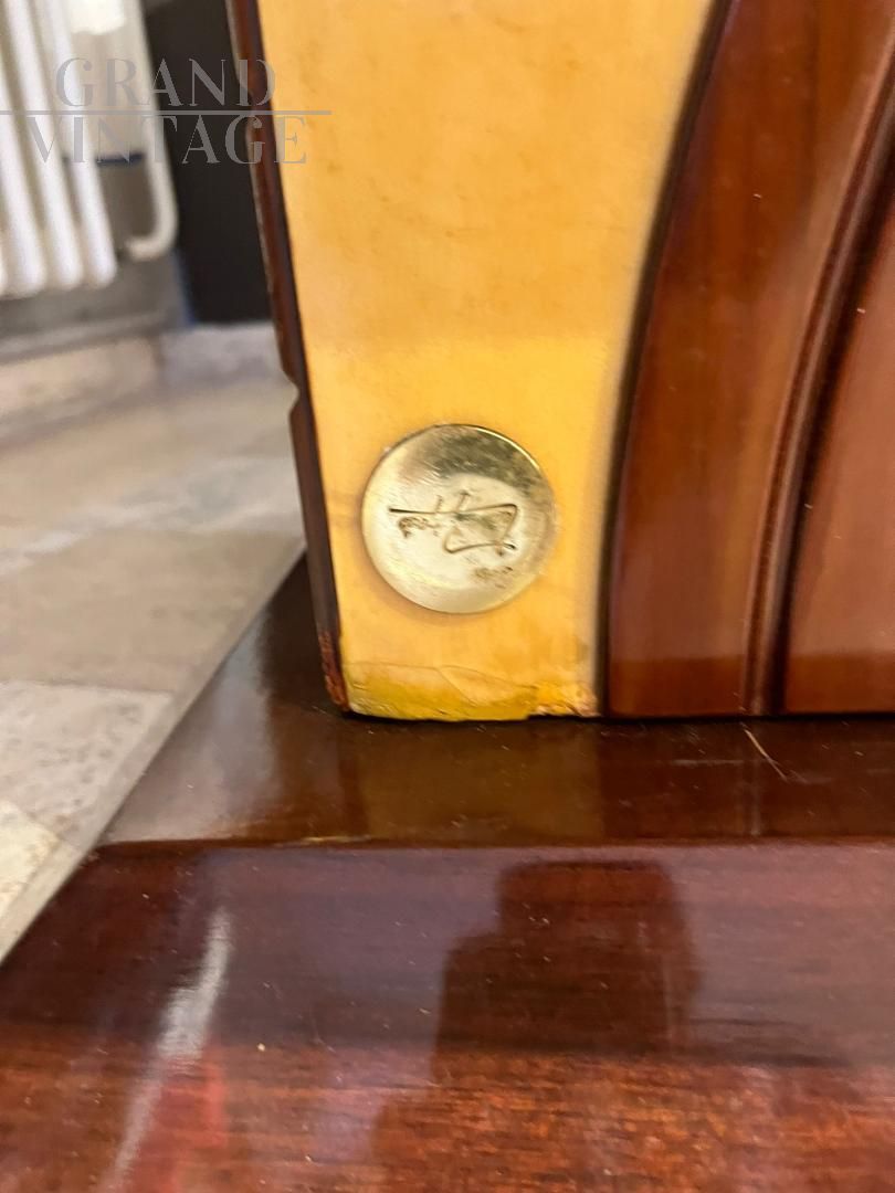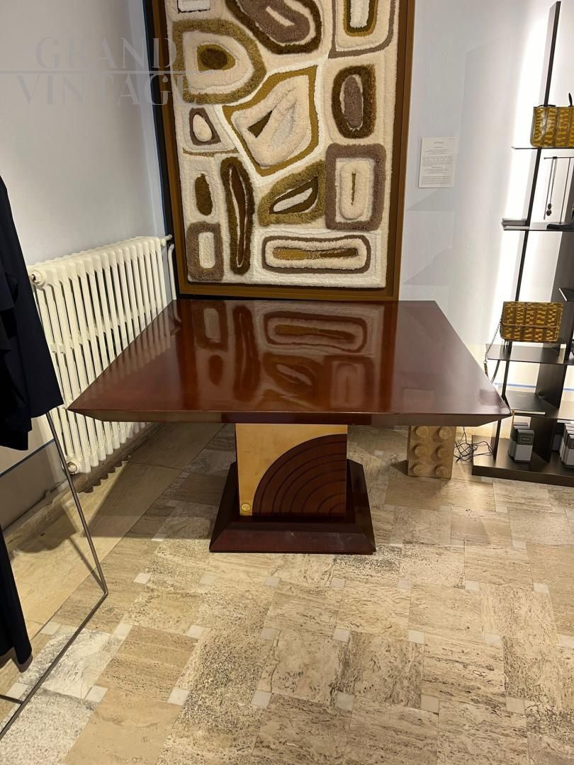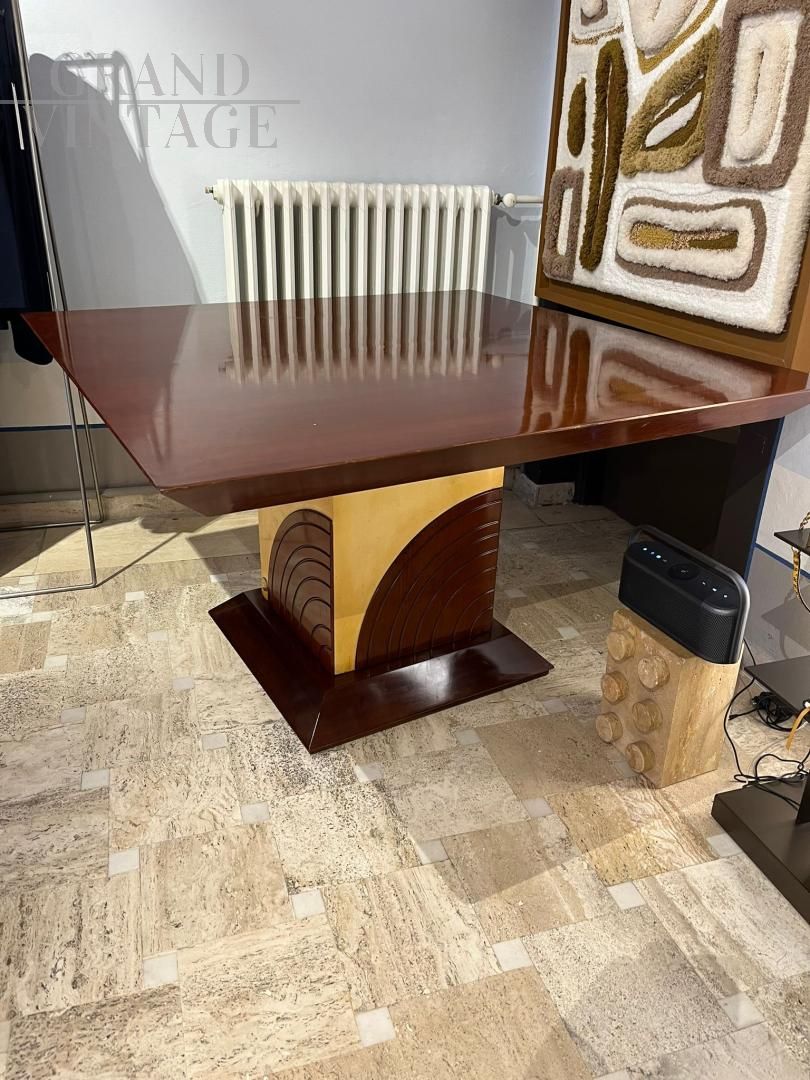 Bellissimo e raro tavolo design di Luciano Frigerio degli anni '60 in legno rivestito in pergamena e mogano, perfettamente tenuto. Il tavolo si compone di 3 pezzi da assemblare, è quindi pratico anche lo spostamento. Non particolarmente grande, il tavolo si adatta anche agli ambienti poco spaziosi.