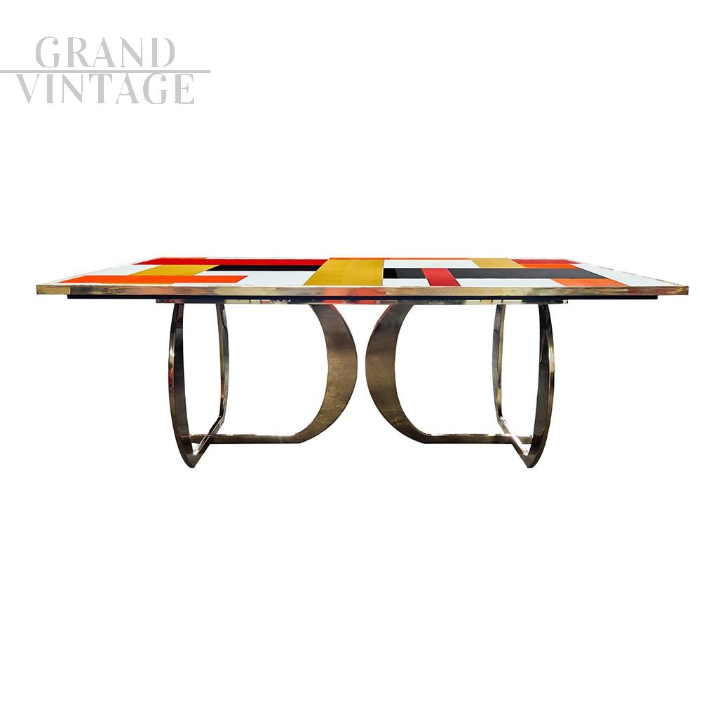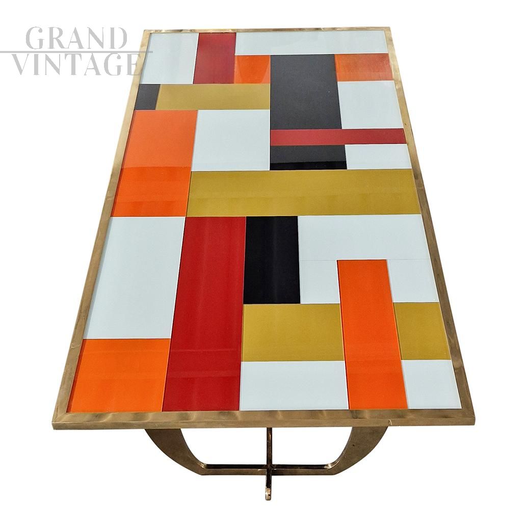 Tavolo dal design ricercato interamente realizzato a mano con base in acciaio cromato oro e piano in vetro di Murano colorato con motivo a riquadri in stile Mondrian, dai colori caldi. Profili in ottone dorato.