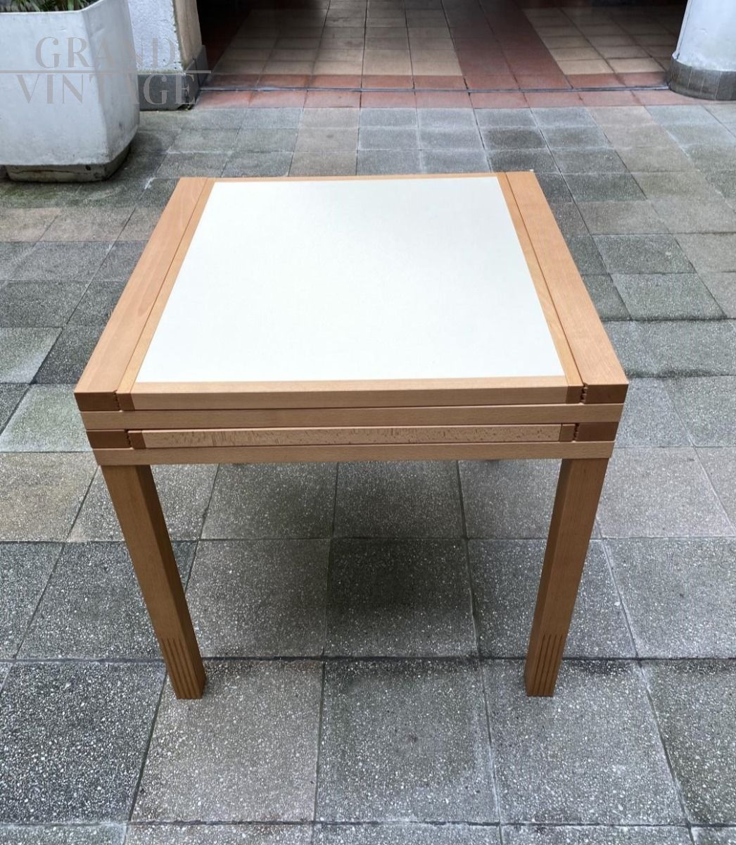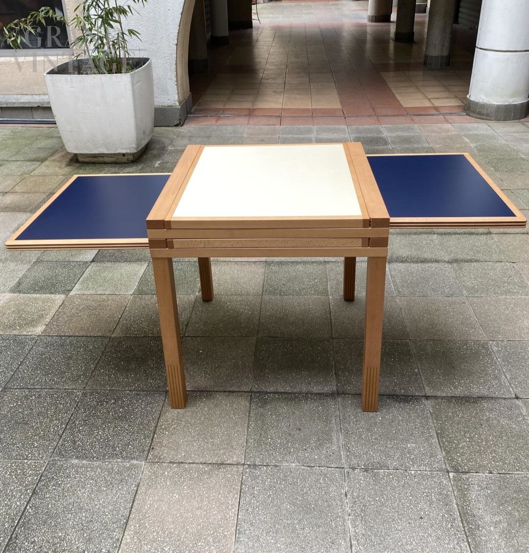 Tavolo da pranzo Hexa di Bernard Vuarnesson, componibile e reversibile, con piani in legno a scomparsa rivestiti in melaminico, blu da un lato e bianco dall'altro.