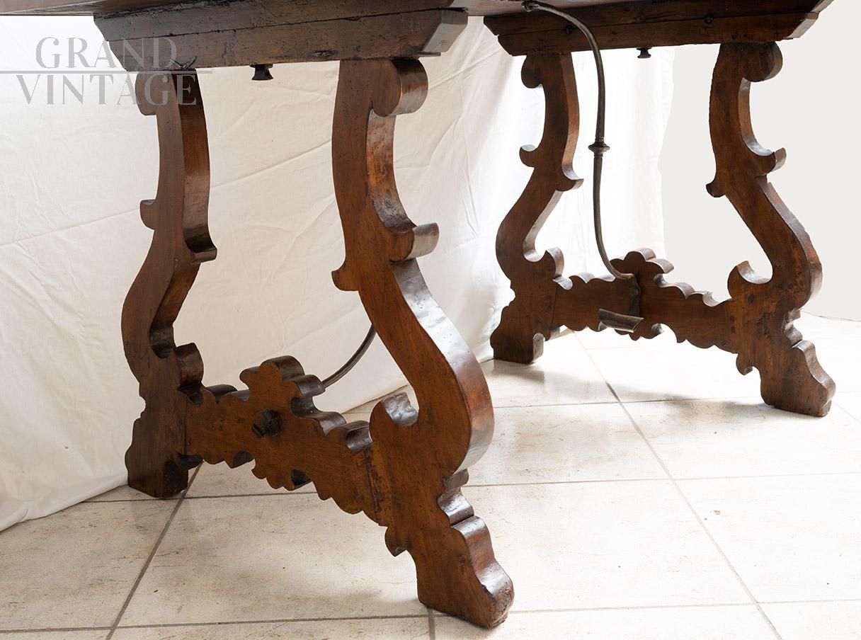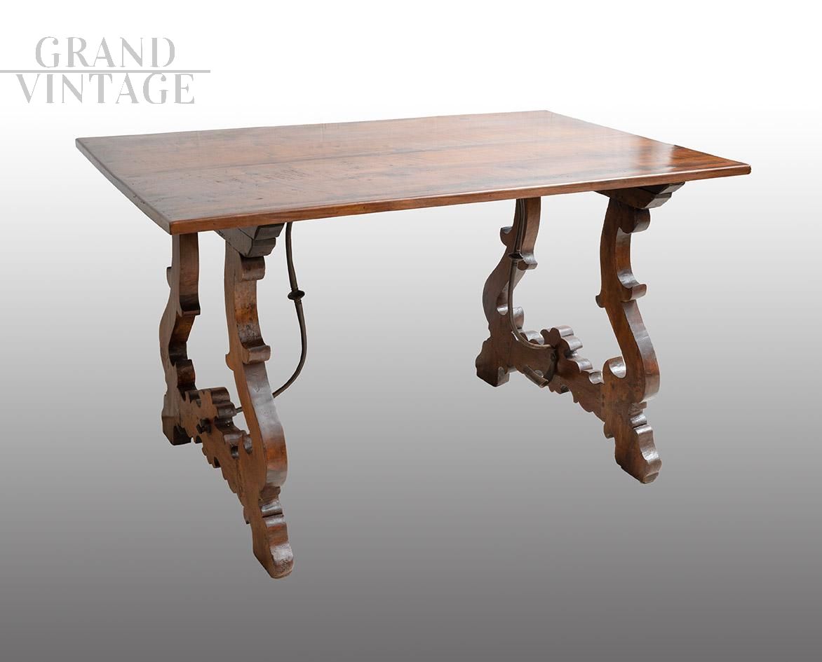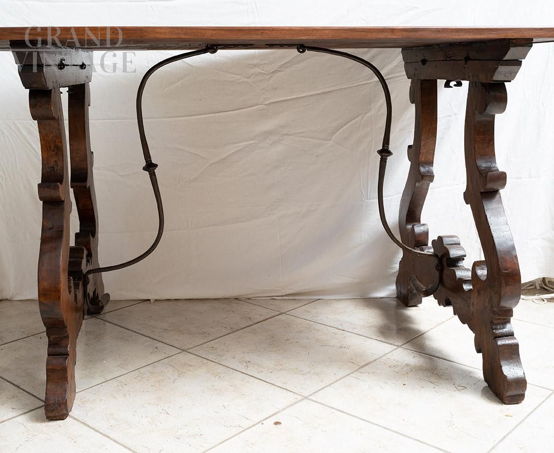 Tavolo fratino in massello di noce di provenienza napoletana appartenente agli inizi del XVIII secolo. Realizzato interamente in legno di noce massello finemente lavorato presenta un piano rettangolare semplice e robusto e poggia su due gambe a cavalletto riccamente sagomate con profili mossi e motivi ricurvi tipici dello stile di appartenenza. Le due gambe sono sono collegate tra loro mediante una barra di rinforzo in ferro forgiato arcuata aggiunta per garantire la stabilità strutturale.