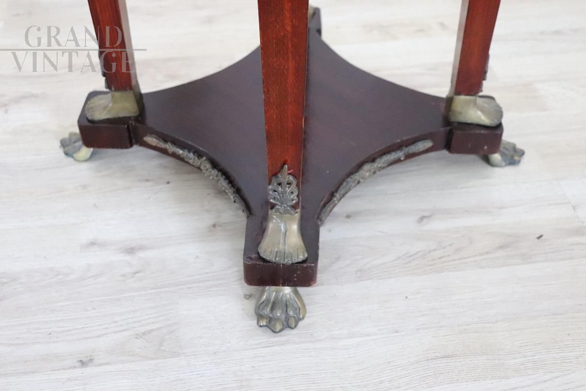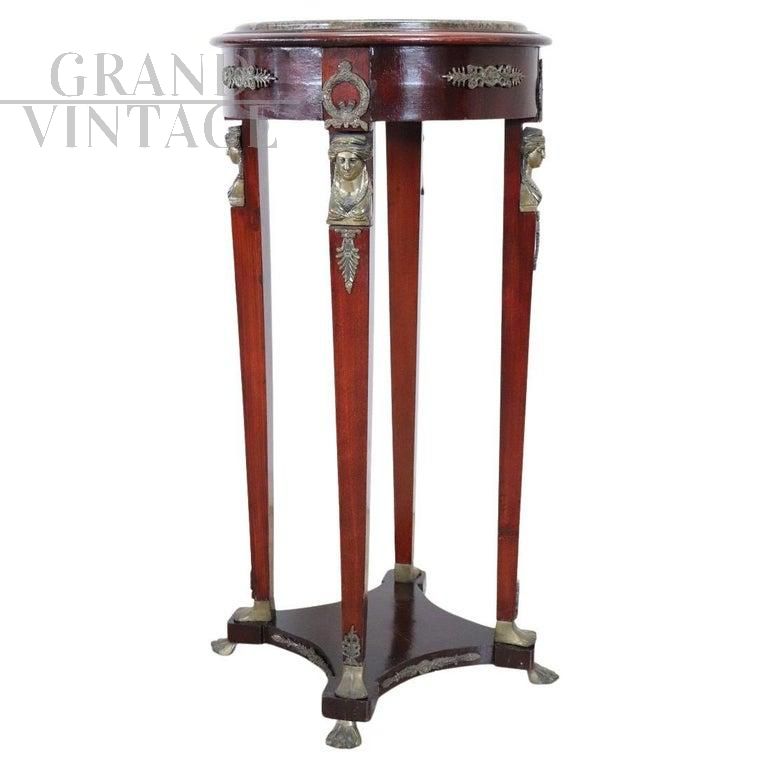 Realizzato in legno di mogano, la sua silhouette slanciata presenta lunghe gambe elegantemente affusolate che sostengono un piano rotondo in marmo verde oliva. I dettagli decorativi del tavolo sono davvero notevoli: decorazioni in bronzo dorato finemente cesellate adornano l'intera struttura, tra cui le affascinanti teste di Cariatidi che fungono da capitelli in cima a ciascuna gamba e gli intricati piedi a forma di zampa alla base. Questi elementi si uniscono per creare un pezzo scenografico. Funzionalmente versatile, questo tavolo è ideale come superficie espositiva per sculture, grandi vasi o ceramiche da collezione. Le condizioni del tavolo sono molto buone; Il bronzo ha sviluppato una splendida patina e i segni di usura sono coerenti con la sua età. Prezzo trattabile.