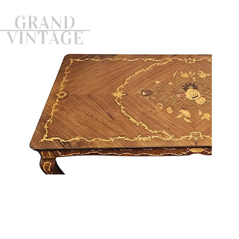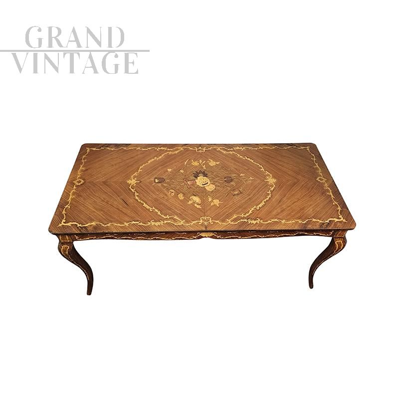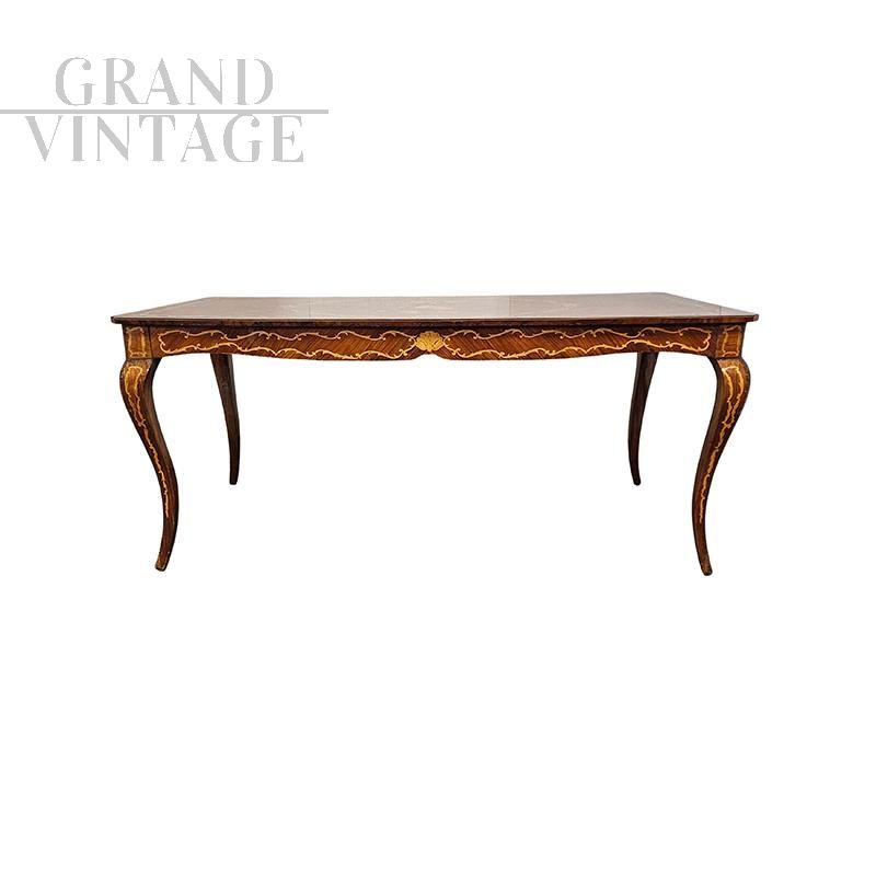 Tavolo in stile francese antico in legno di noce arricchito da preziosi intarsi floreali e gambe mosse, realizzato nella prima metà del '900.