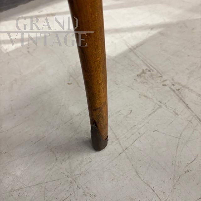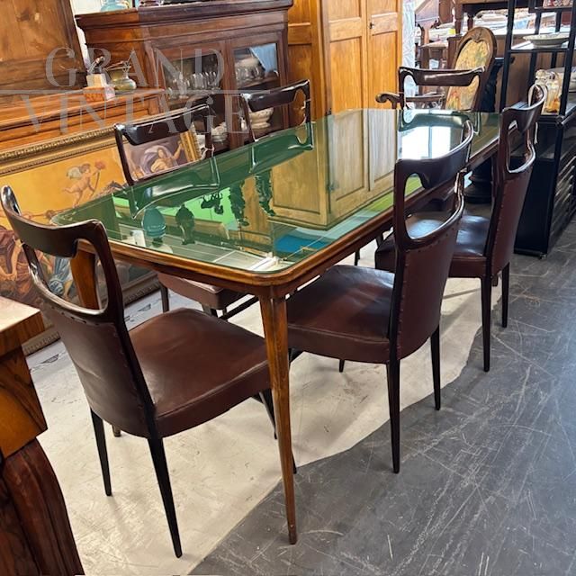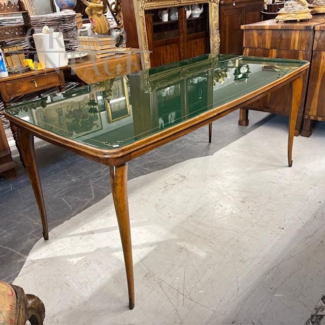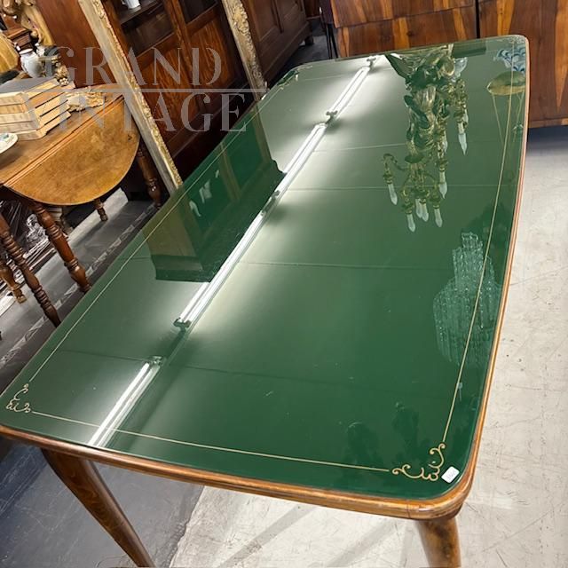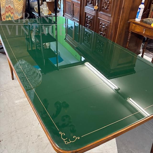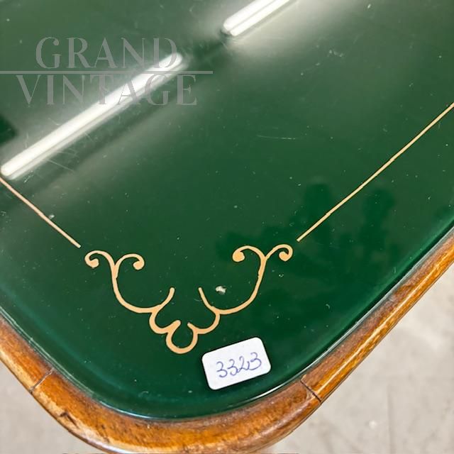 Tavolo classico di modernariato italiano anni '60 con piano in vetro dipinto verde con decoro ai bordi, restaurato.