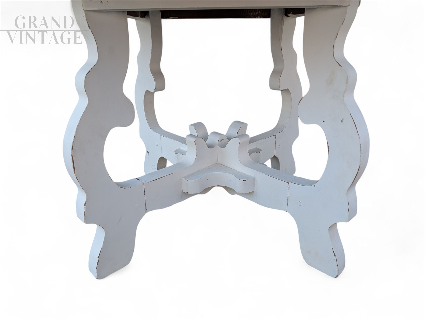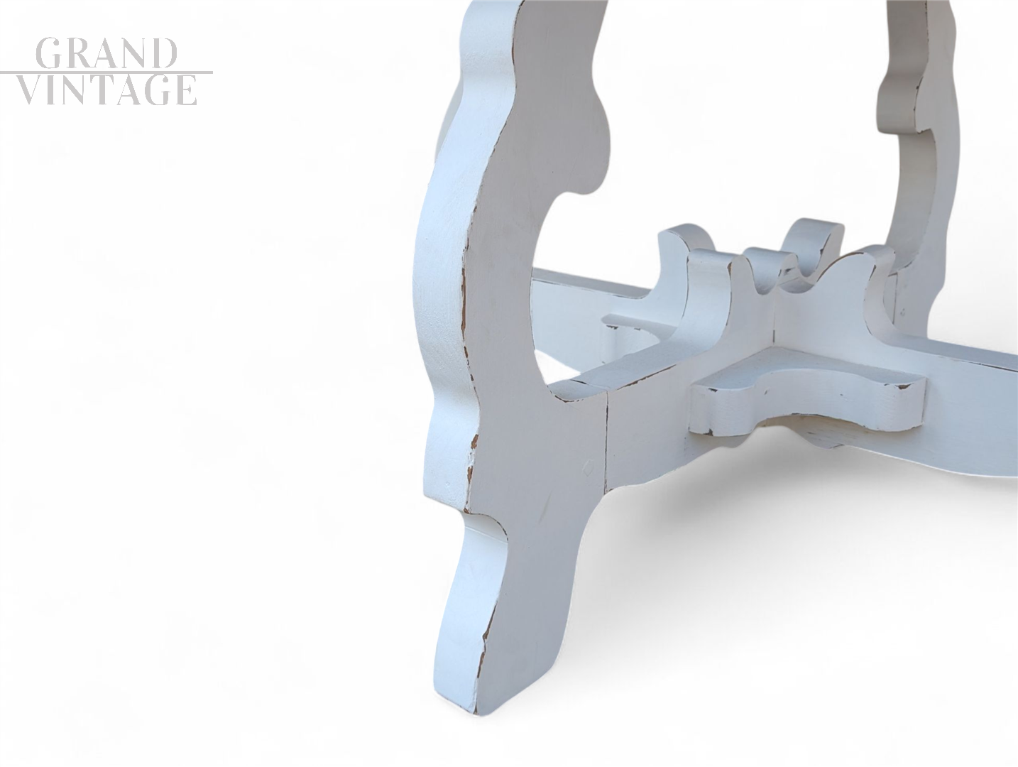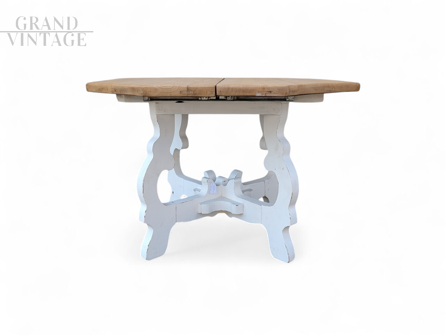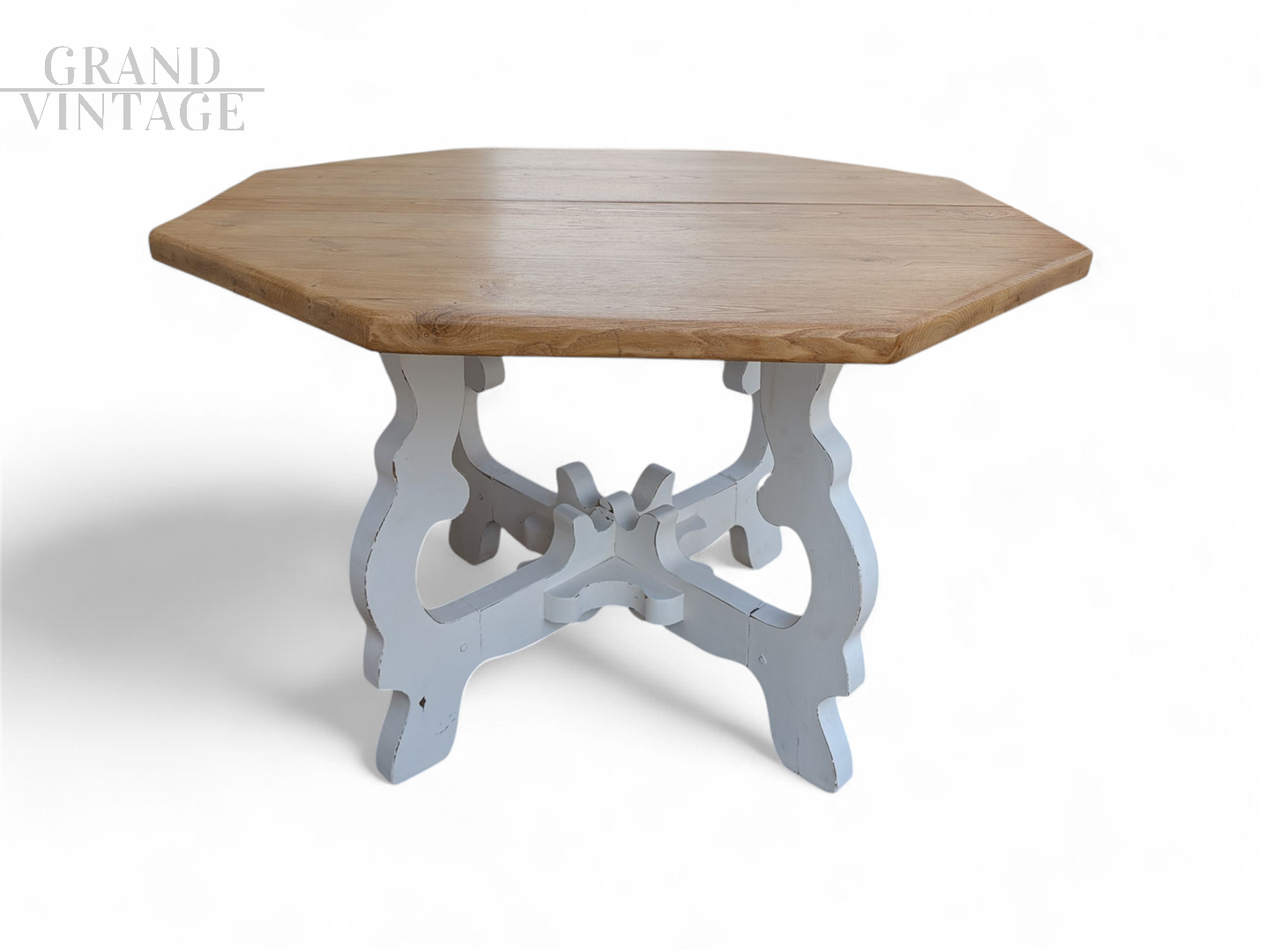 Tavolo da salotto dal design essenziale ma ricco di personalità, con piano ottagonale realizzato in legno massello di castagno, apprezzato per la sua durabilità e le calde venature naturali. La base, scolpita a mano con una silhouette sagomata a incrocio, è rifinita in bianco decapato, conferendo al pezzo un raffinato effetto vissuto. Un tavolo artigianale che unisce matericità autentica e stile rustico-contemporaneo, ideale per ambienti accoglienti, creativi o country chic.