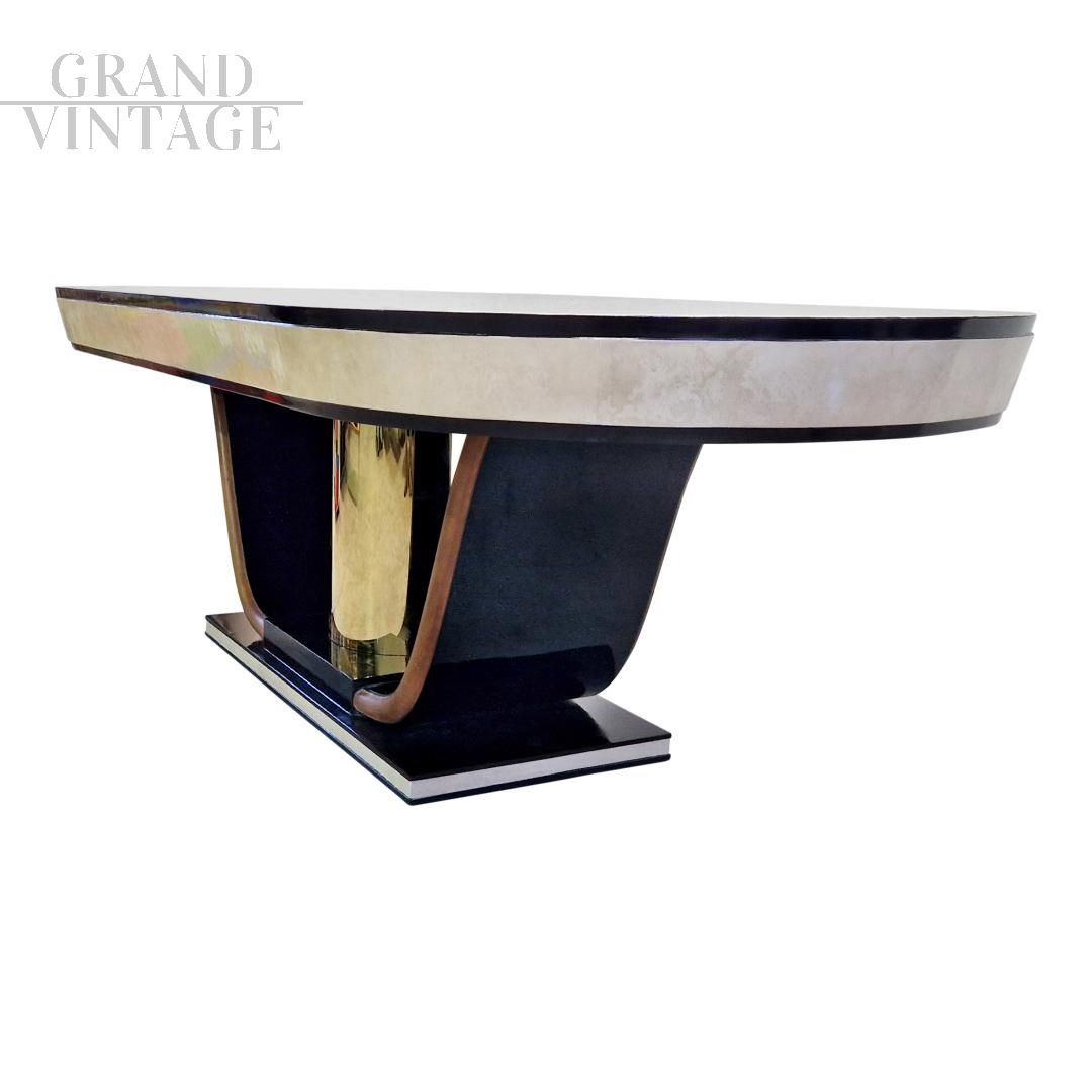 Grande tavolo ovale di linea Art Déco con struttura in legno con laccatura nera su base e profili, piano in pergamena naturale e cilindro centrale in metallo dorato.