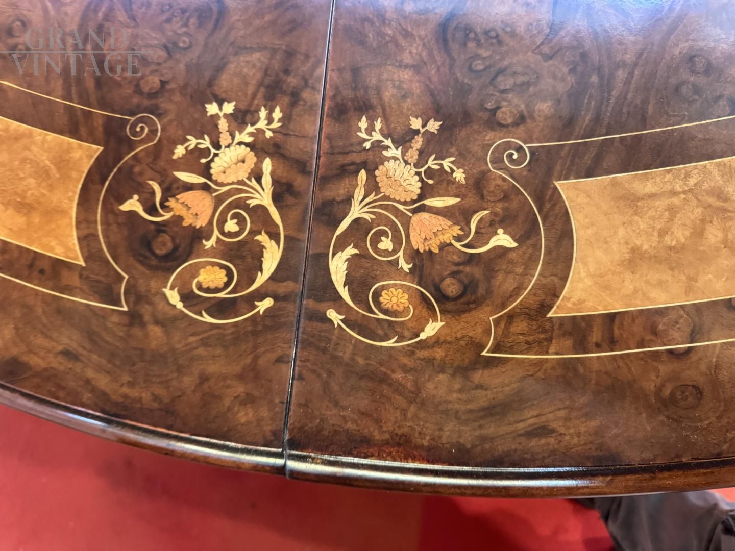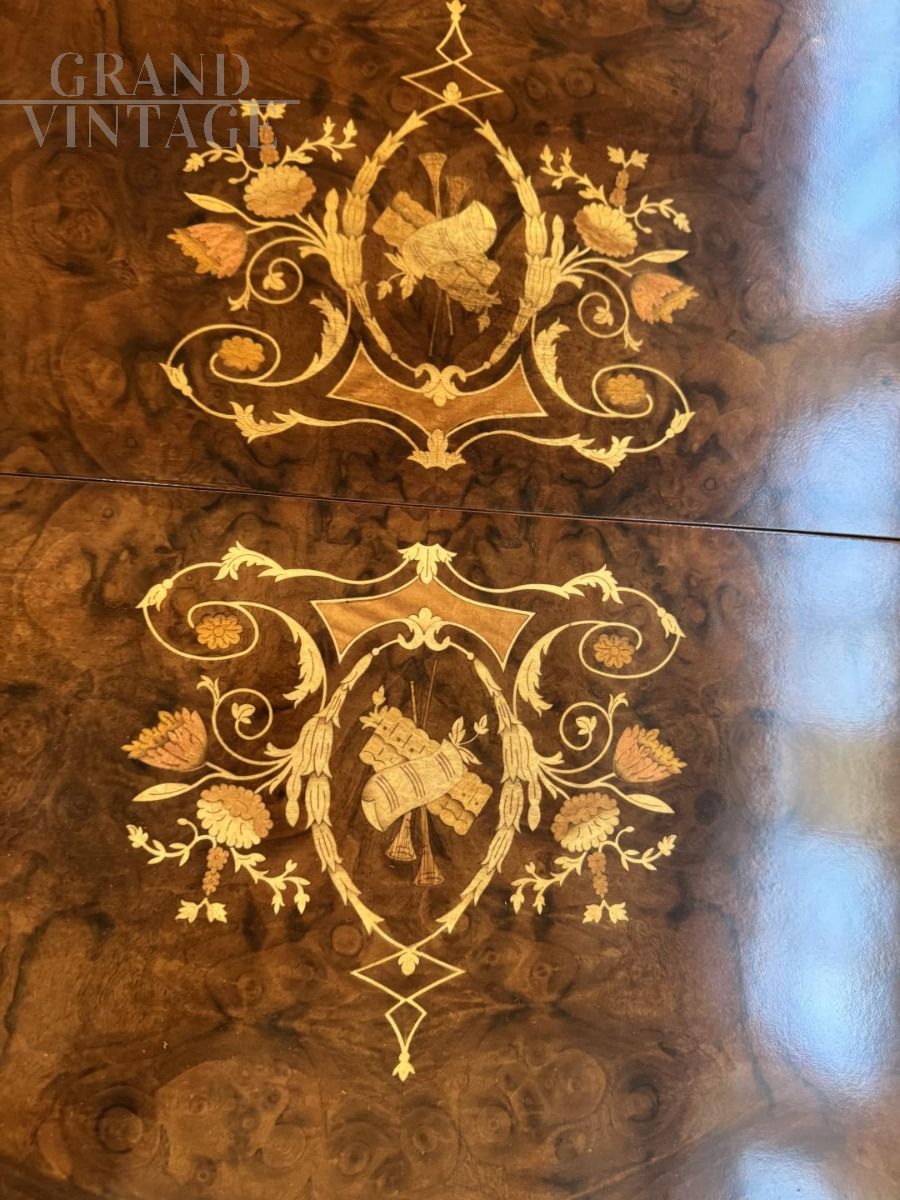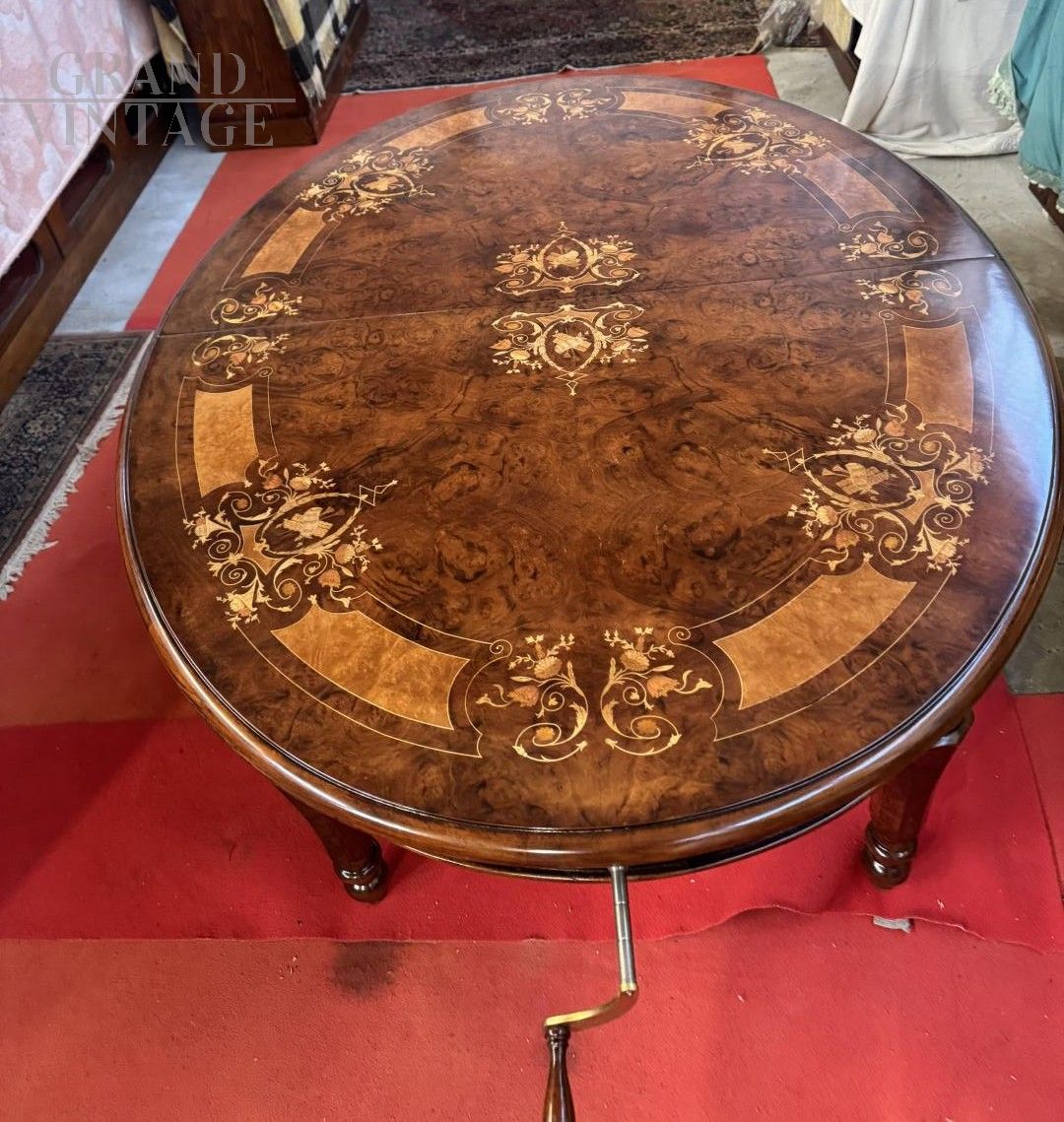 Stupendo tavolo allungabile a manovella in legno di noce intarsiato a motivi floreali e musichieri in legno di acero fiorito, bosso, bois de rose e violette in perfette condizioni con 3 allunghe, proveniente da villa palladiana del Veneto.
