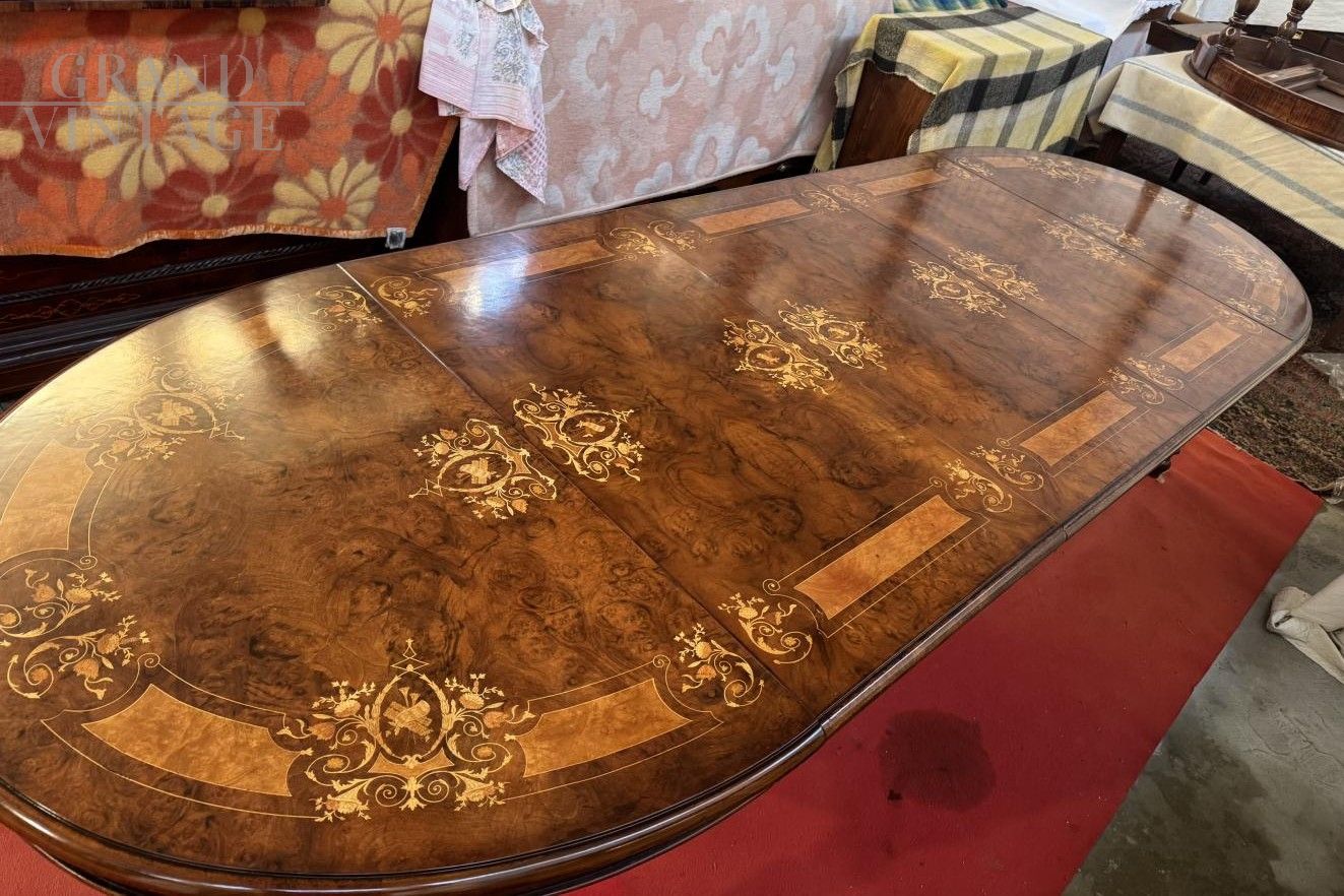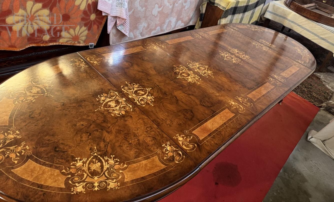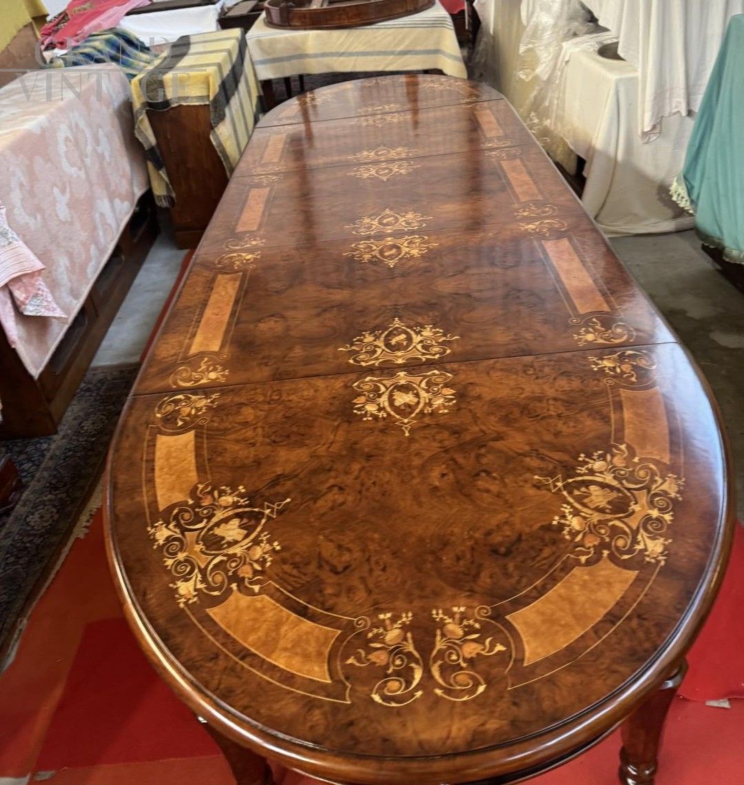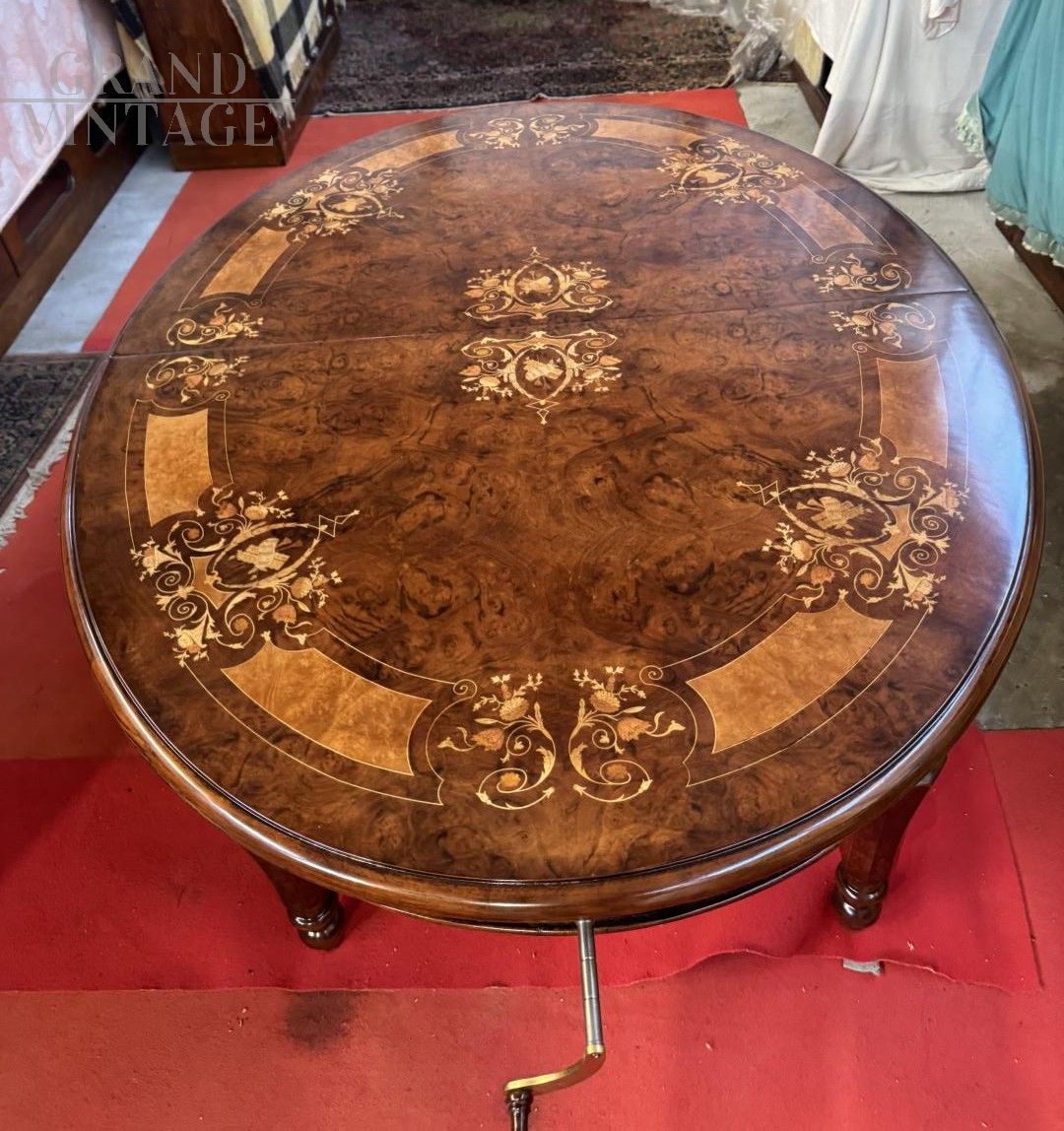 Stupendo tavolo allungabile a manovella in legno di noce intarsiato a motivi floreali e musichieri in legno di acero fiorito, bosso, bois de rose e violette in perfette condizioni con 3 allunghe, proveniente da villa palladiana del Veneto.