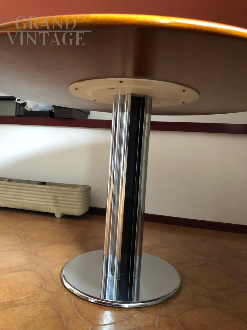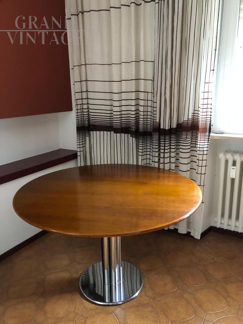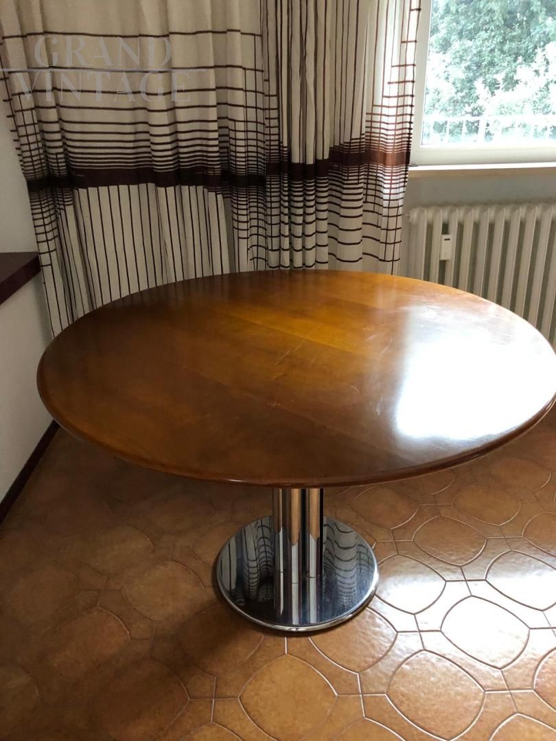 Tavolo vintage modello Maxine rotondo con struttura in acciaio e piano in noce del diametro di 120 cm, ricorda il modello Marcuso di Zanotta o il modello Esse di Acerbis, in buone condizioni. La base ha un diametro di 44 cm. Si consiglia l'acquisto combinato con il set di sedie Castiglia di Zanotta, acquistato in abbinamento. Clicca qui per vedere le sedie!