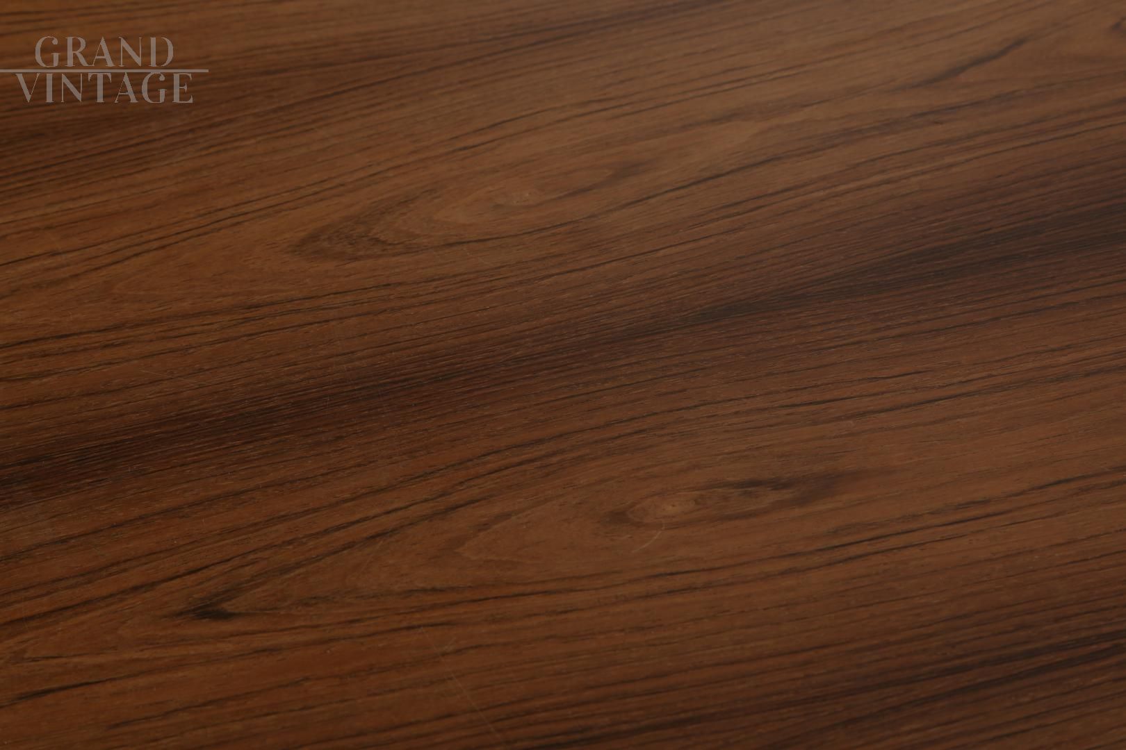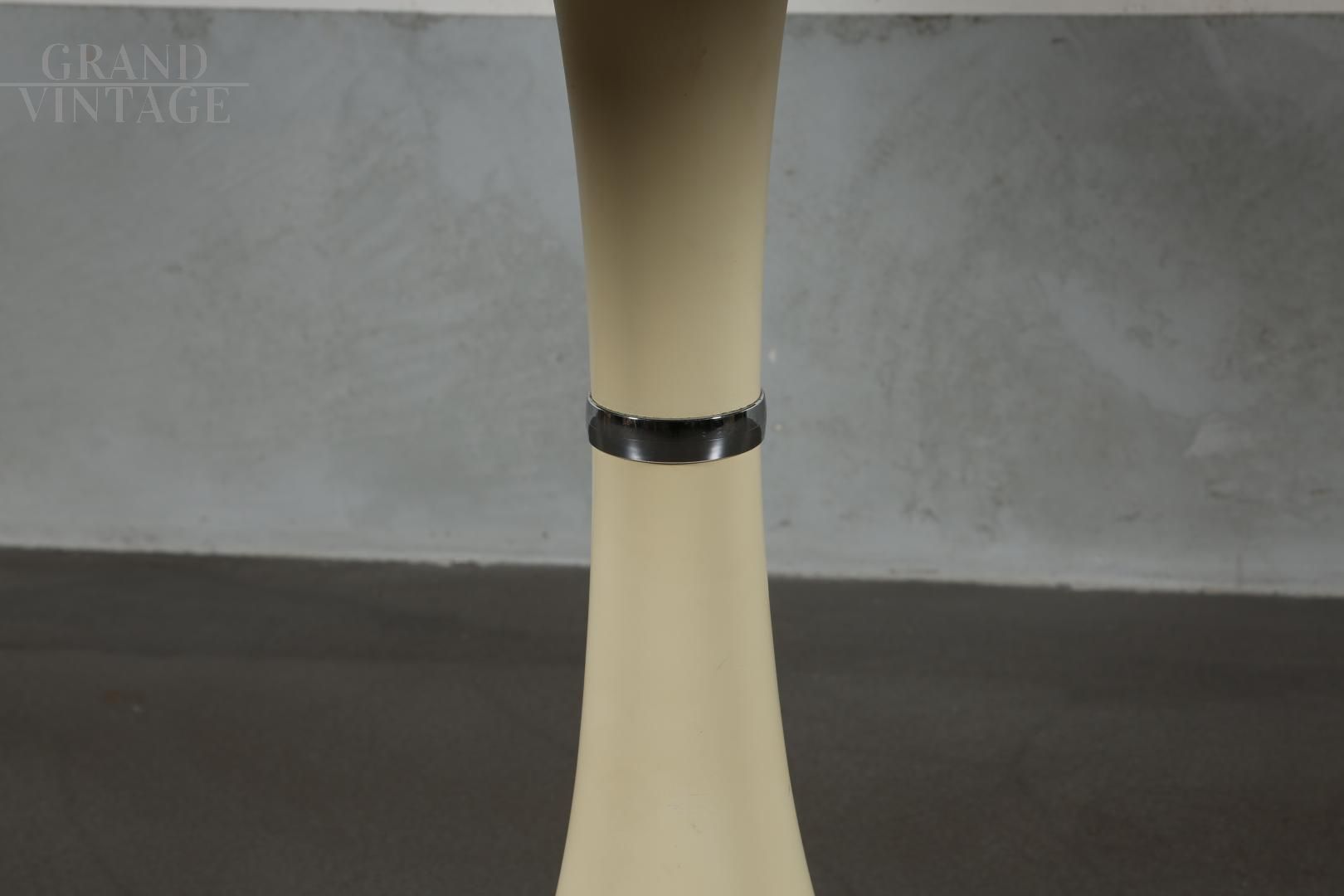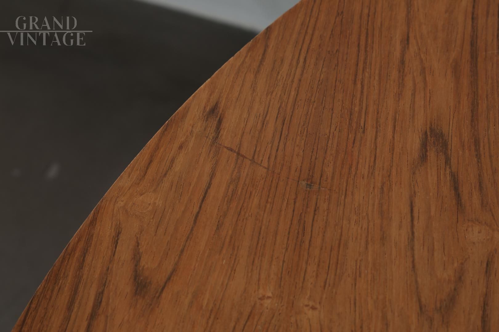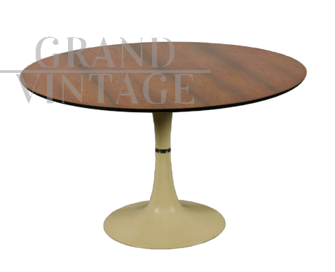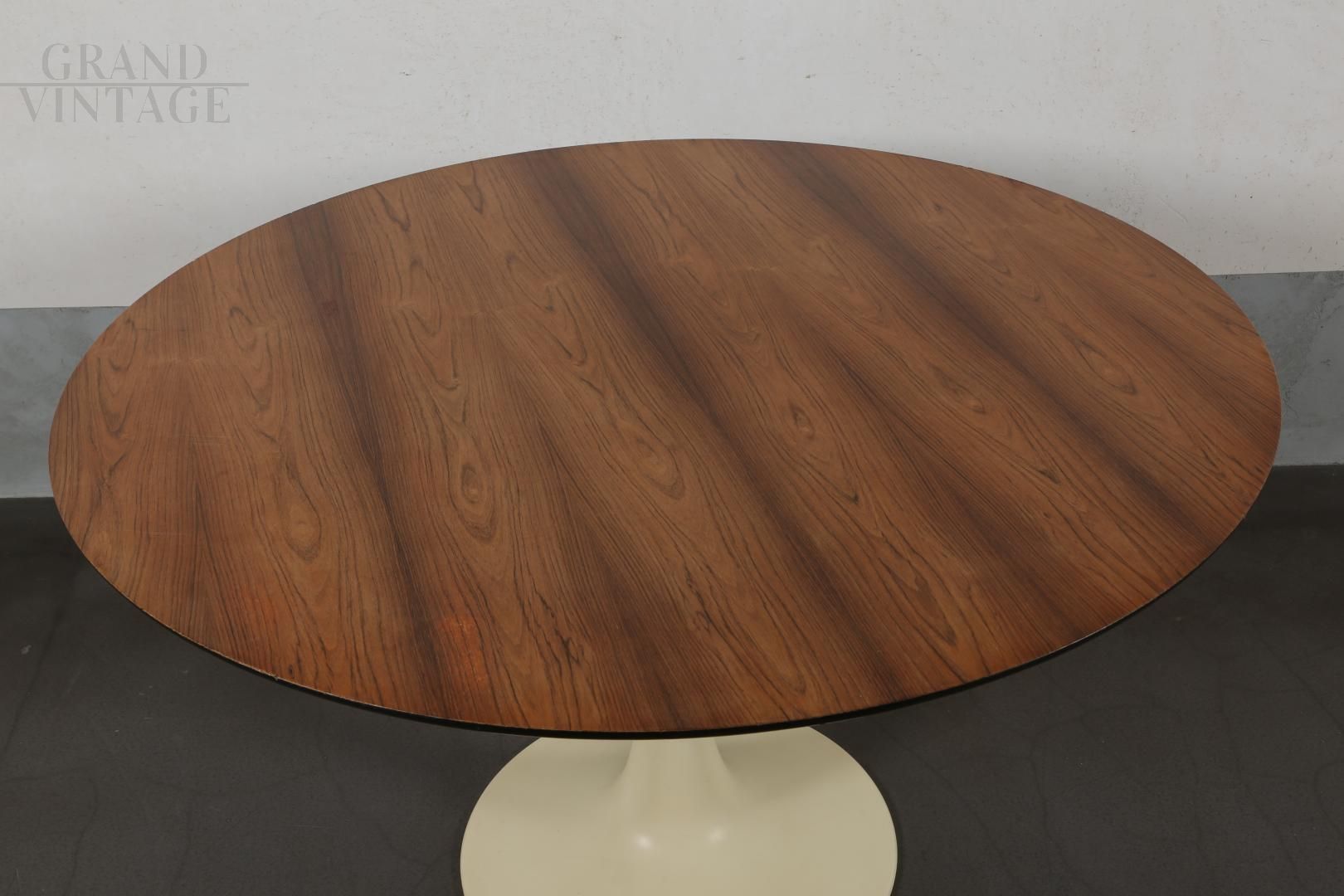 Tavolo rotondo con piede a tulipano prodotto dalla Grosfillex France nel 1971, con piano in legno di palissandro chiaro. Presenta dei piccoli difetti sul bordo e sul piano, come evidenziato nelle foto.