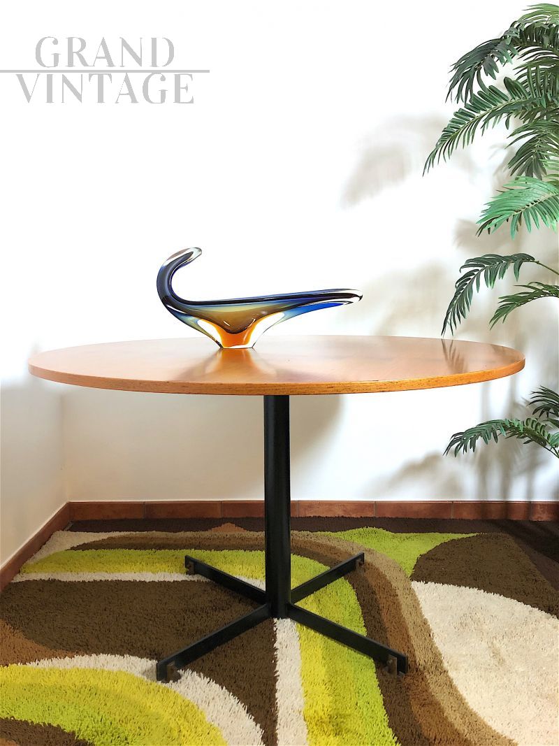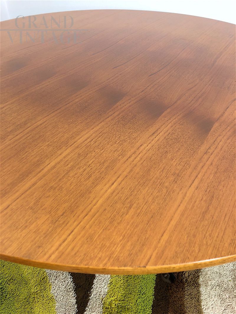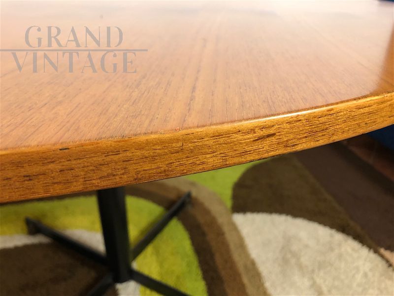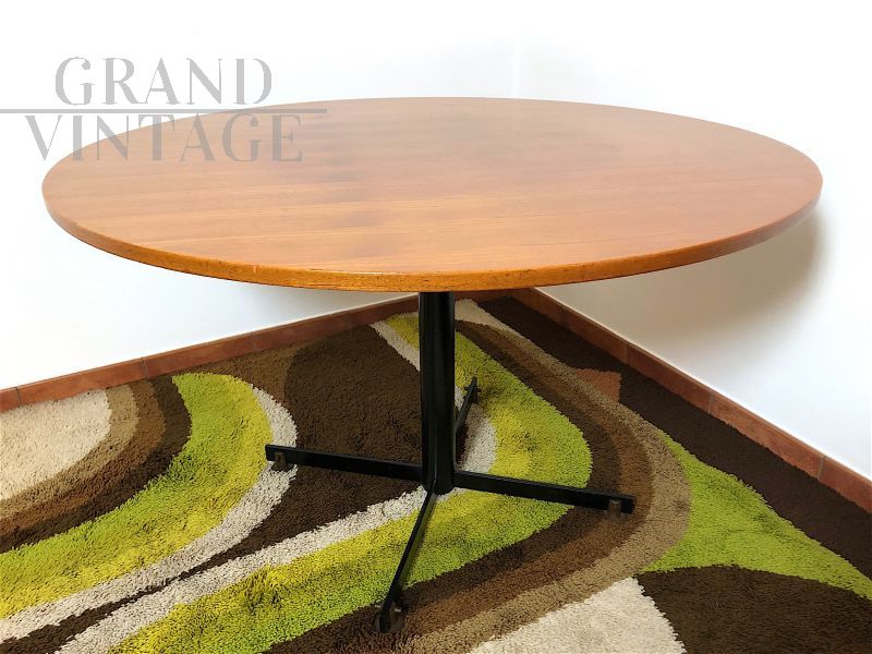 Tavolo vintage anni 60 Made in Italy, un pezzo iconico del design di qualità, caratterizzato da linee essenziali e materiali selezionati. Il piano è circolare e realizzato in legno con una splendida impiallacciatura in teak, che dona eleganza e calore all'ambiente. La struttura in metallo nero conferisce al tavolo un look moderno e minimalista, mentre la base a quattro razze garantisce stabilità e leggerezza. Un elemento distintivo di questo tavolo sono i piedi in ottone, impreziositi da un motivo decorativo unico che aggiunge un tocco di sofisticata eleganza. In condizioni perfette!